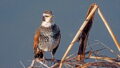 柏尾川沿いの犬走り、対岸にはイソヒヨドリ♀、手前にはイソヒヨドリ♂がタクアンを前に思案顔
