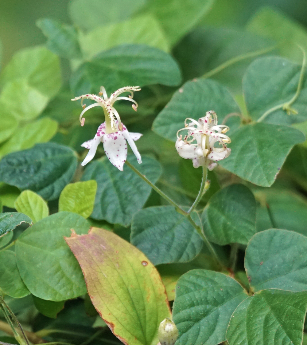 近くに、ヤマホトトギスの花も。 ヤブマメの葉に半分隠れて、ひっそり咲いていました。