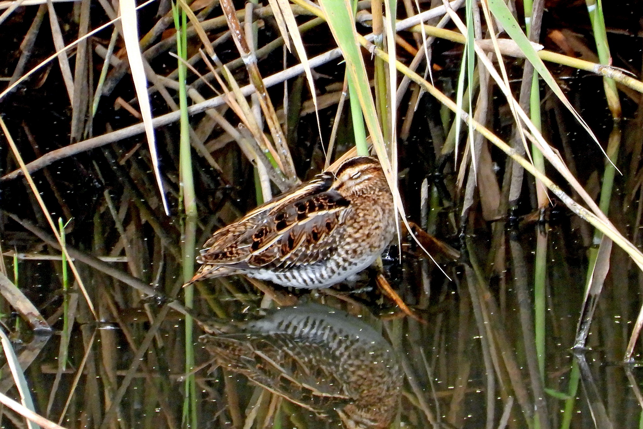 葦原の根本付近に「タシギ」がうずくまってます。