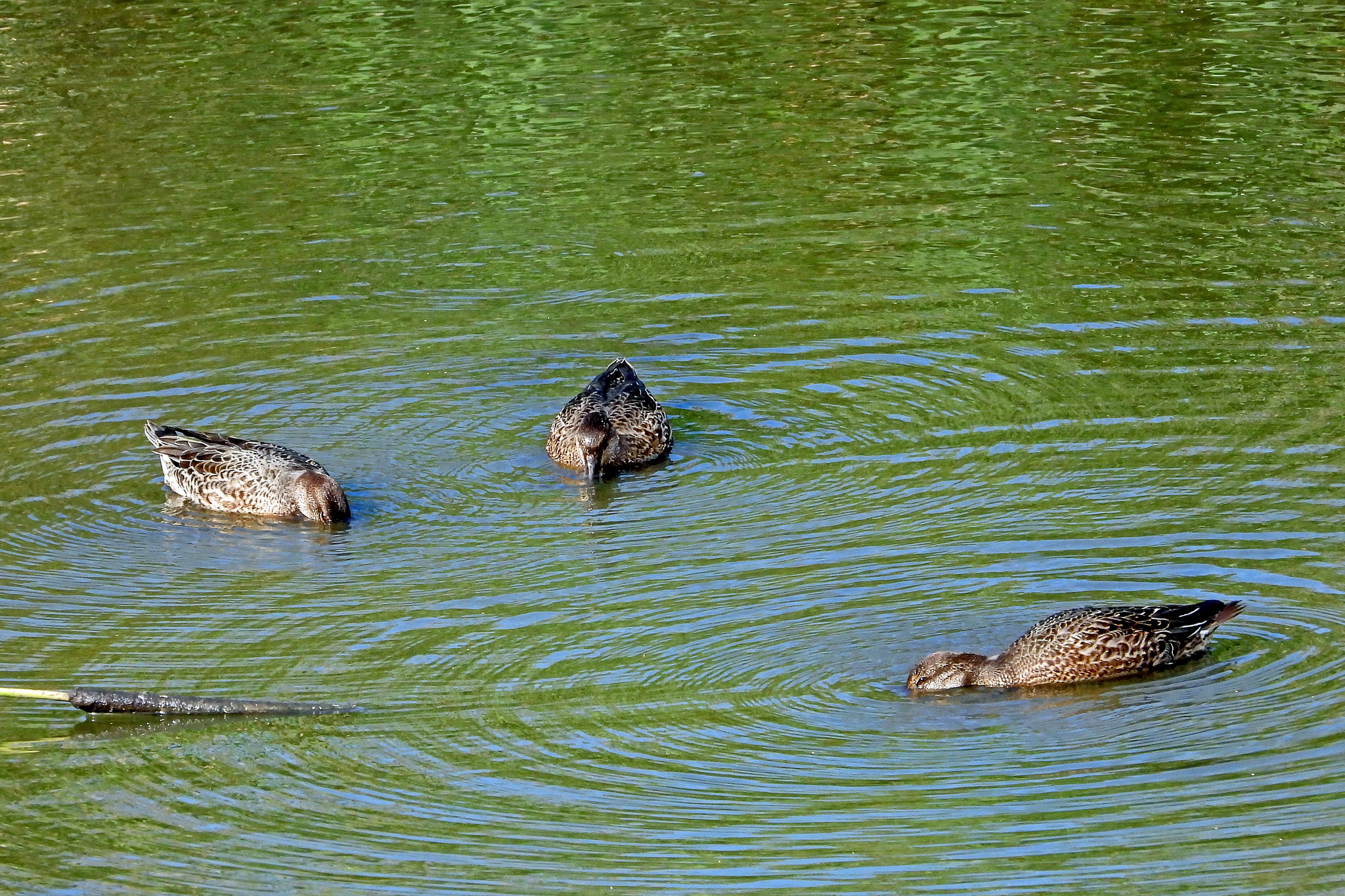 水没した湿地帯で、「コガモ」が食事中でした。