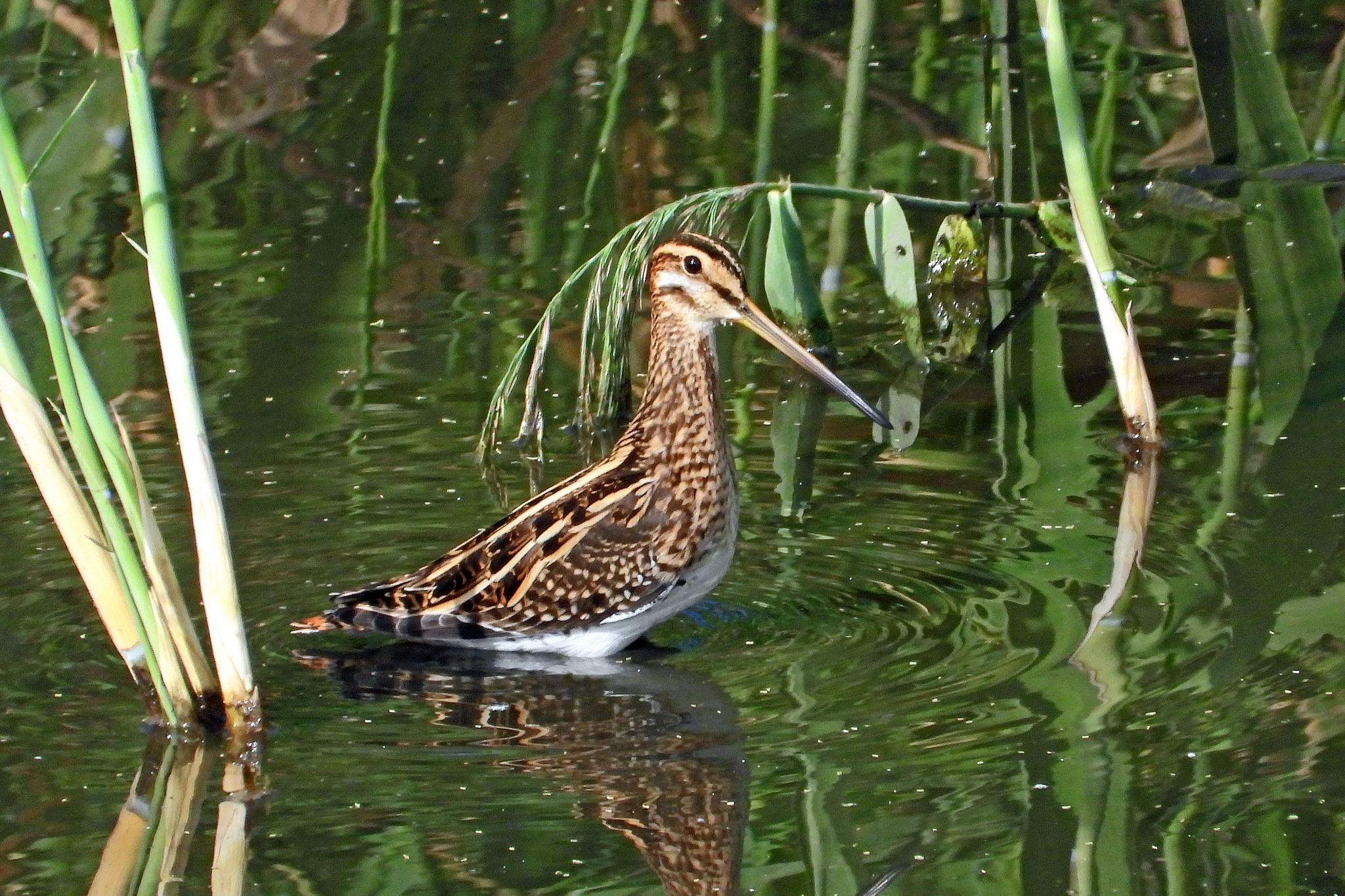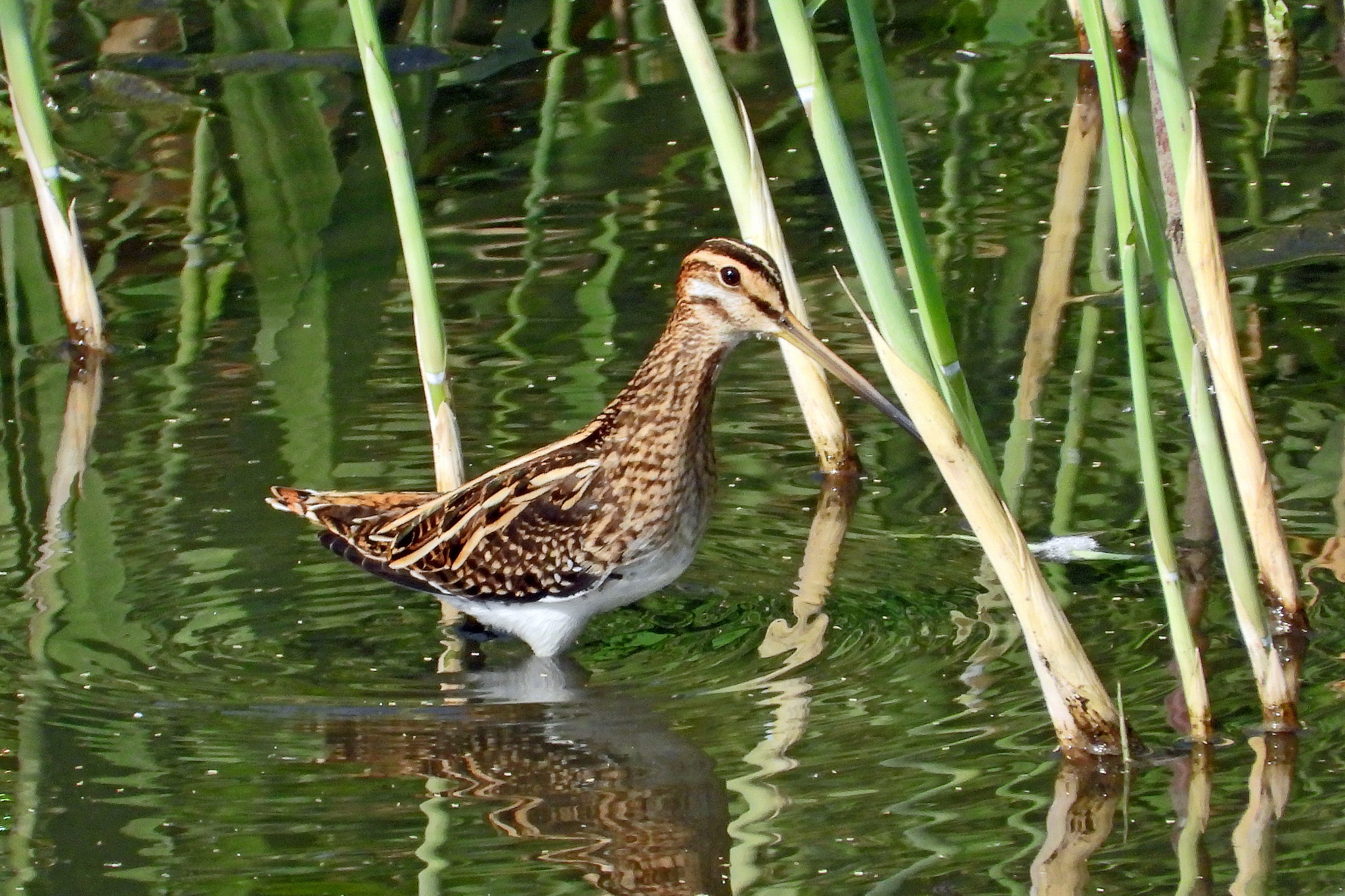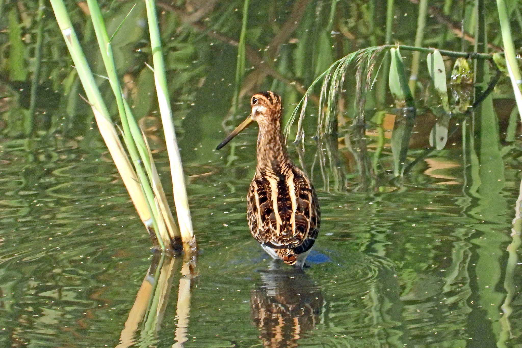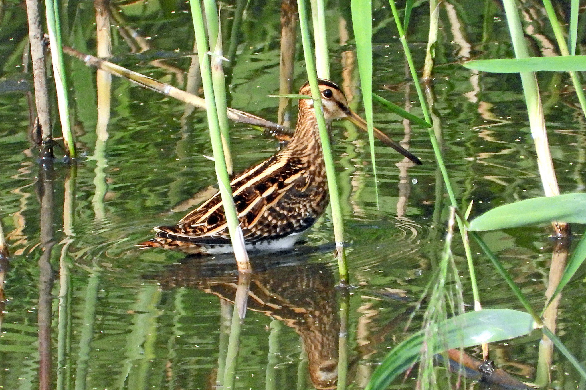 おっ、水没した湿地帯で「タシギ」が食事をしてました。