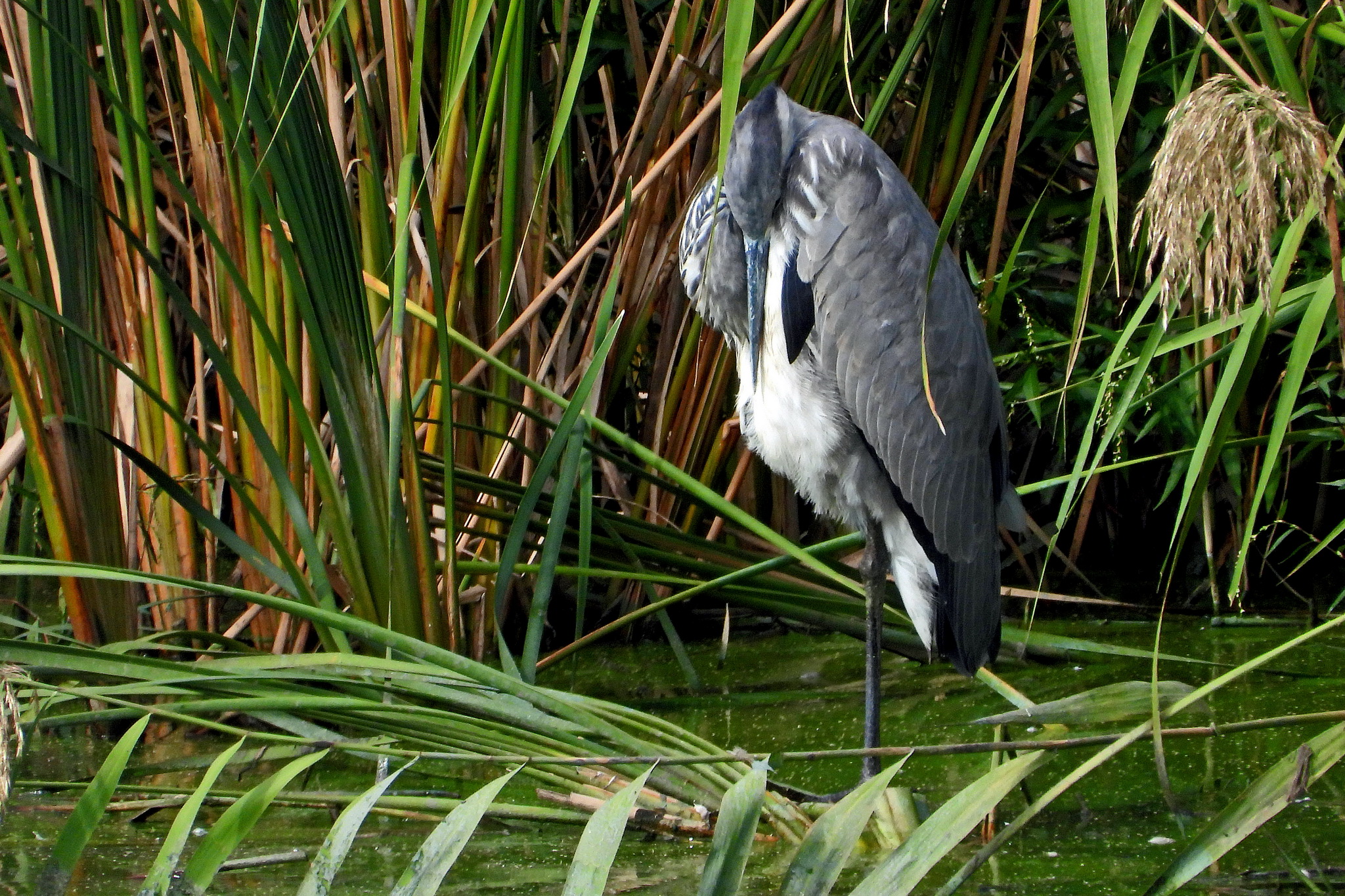 遊水地の向こう岸の葦原に「アオサギ」がうずくまってました。
