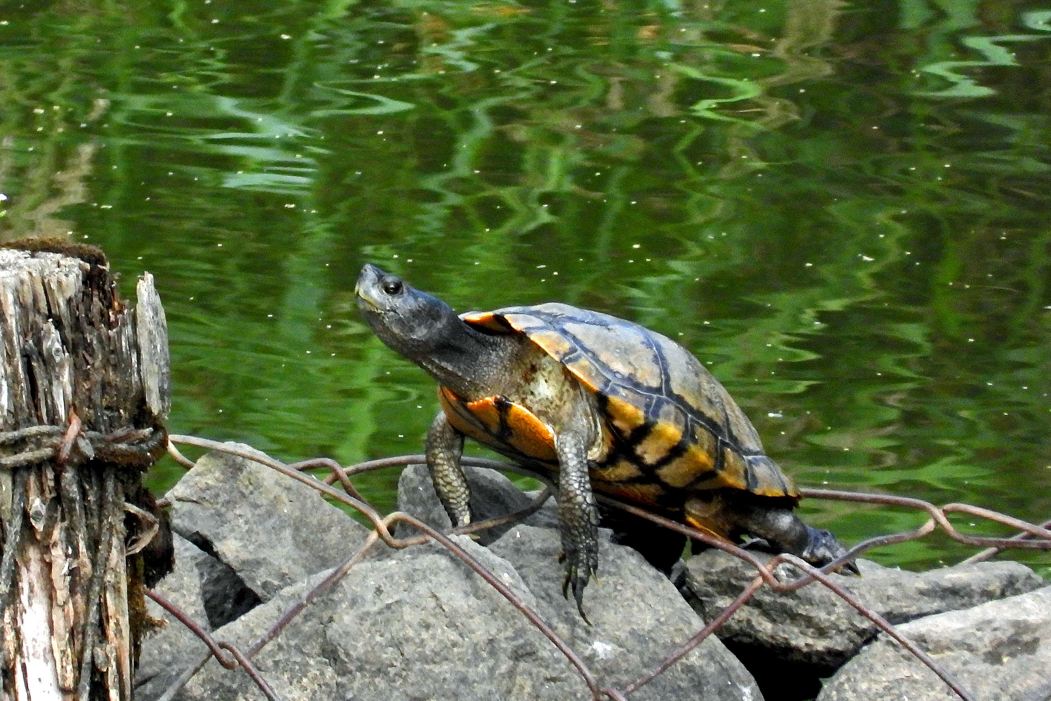 石組みに黒化した「ミシシッピアカミミガメ」が居ました。