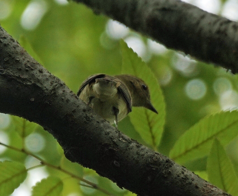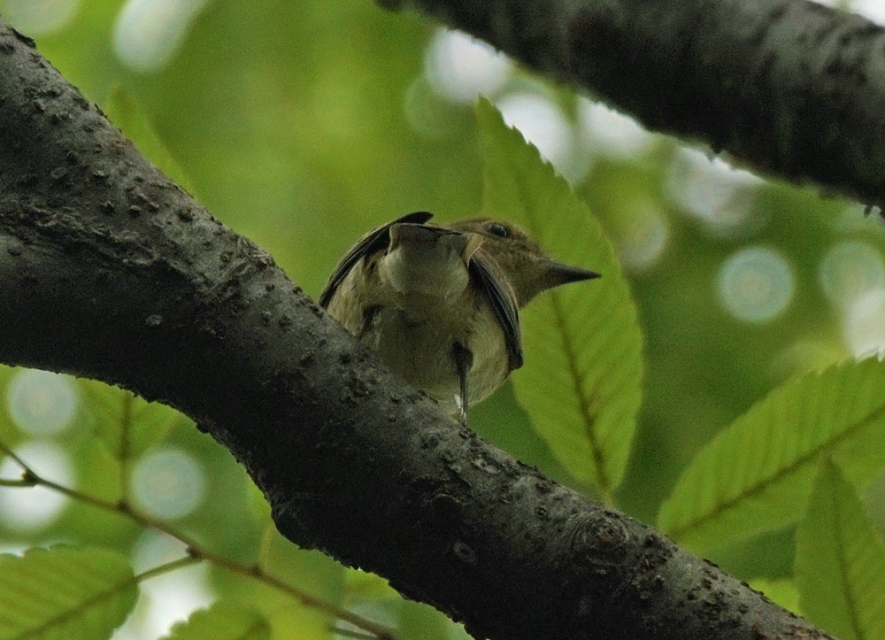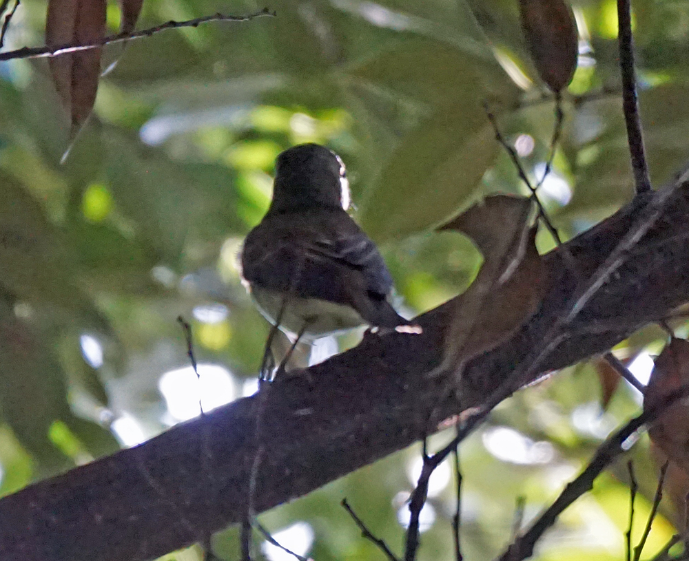 渡りの鳥はダメかな、と思っている時に、何やらヒタキらしい鳥が暗い枝に。 すぐに見失ってしまい、撮れたのはこんな、ボケボケの後ろ姿だけですが、コサメビタキのようでした。