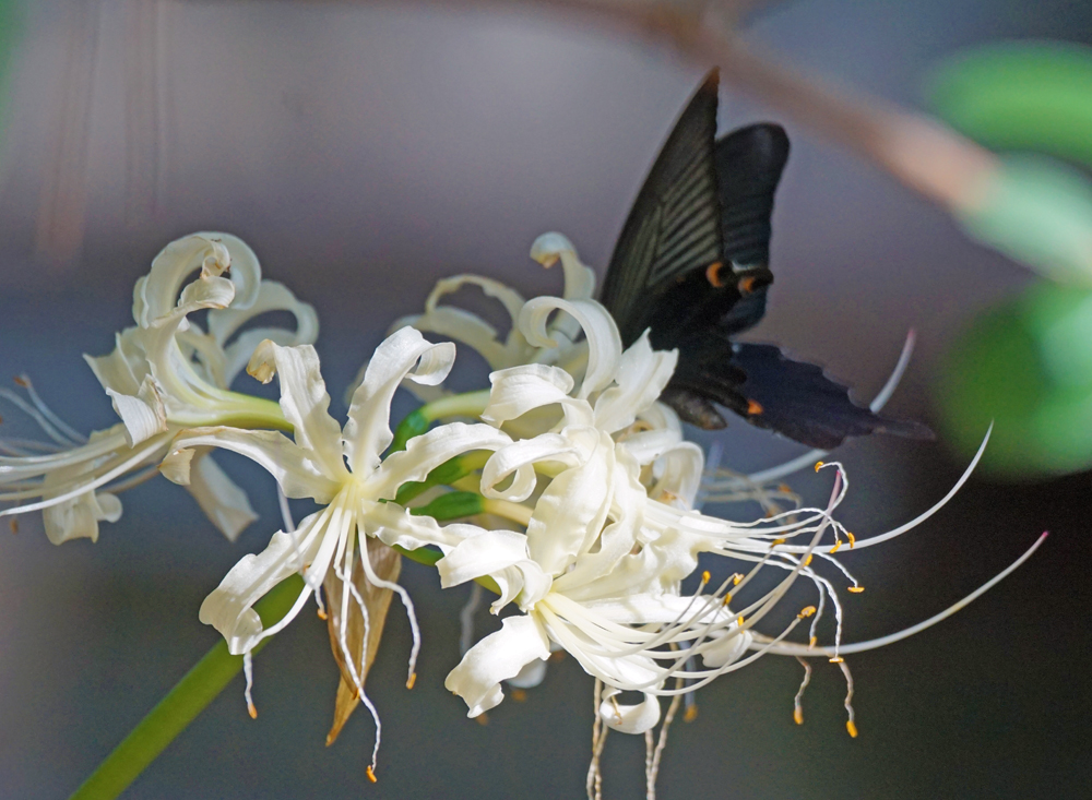白いヒガンバナの花にクロアゲハが飛んで来て吸蜜