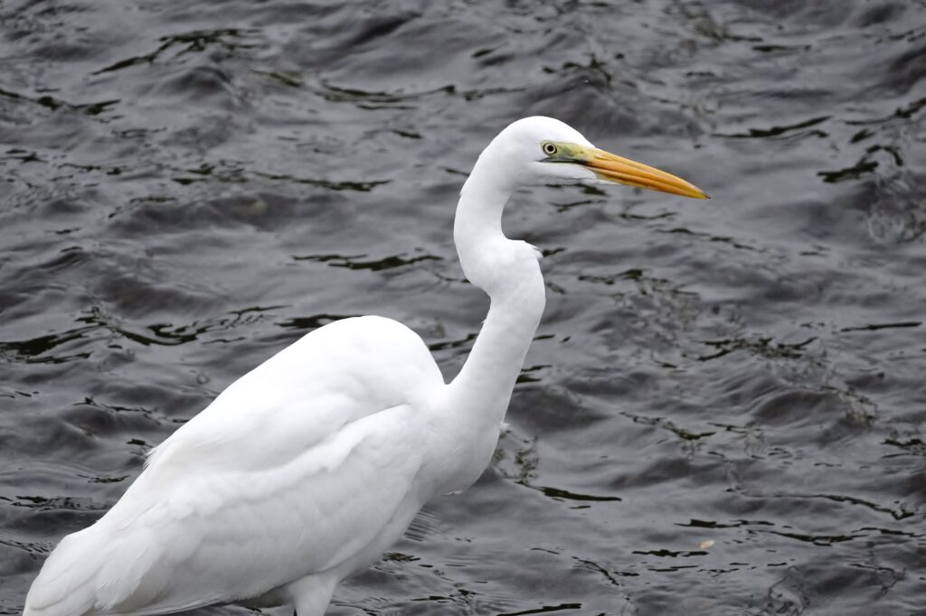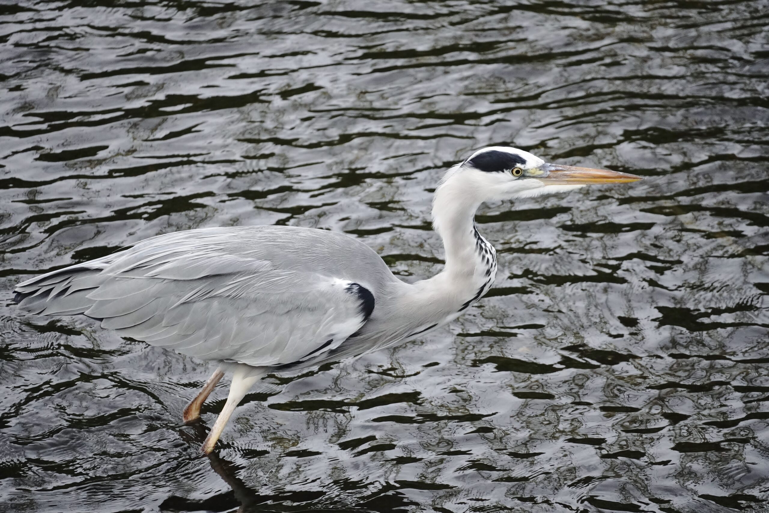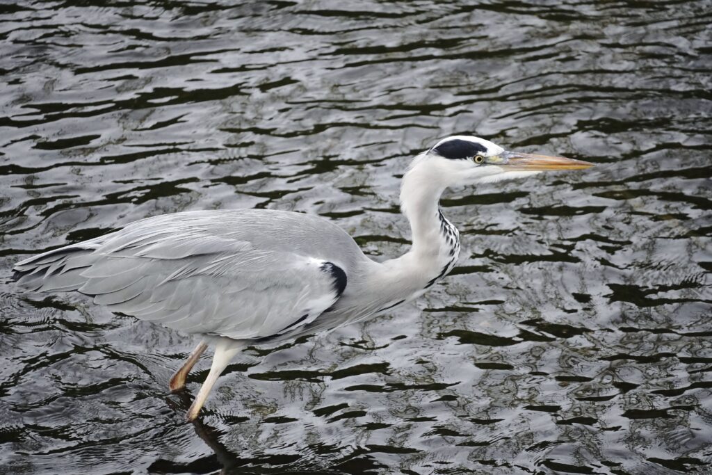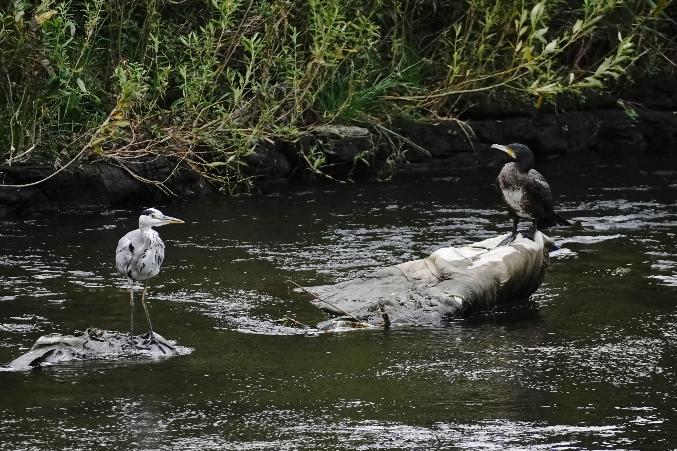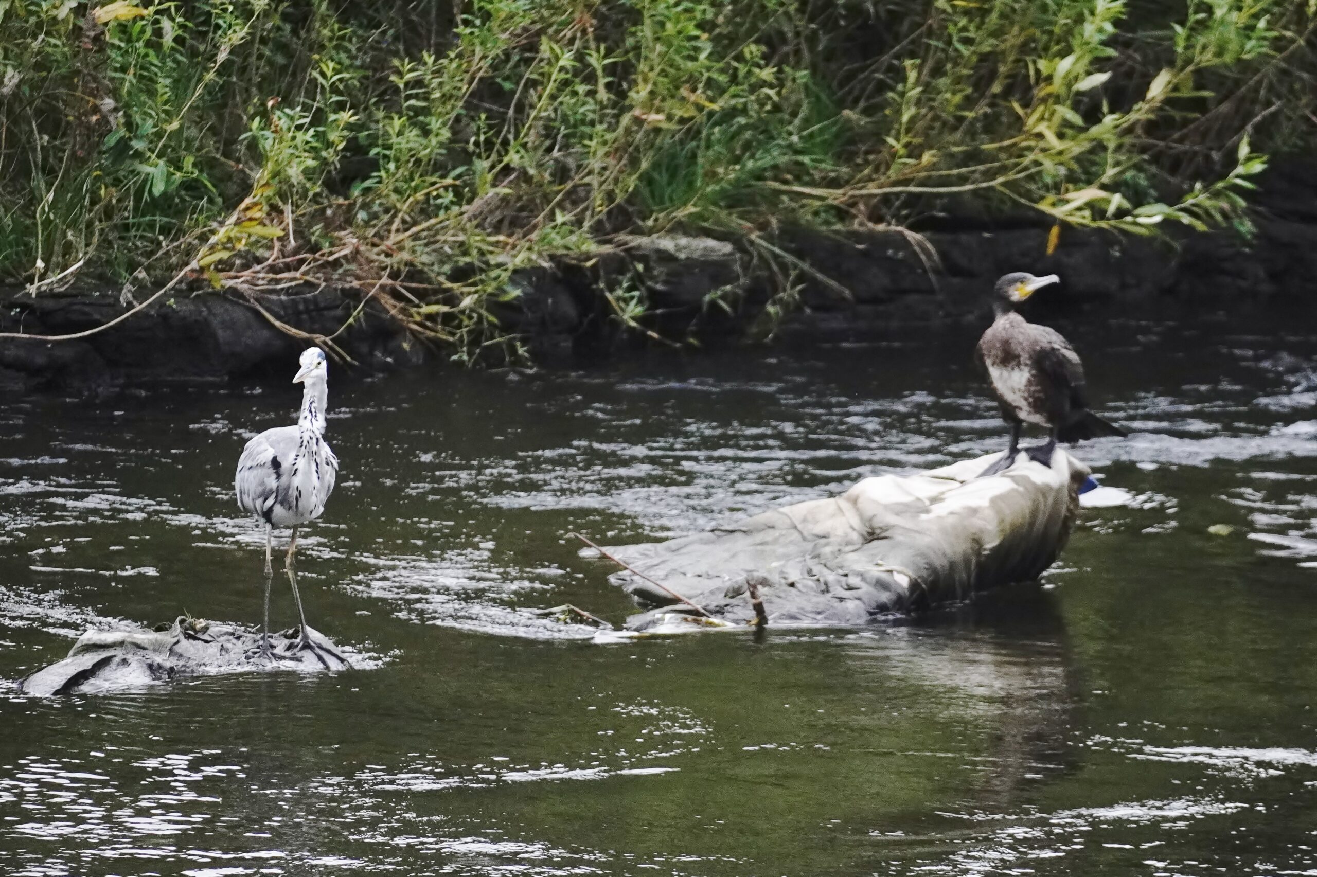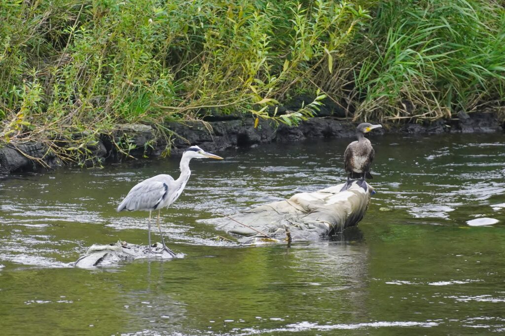 公園内の川には アオサギとカワウがお互いにそっぽを向いていました
