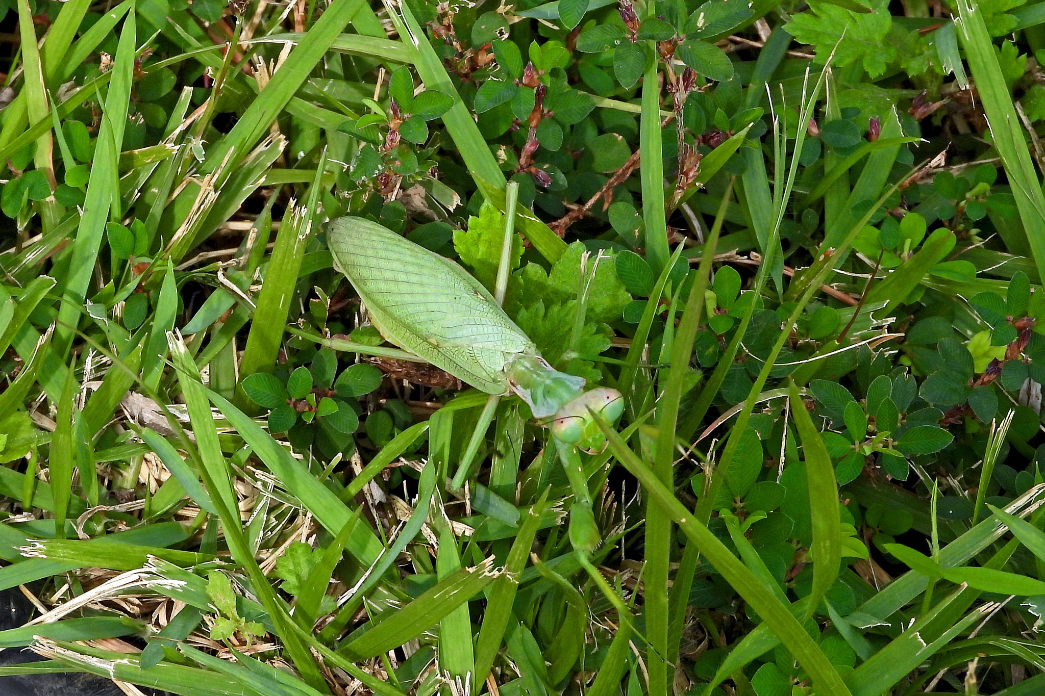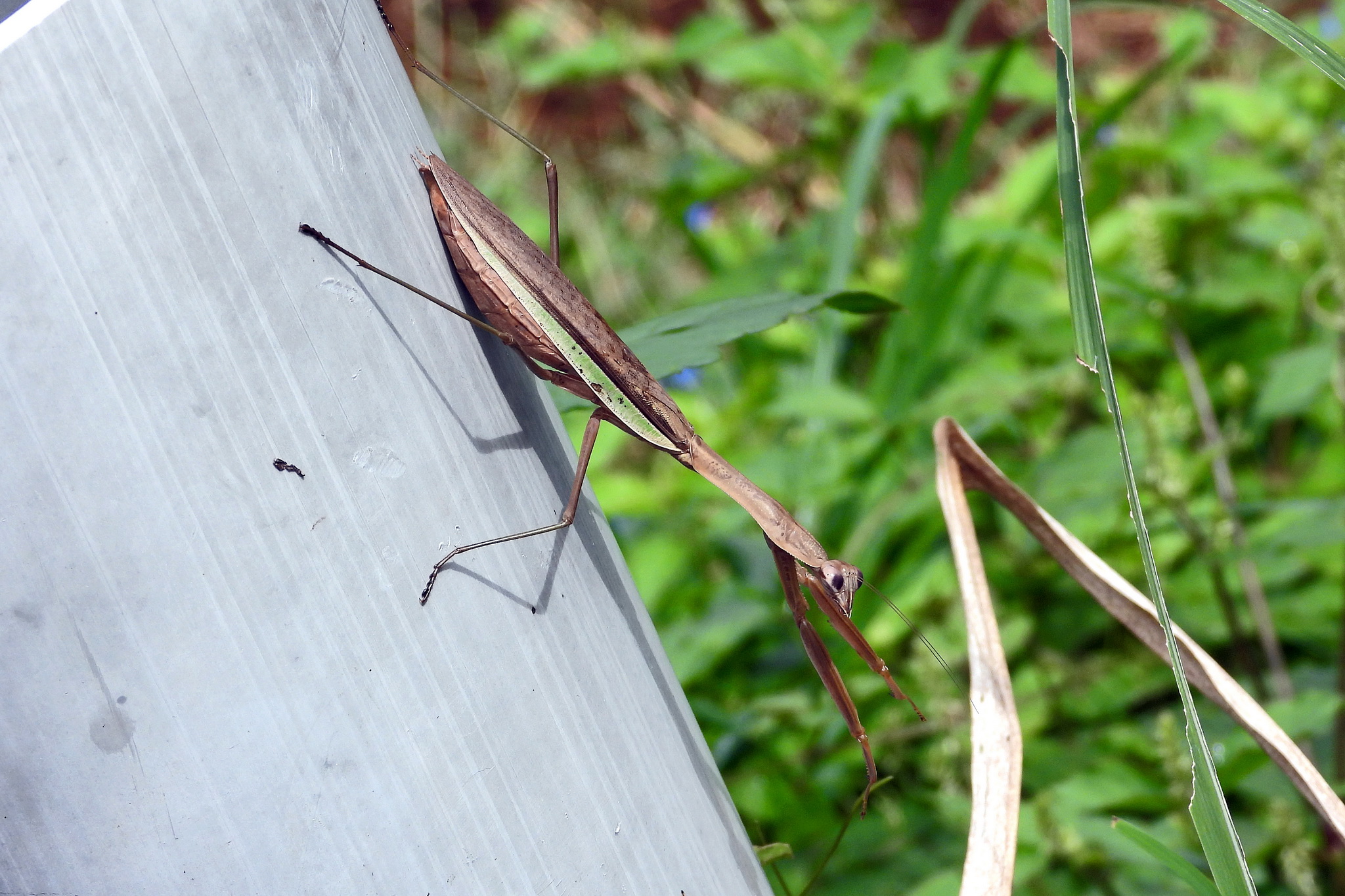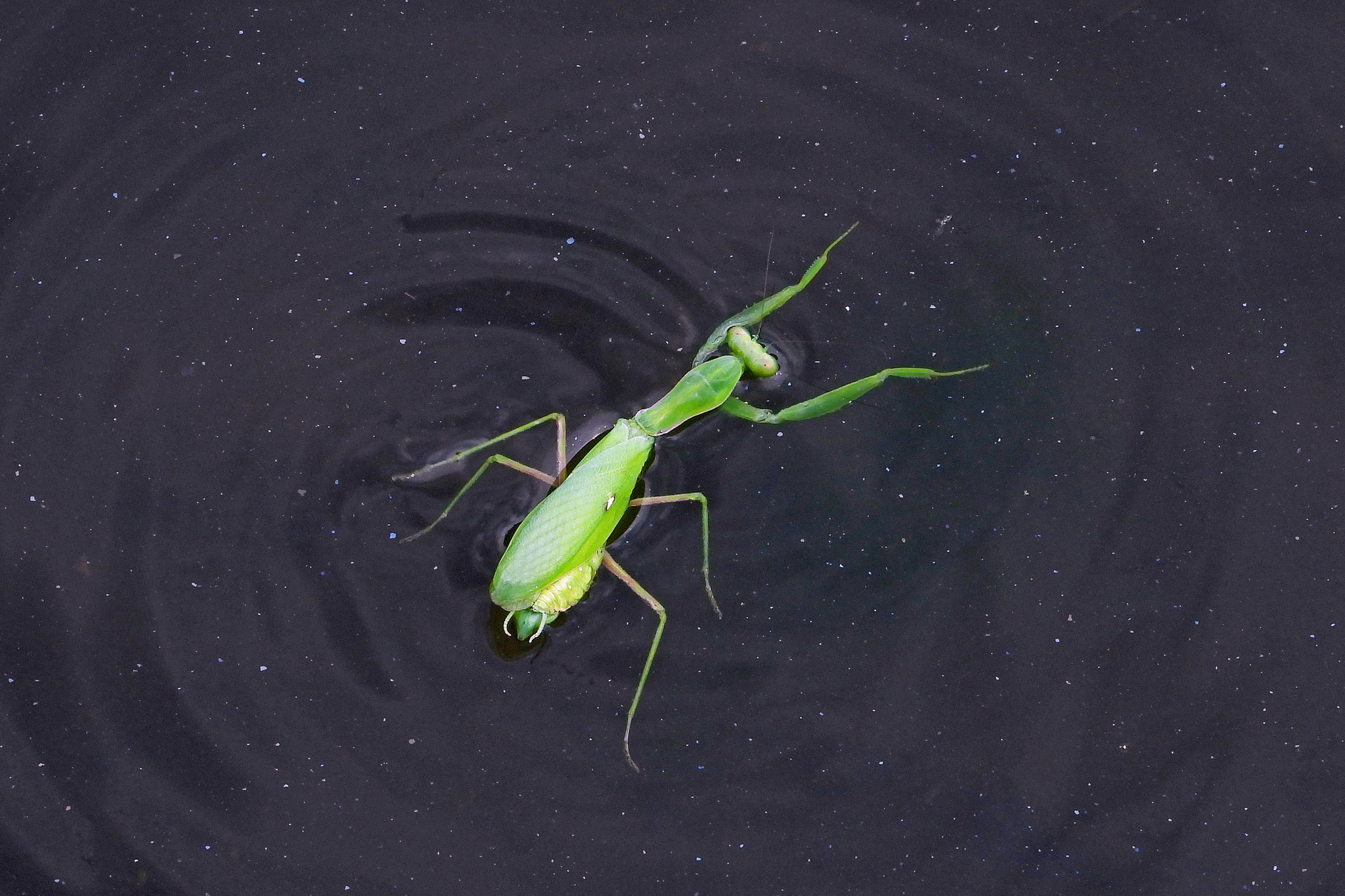 そばに「ハラビロカマキリ」が水に落ちてもがいてる。