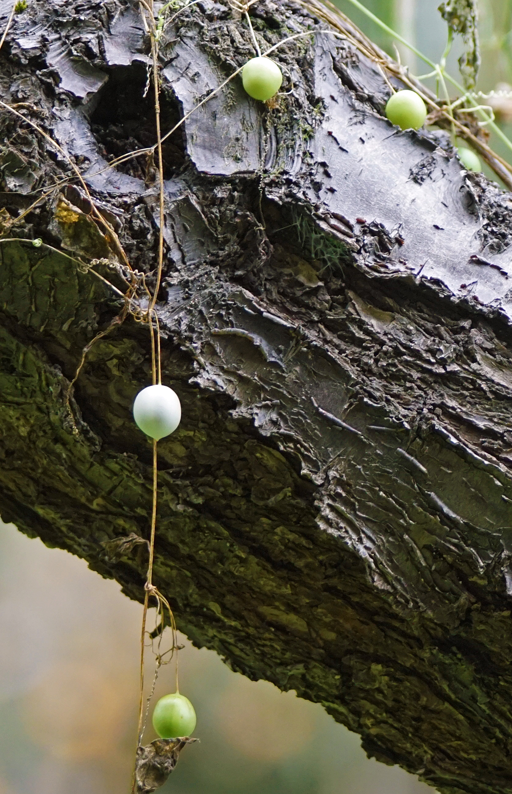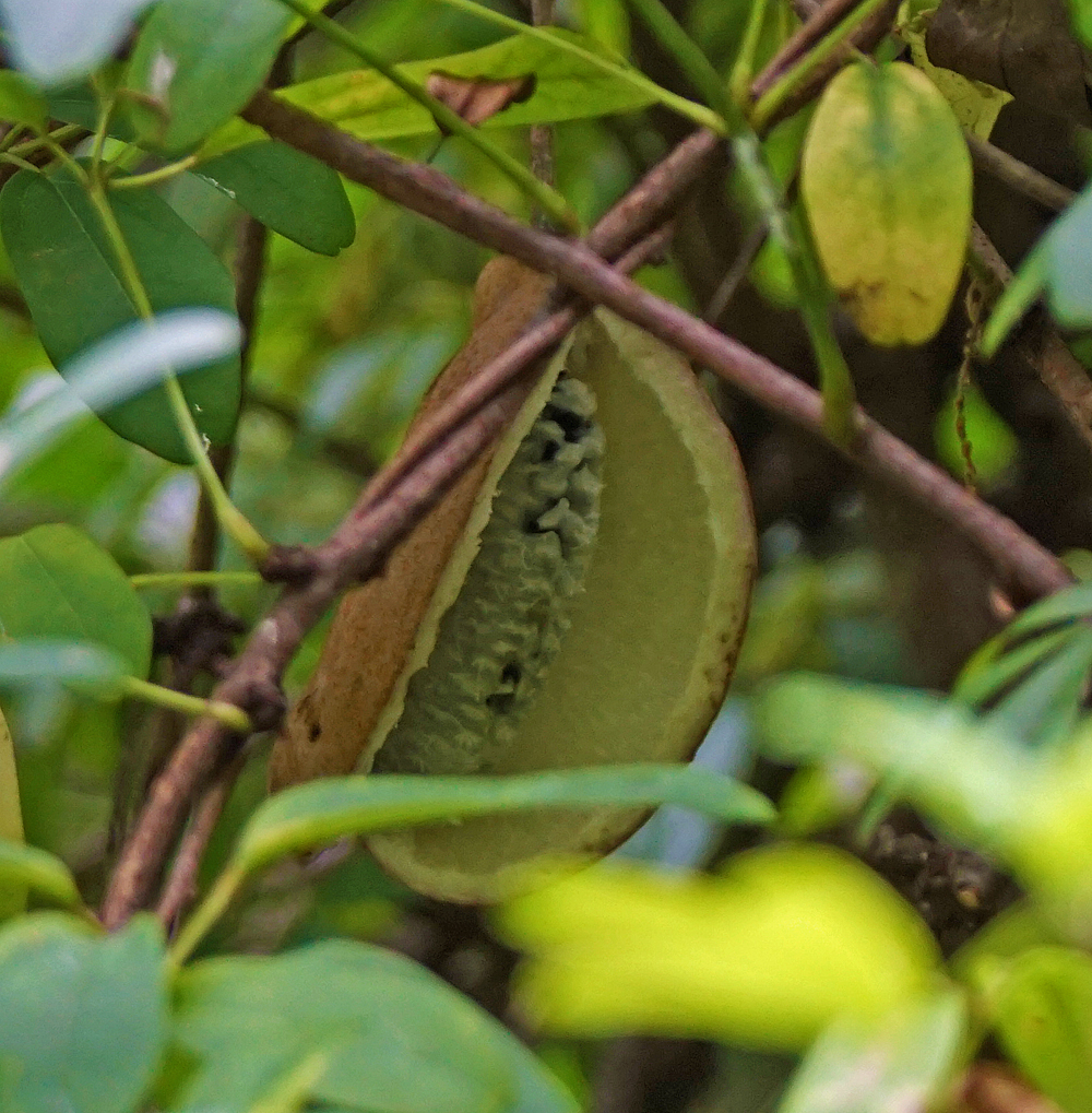 枝の奥に隠れたアケビの実はしっかり熟して、ぱっくり口を開けていました。