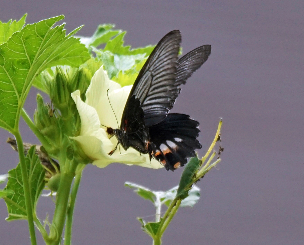 谷戸を出たところで、小さな畑地のオクラの花に、ナガサキアゲハの♀が吸蜜に来ました。