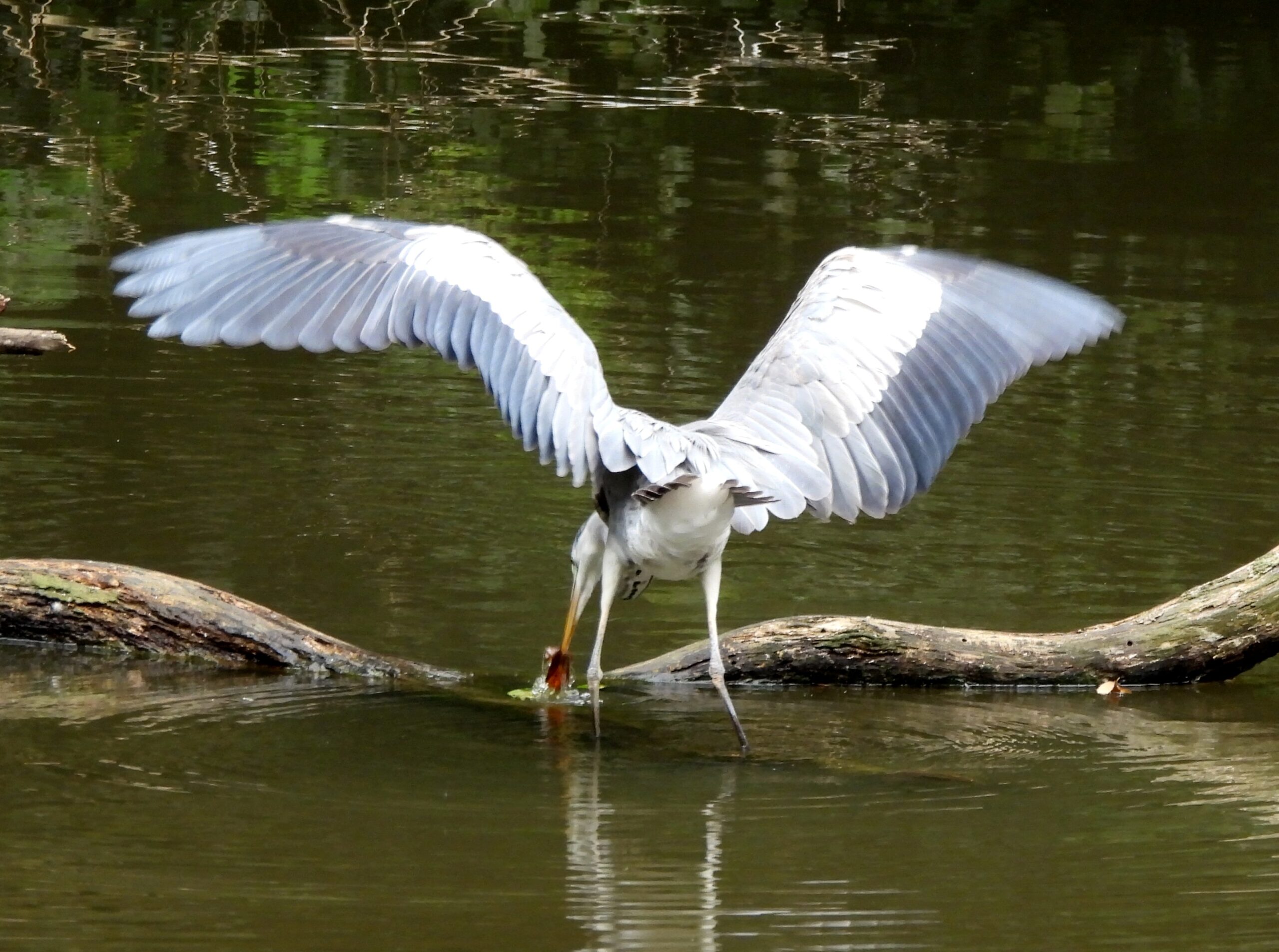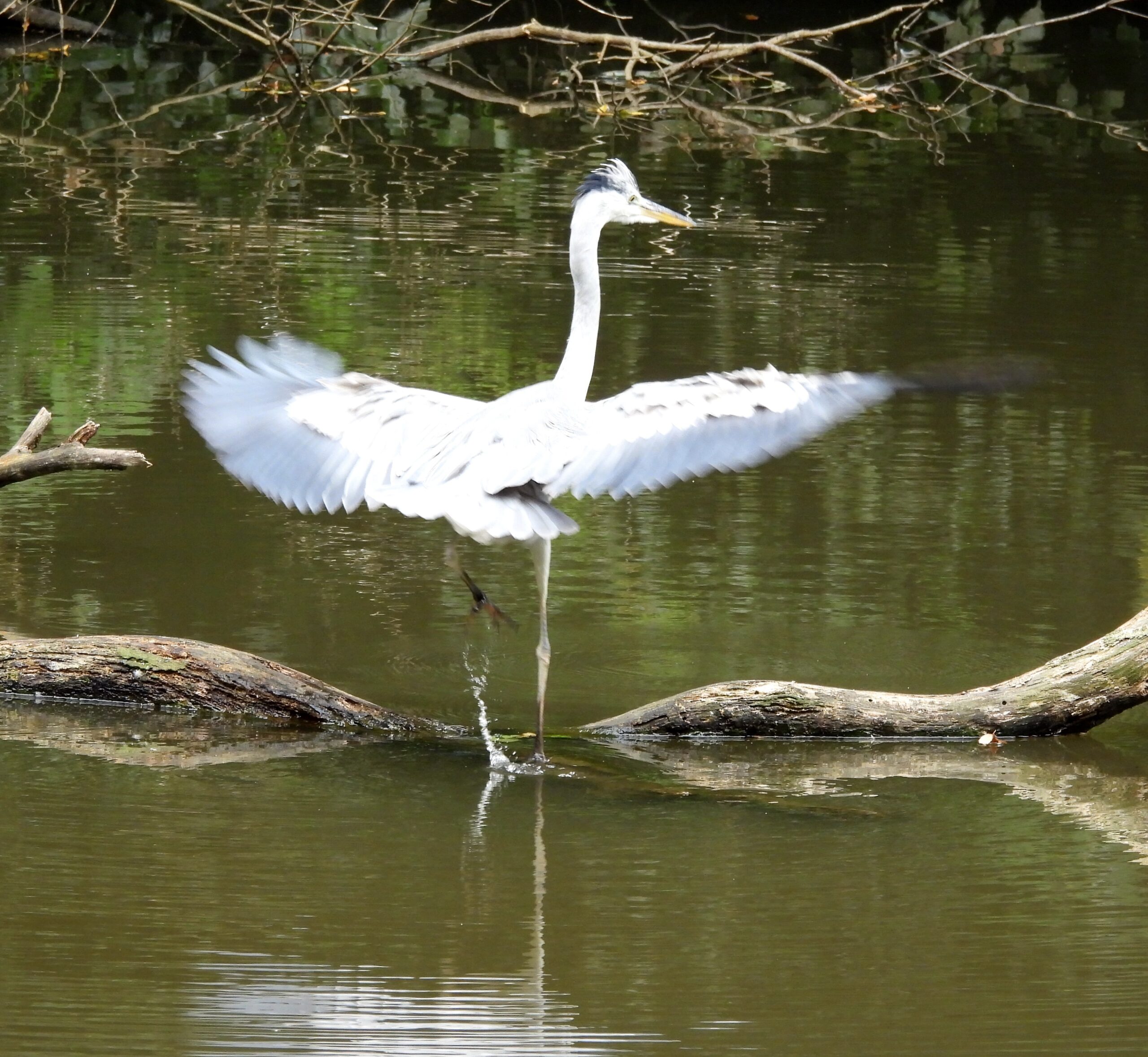 大池では、期待したオシドリには会えず、若そうなアオサギが羽を広げて採餌中