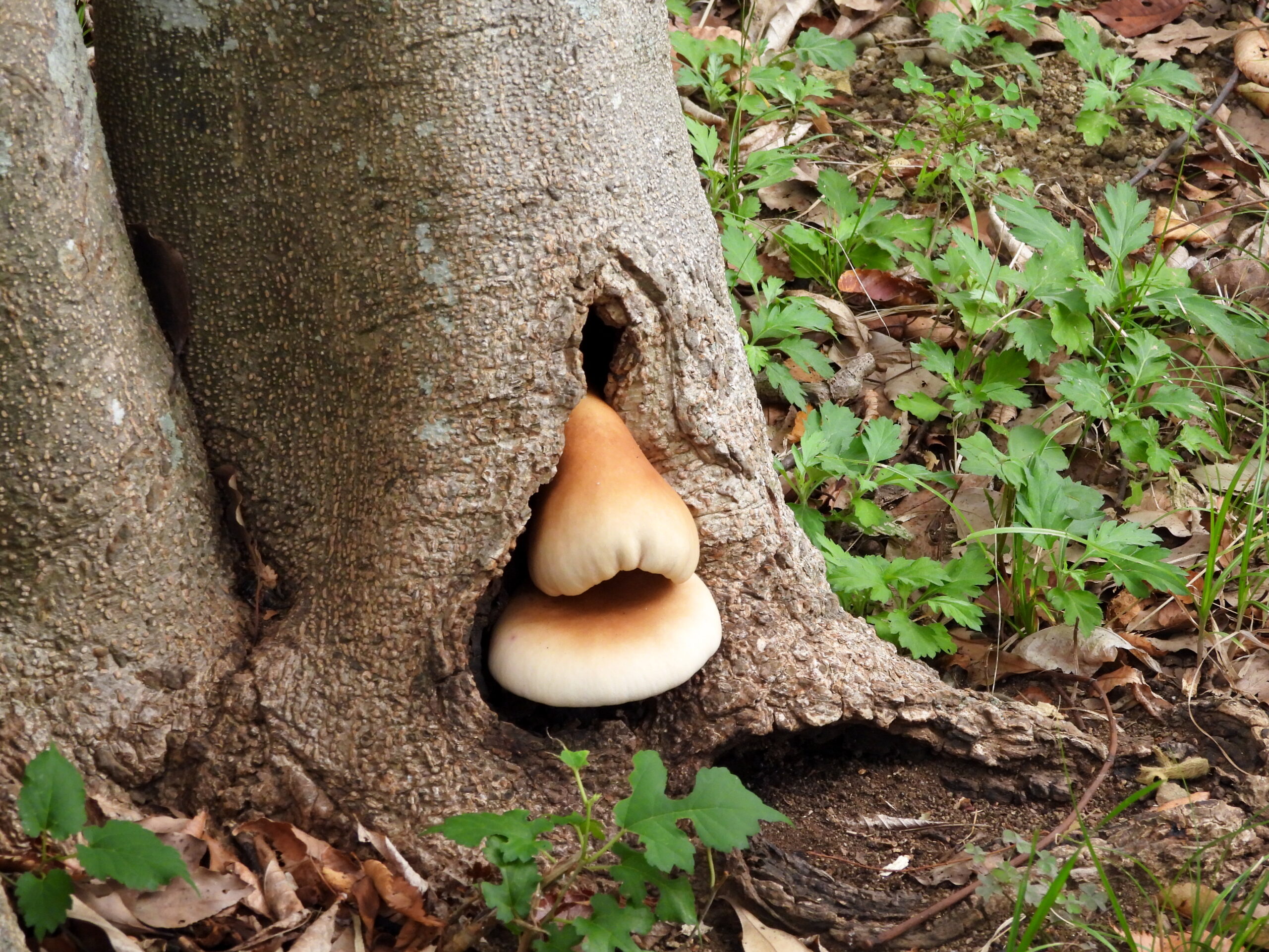一休みの場所では、コブシの木の間にキノコが。はて、何でしょう?