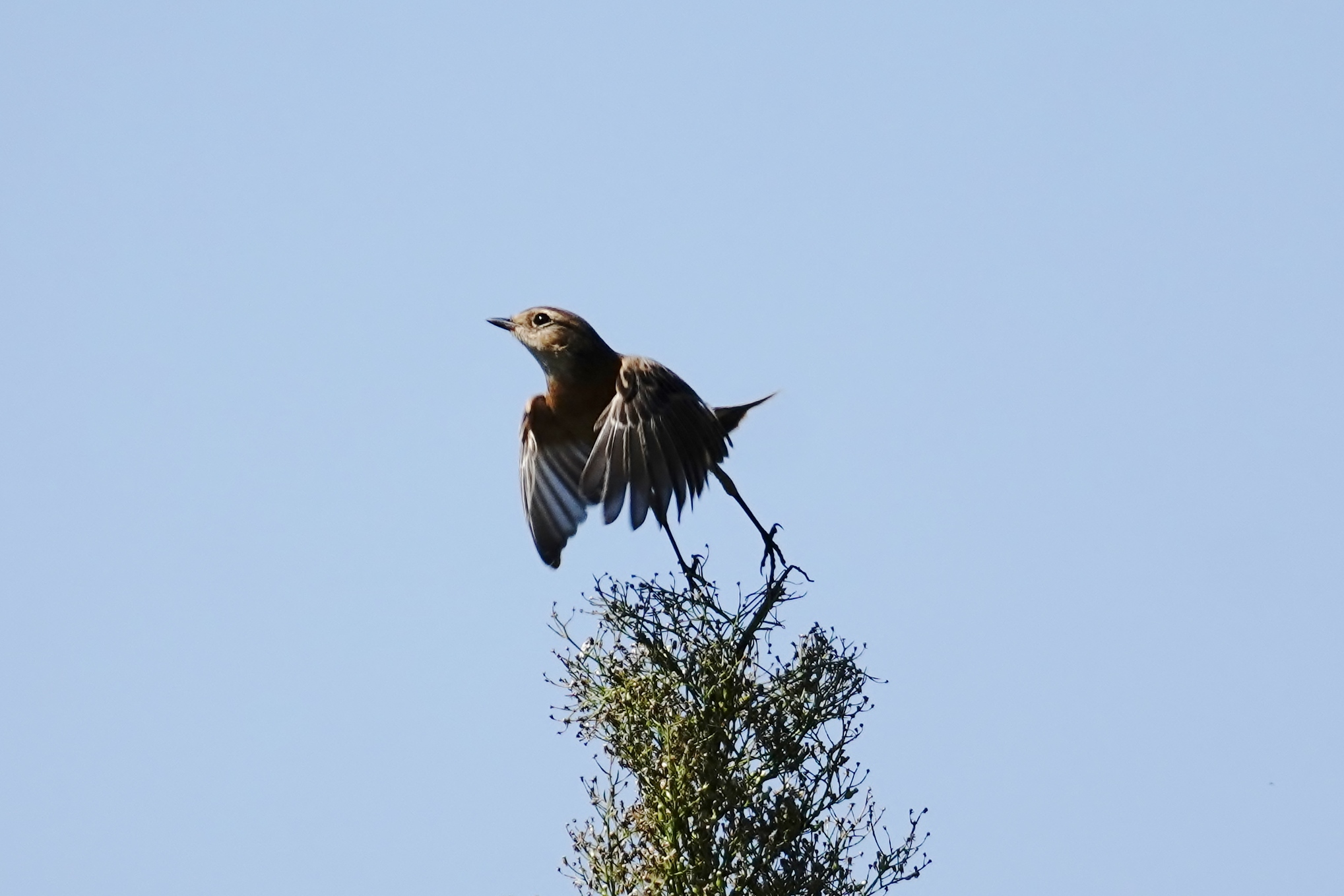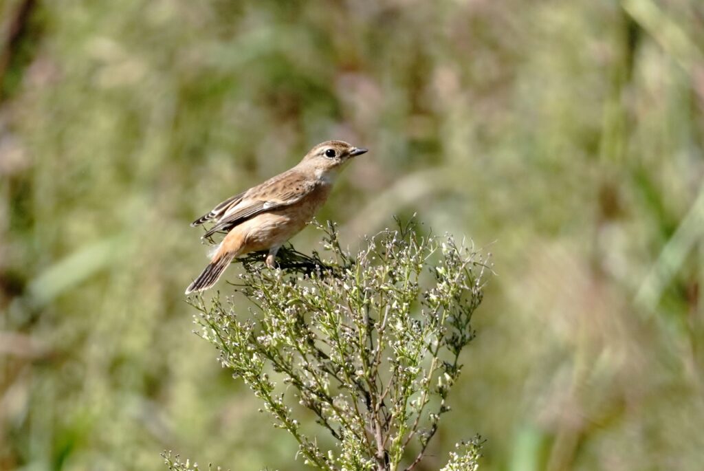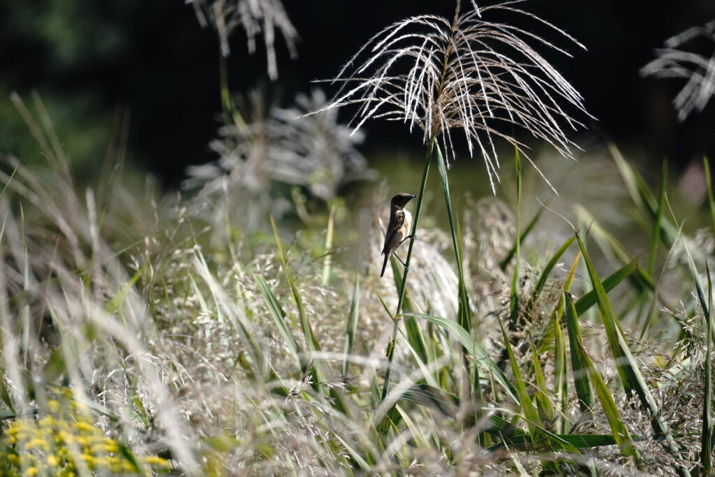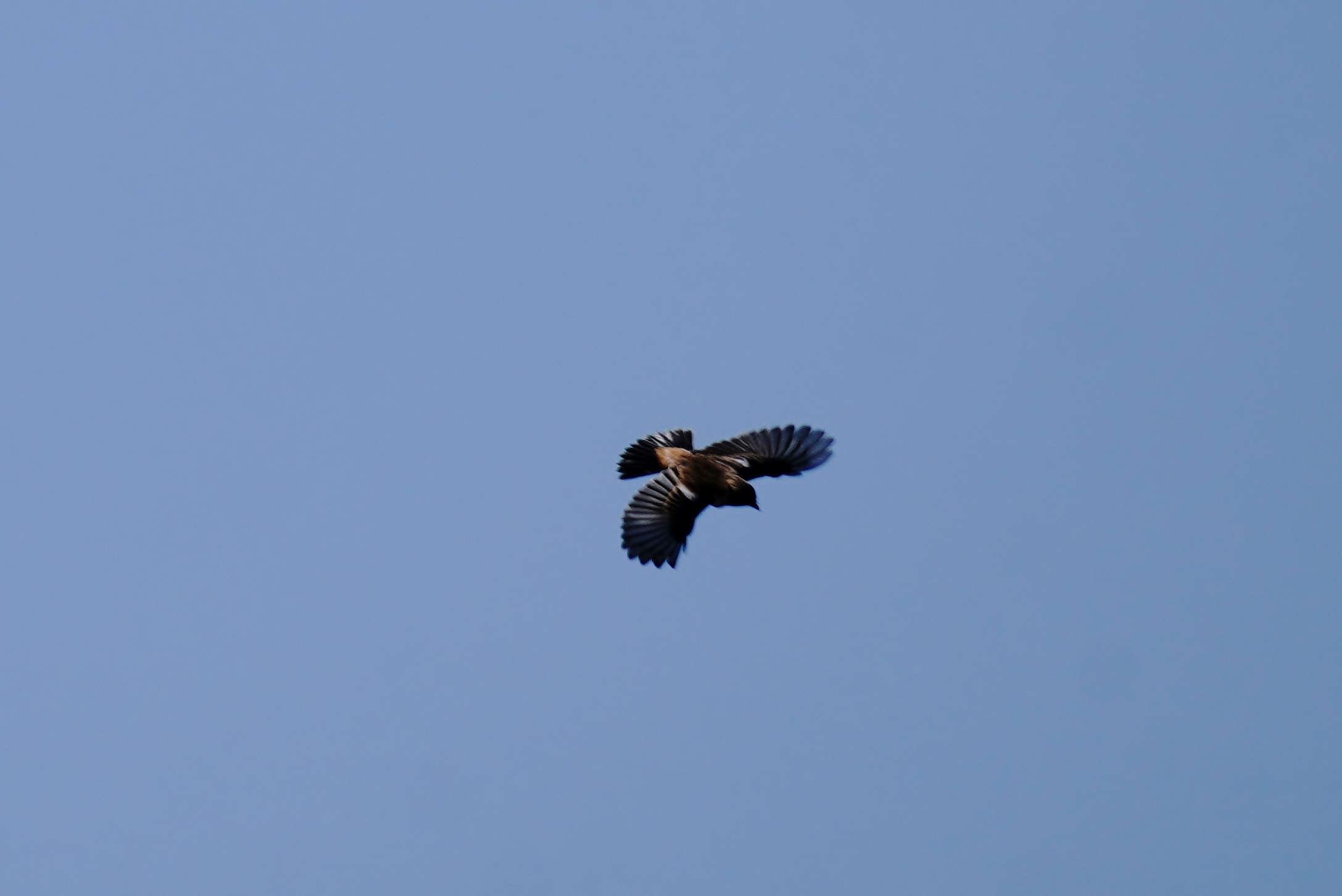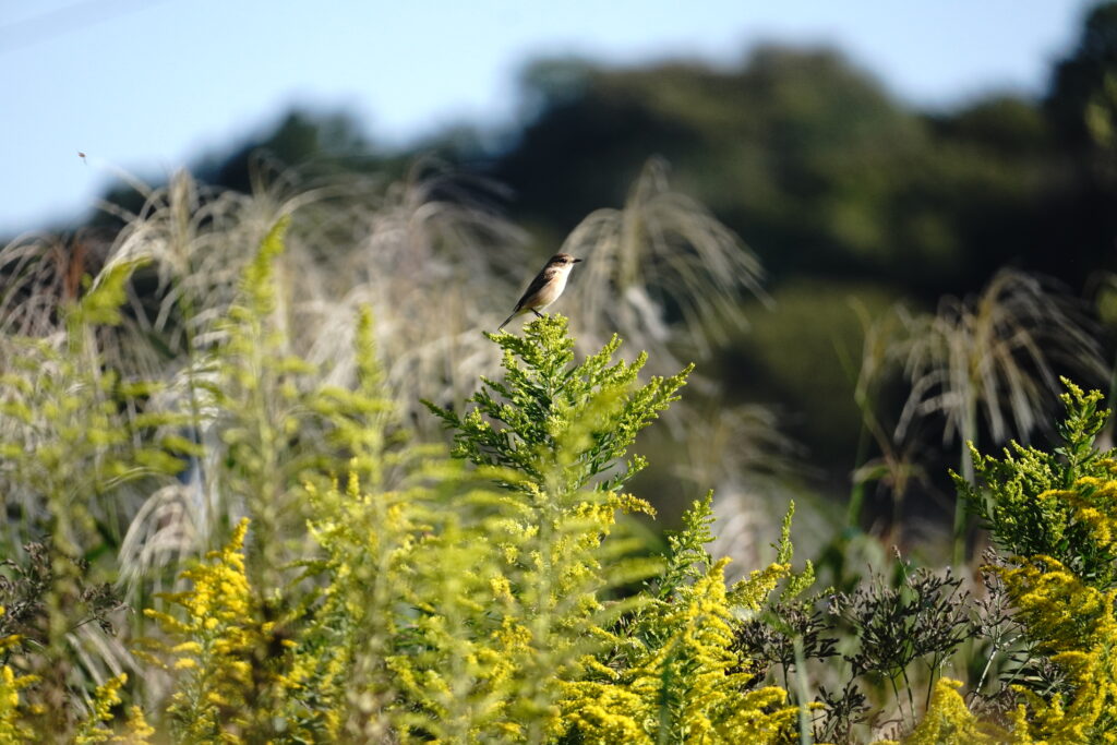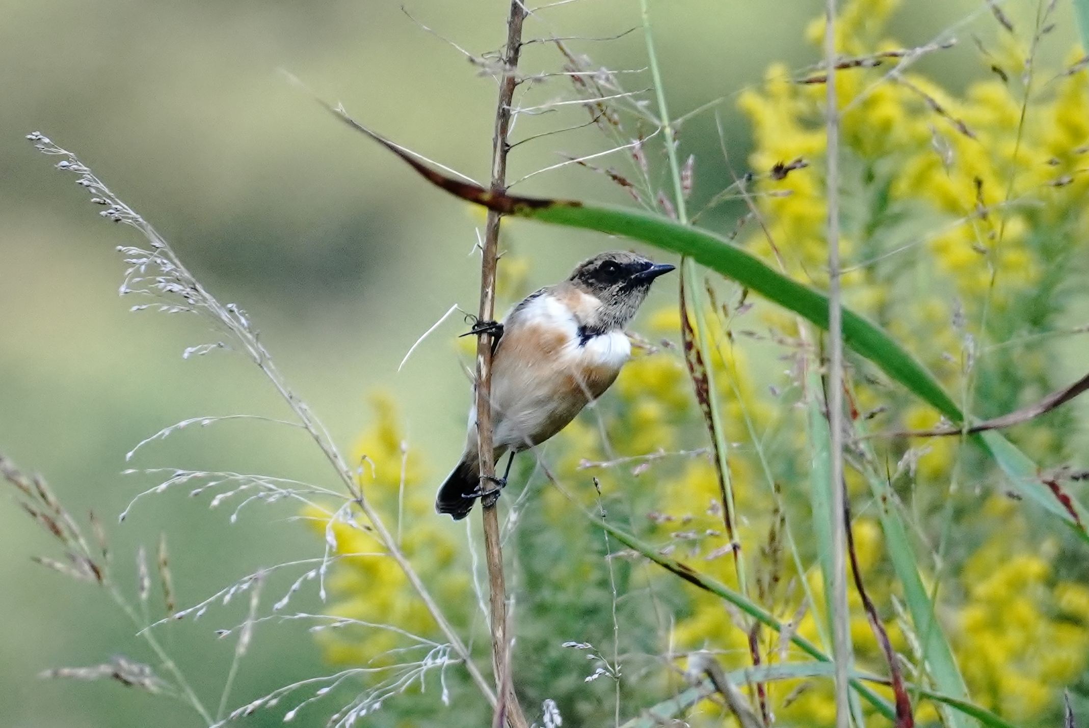 久しぶりの晴天に恵まれ、日中は気温も上昇。地元にはまだノビタキが滞在中で、黒い子にも会えました。草むらは様々な花が咲き、蝶たちが忙しそう。