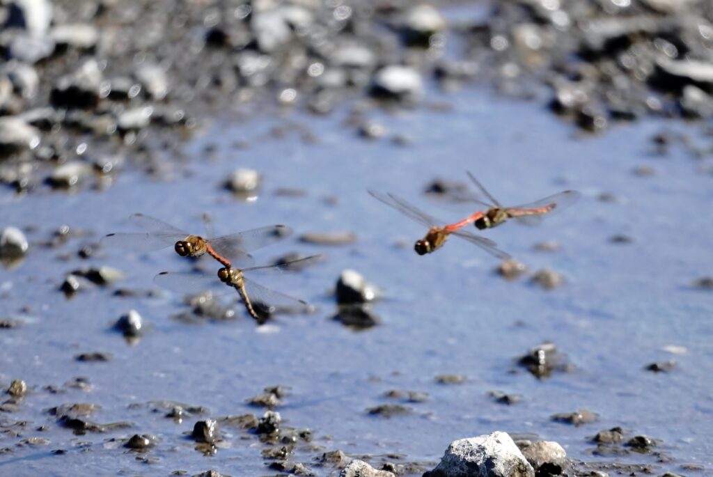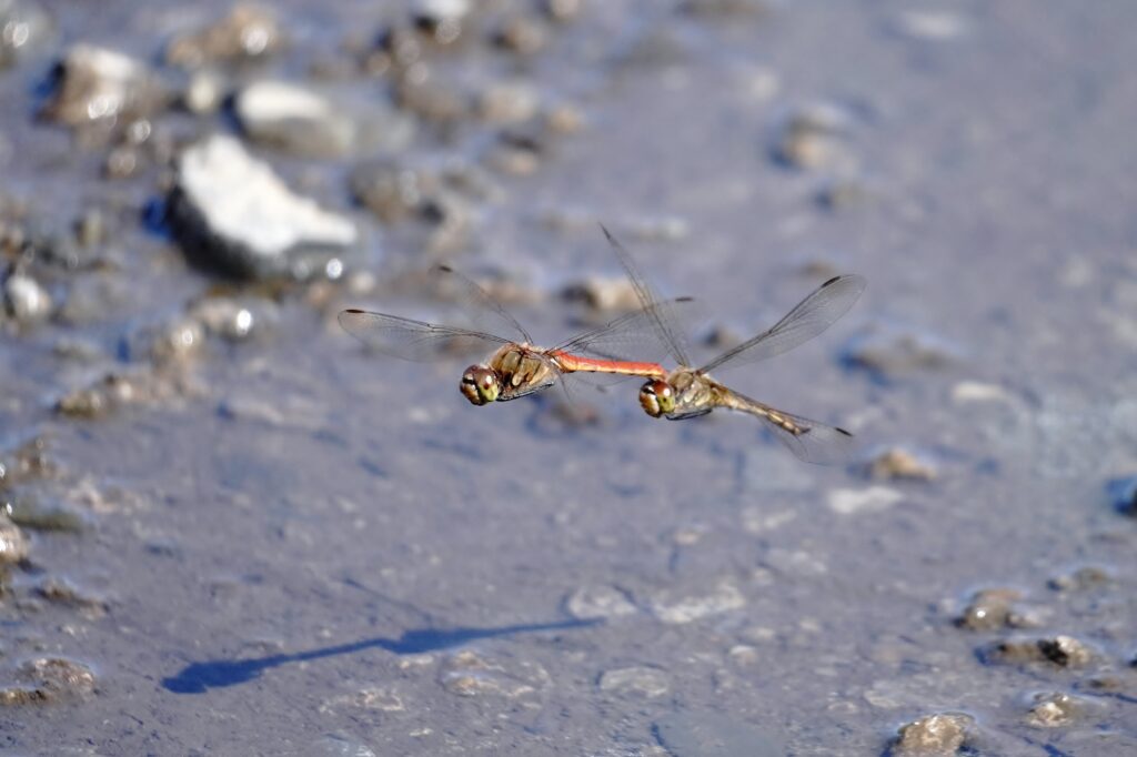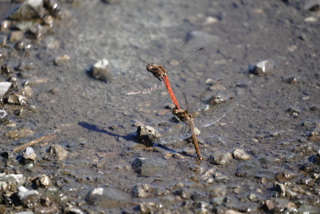 雨上がりの水溜りには多くのアキアカネつがいが産卵中。干上がったら卵はどうなるか調べると、何と卵は乾燥に強く水がなくても次の春まで生き残れるそうです。安心しました。