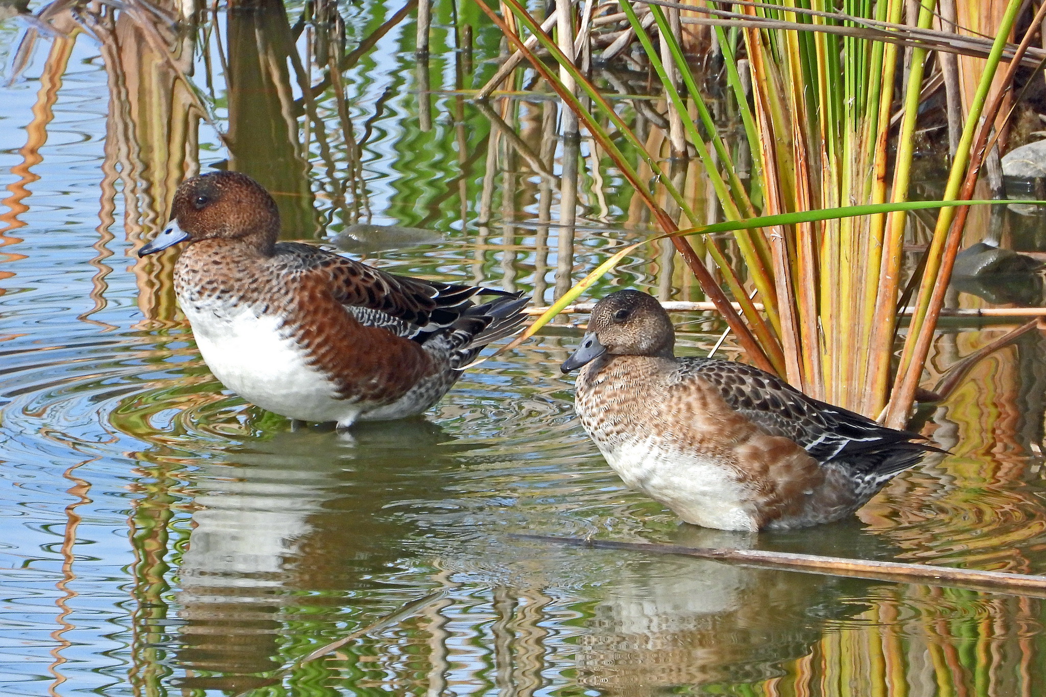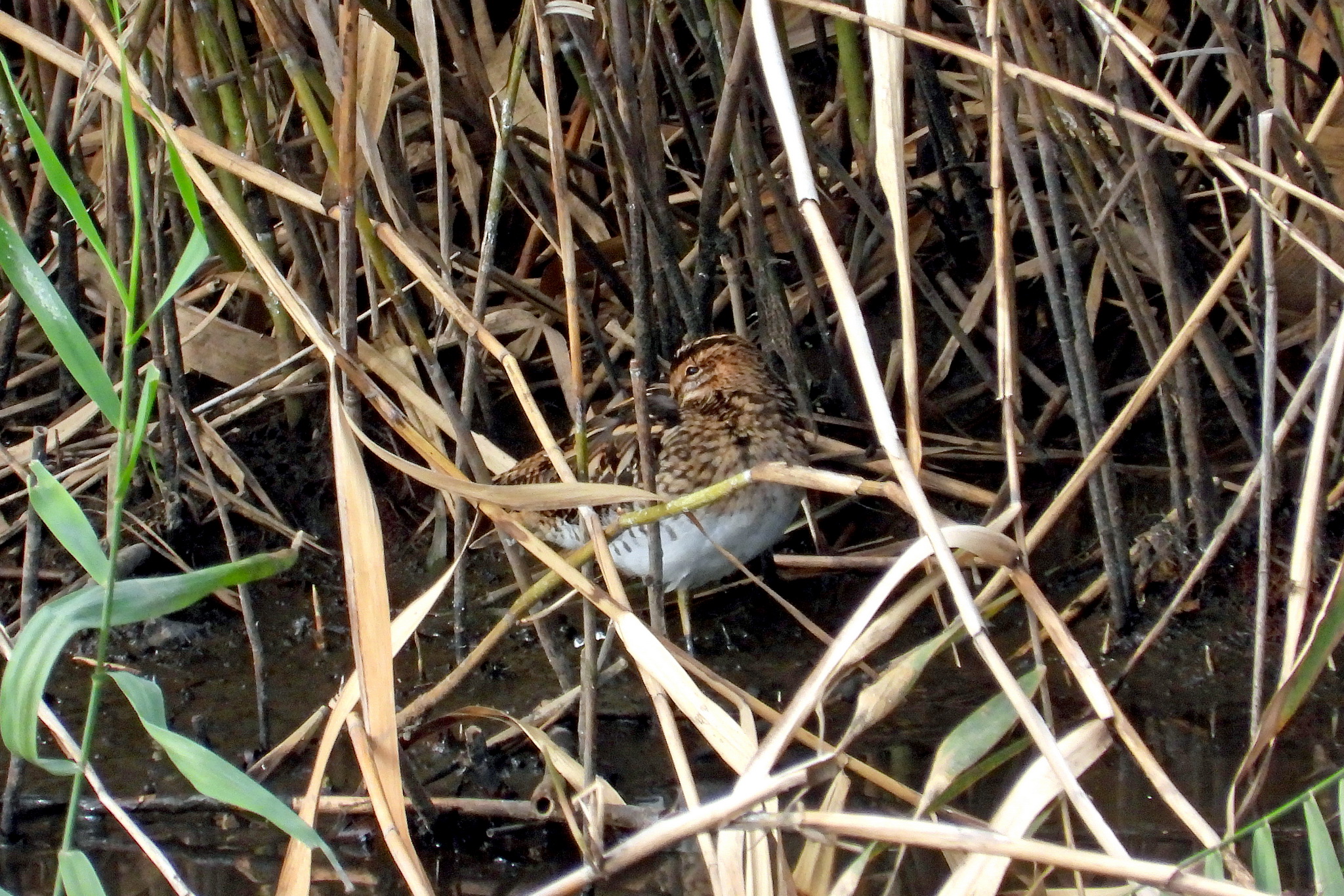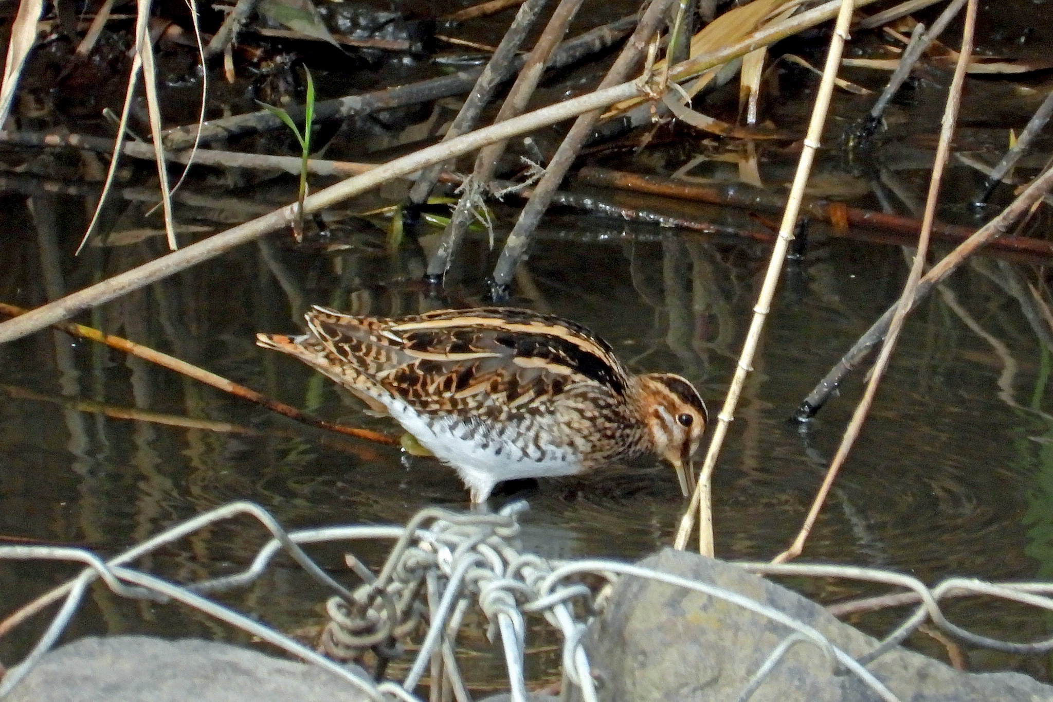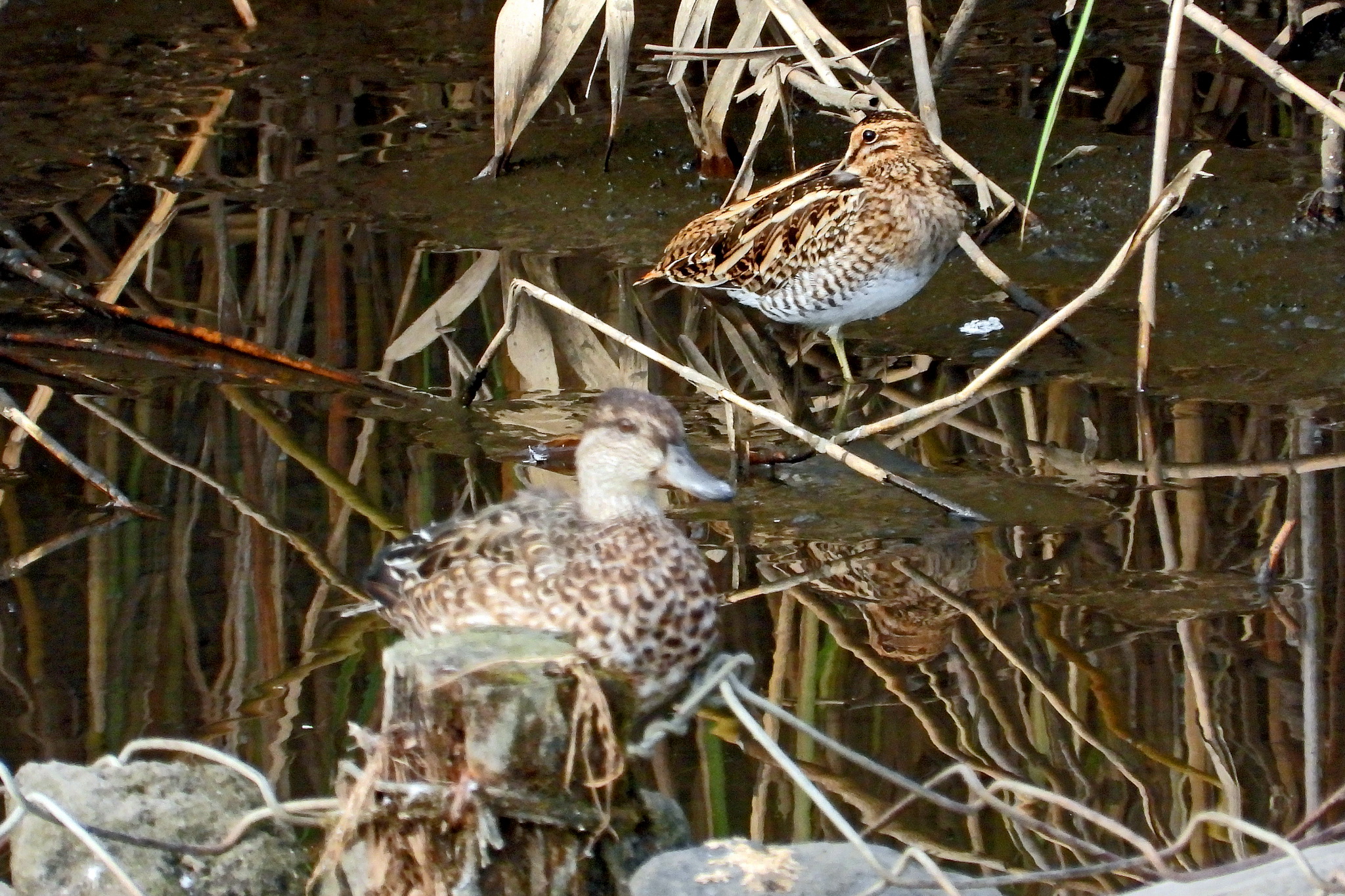 「コガモ」の向こうで、「タシギ」が休んでます。