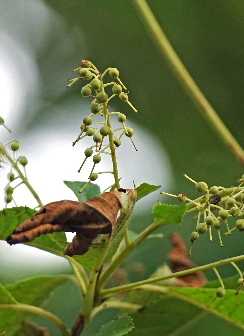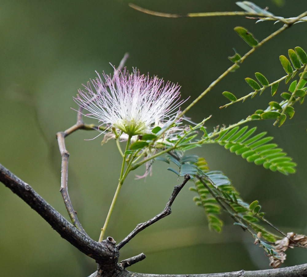 チャイロの実を下げているネムノキに、 若葉とともに、ポチっと、小さな返り咲きの花が。