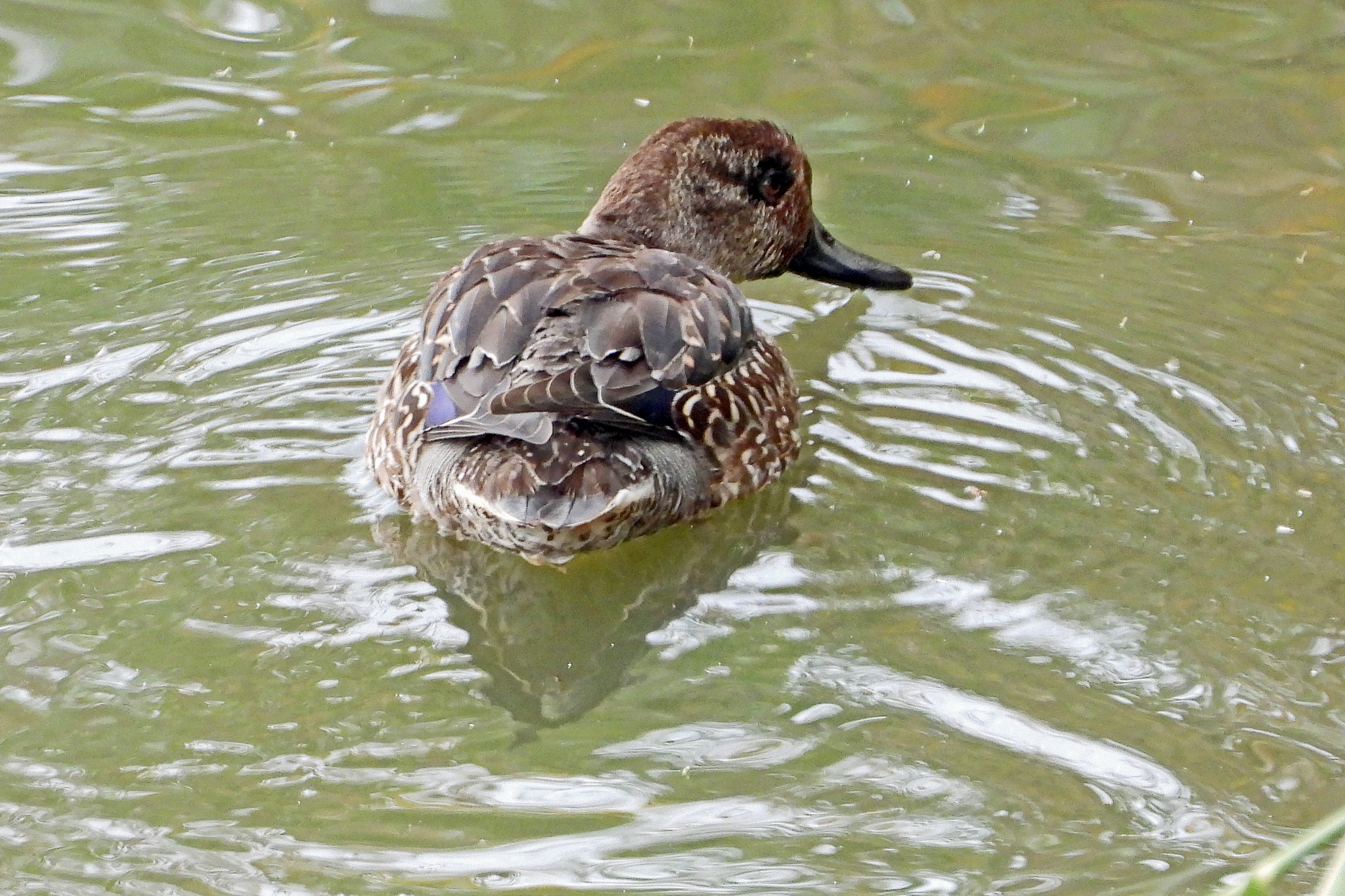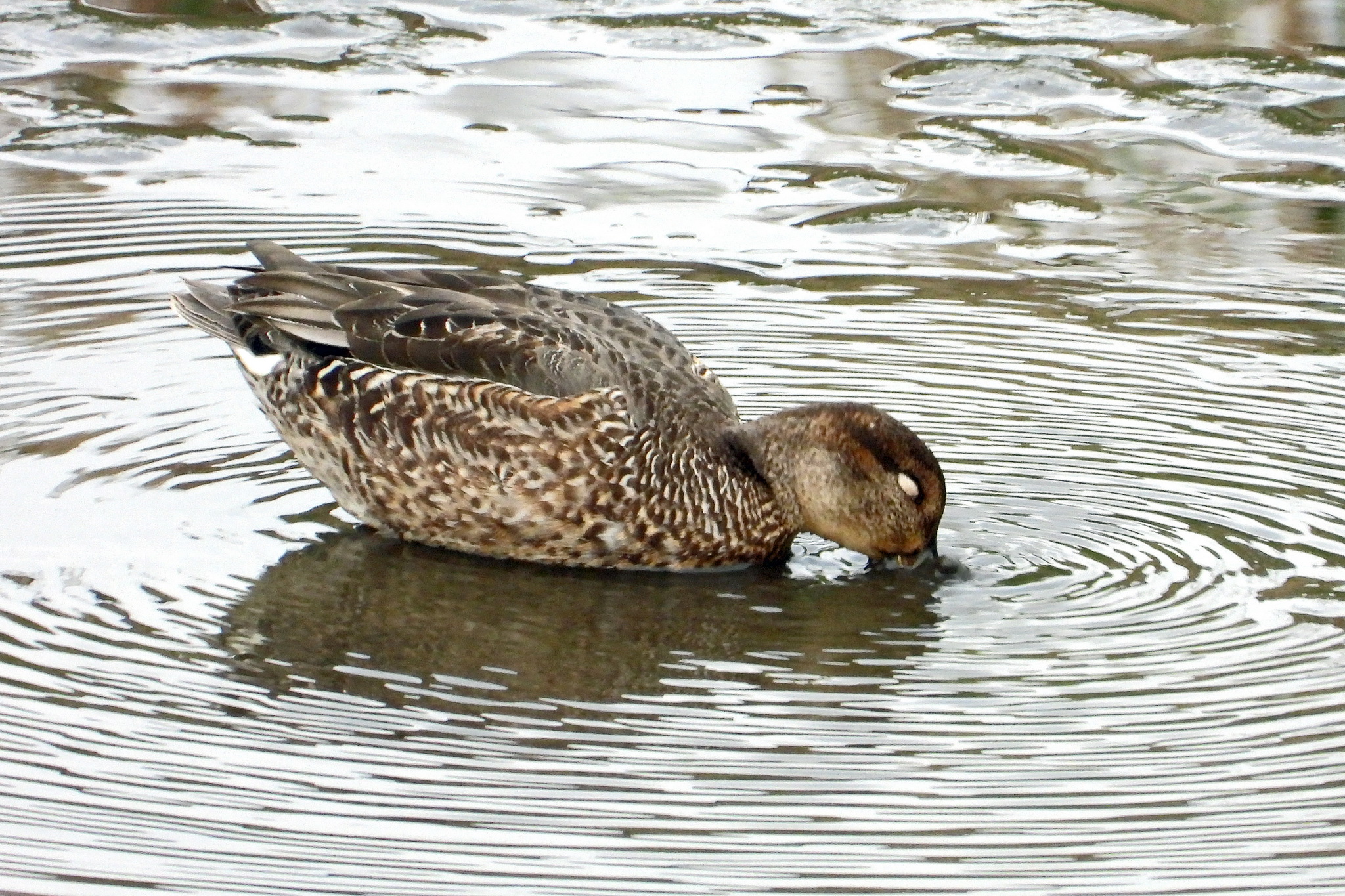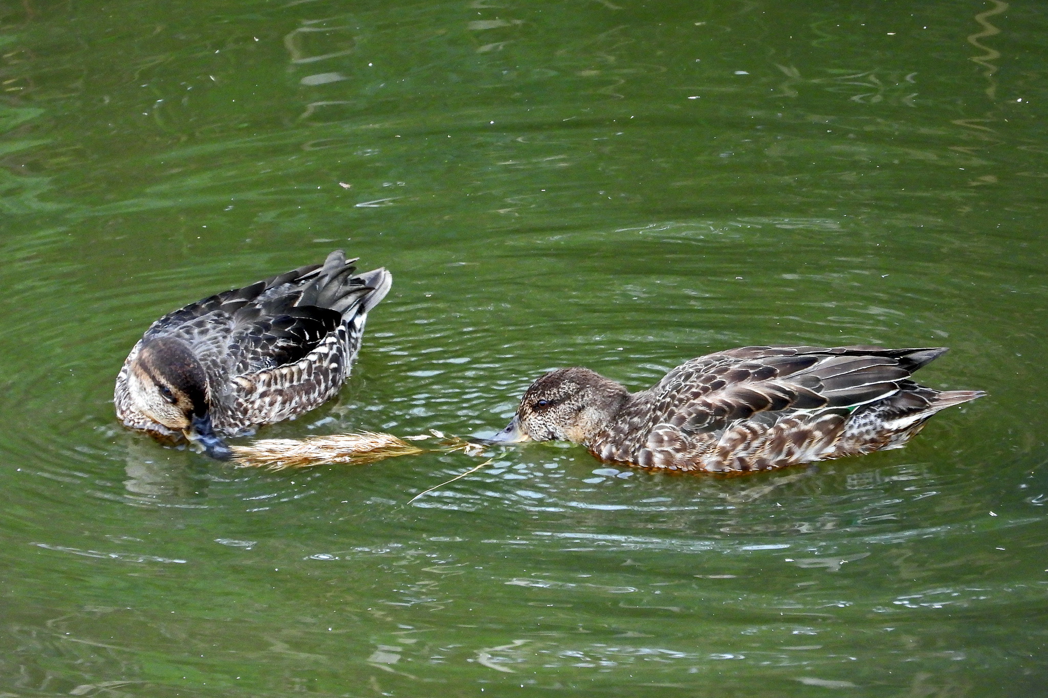 こちらは「コガモ」のメスらしい二羽が、遊んでました。