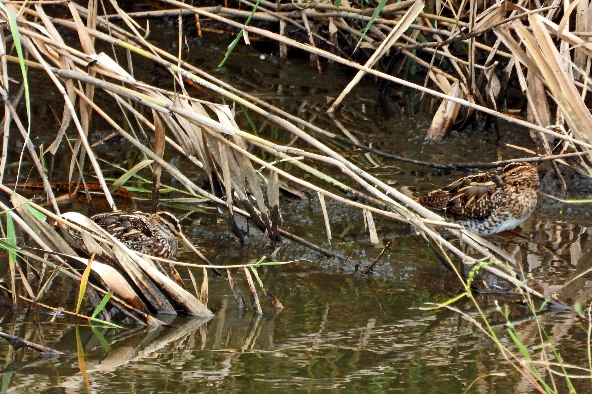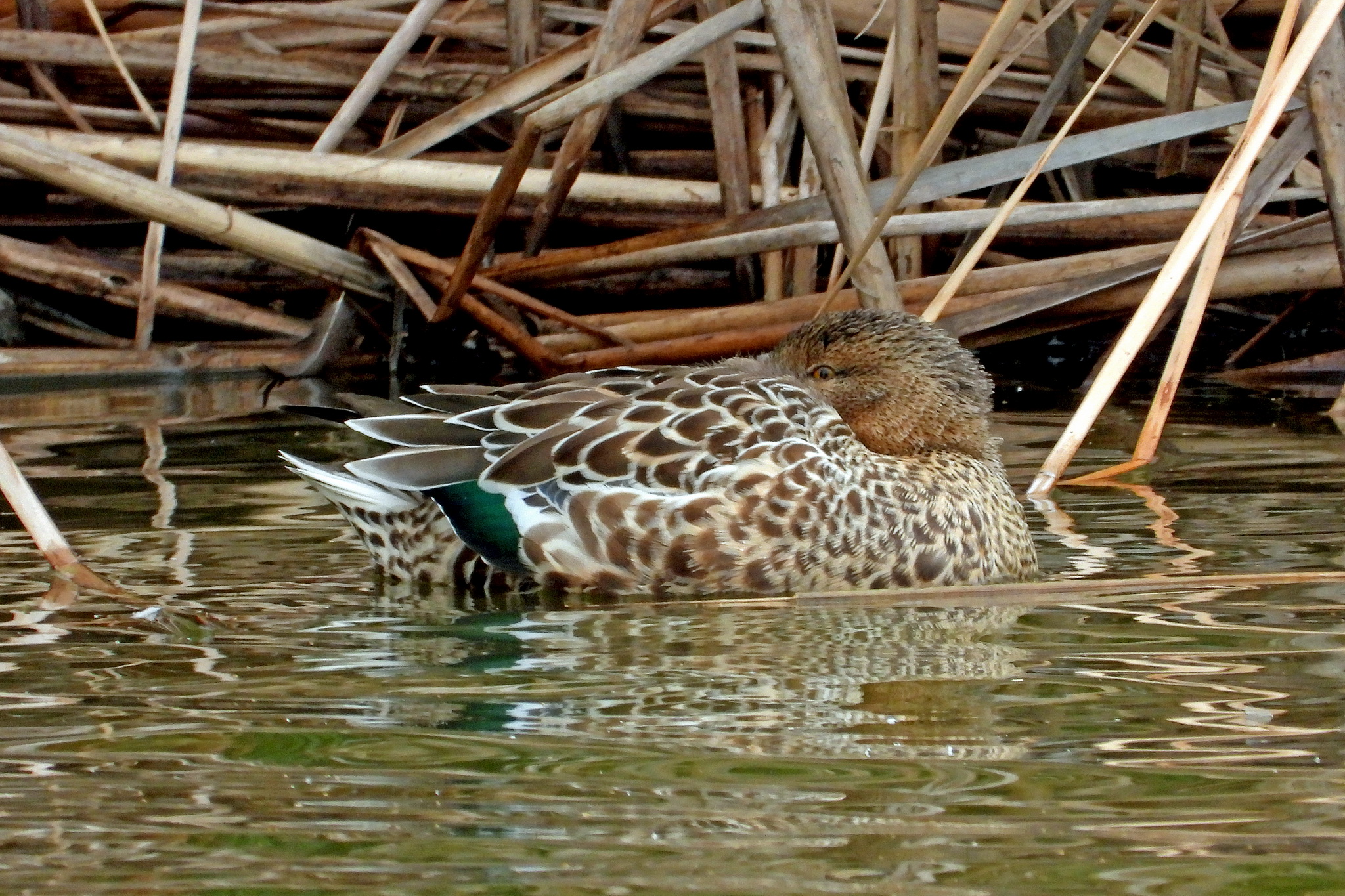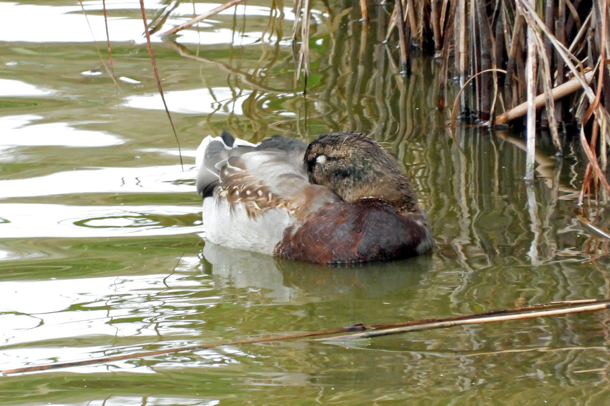 こちらは「コガモ」のメスらしい二羽が、遊んでました。