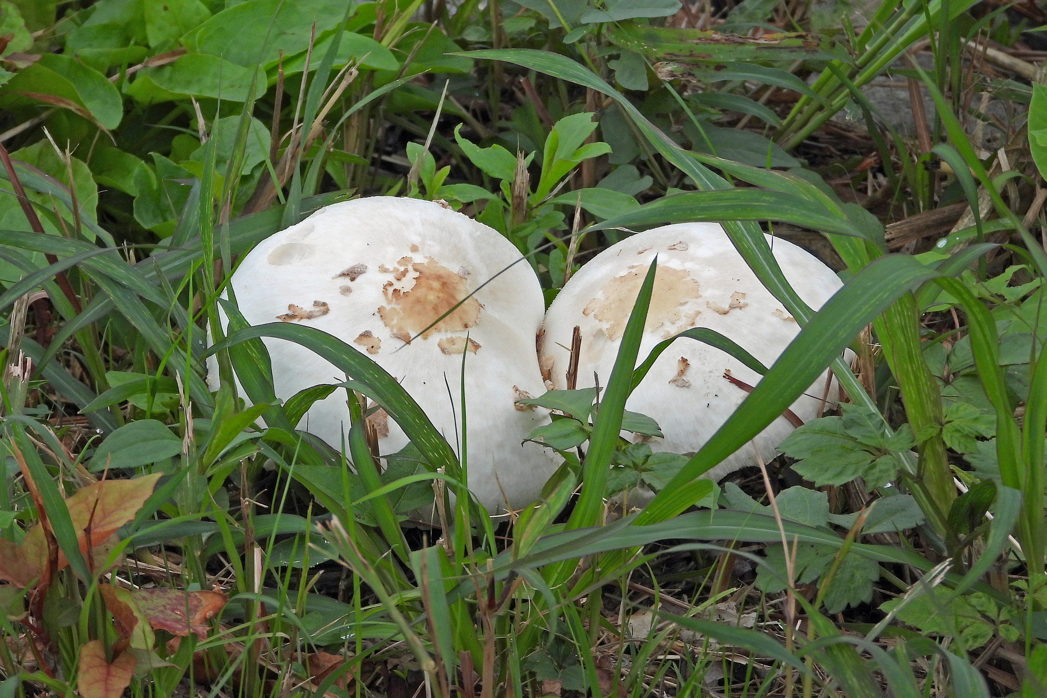 遊水地の斜面部分の一箇所に、白いキノコが集中して生えてます。