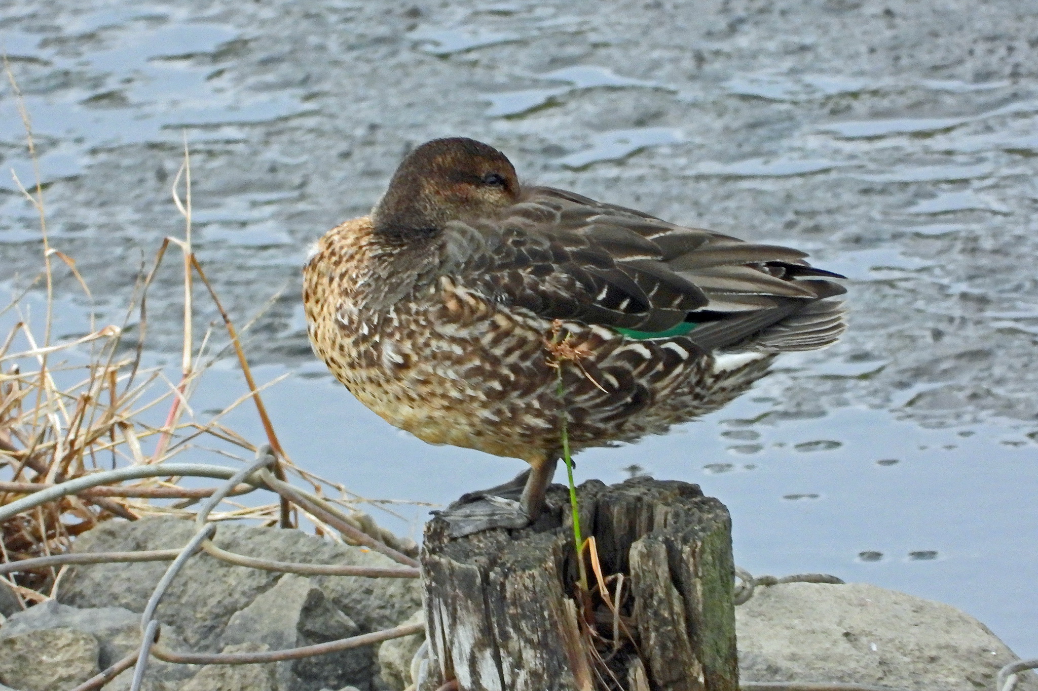 少し先の杭に「コガモ」がうずくまってます。