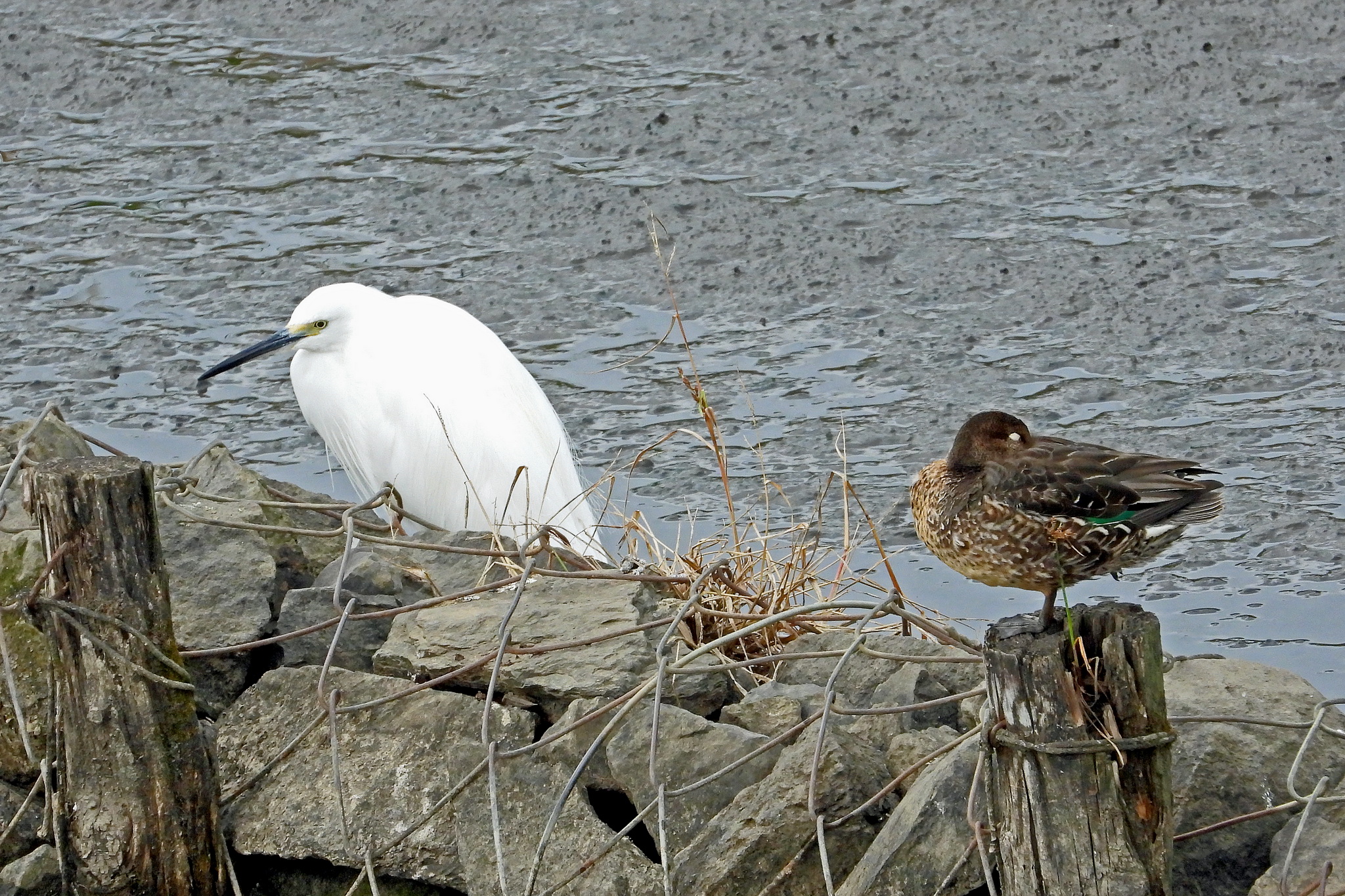 石組みにはカモ類やサギ類が沢山いるのに、今日は「コガモ」と「コサギ」が一羽ずつです。