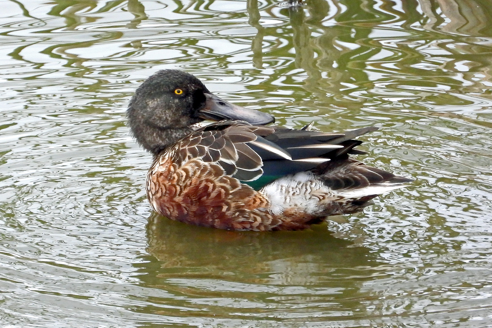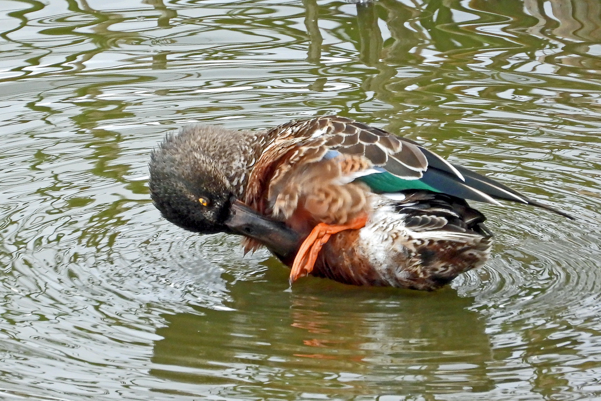 「ハシビロガモ」のオスが、羽のお手入れをしてました。