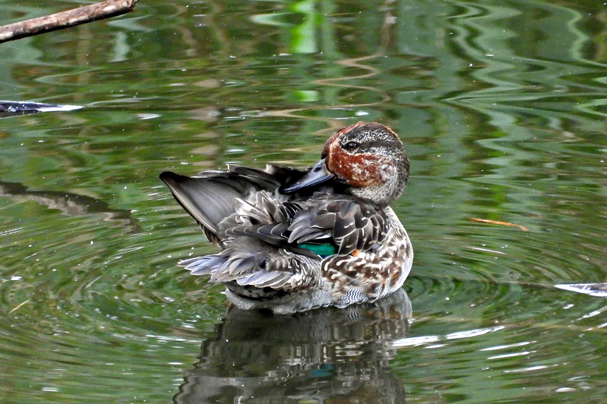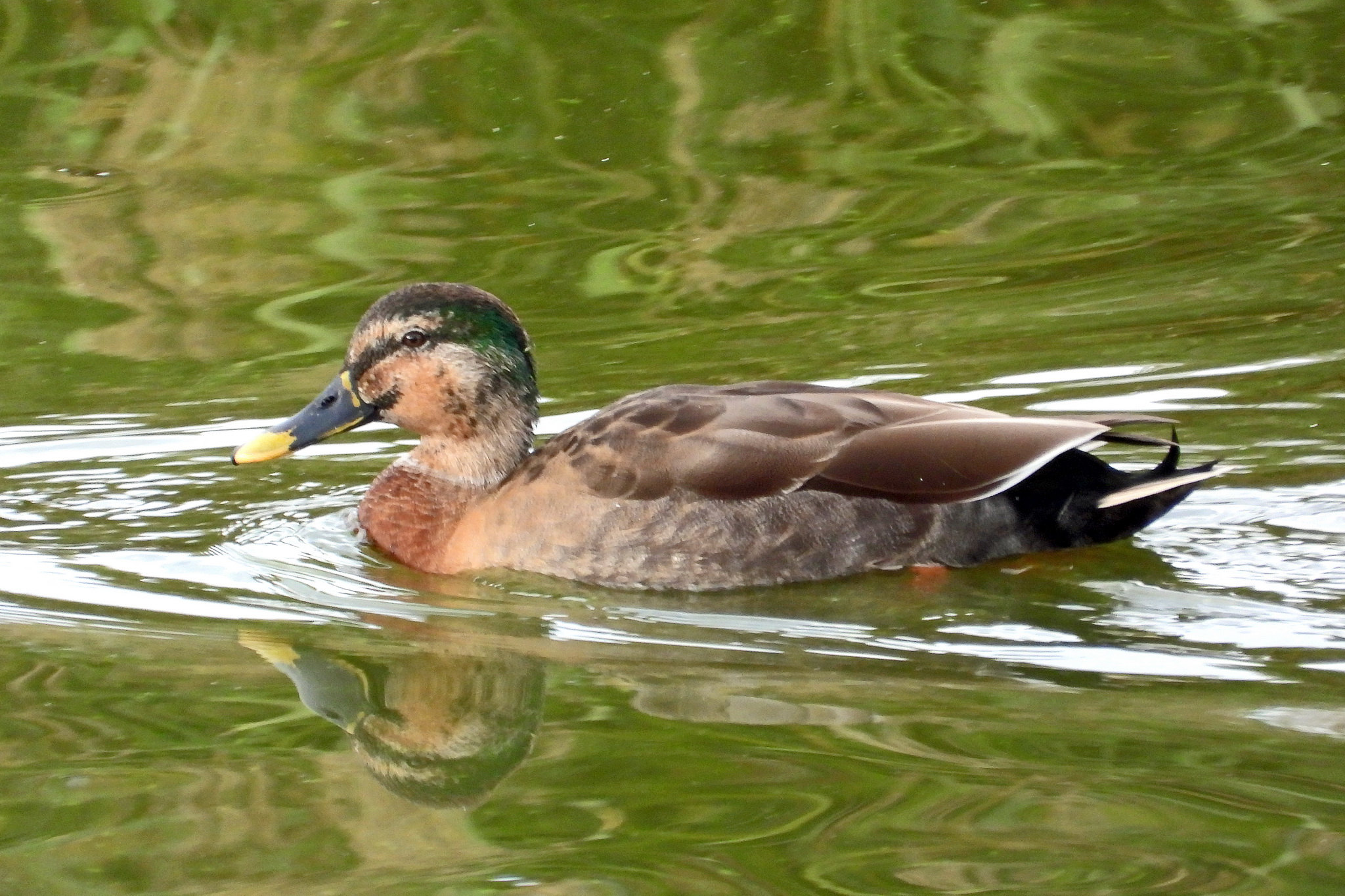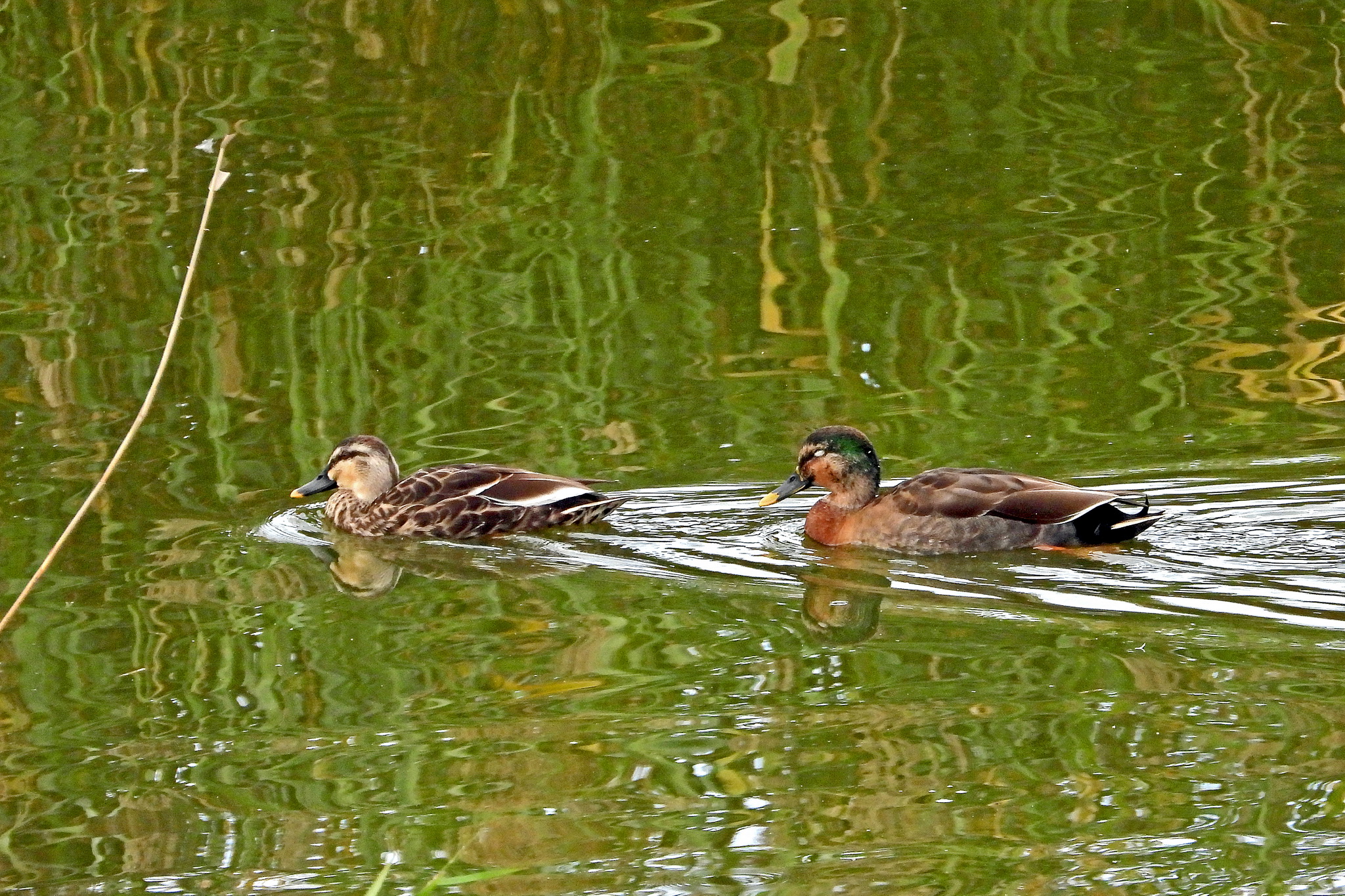 おっ、「カルガモ」に「カルガモ」と「マガモ」の交雑種が泳いでいますね。