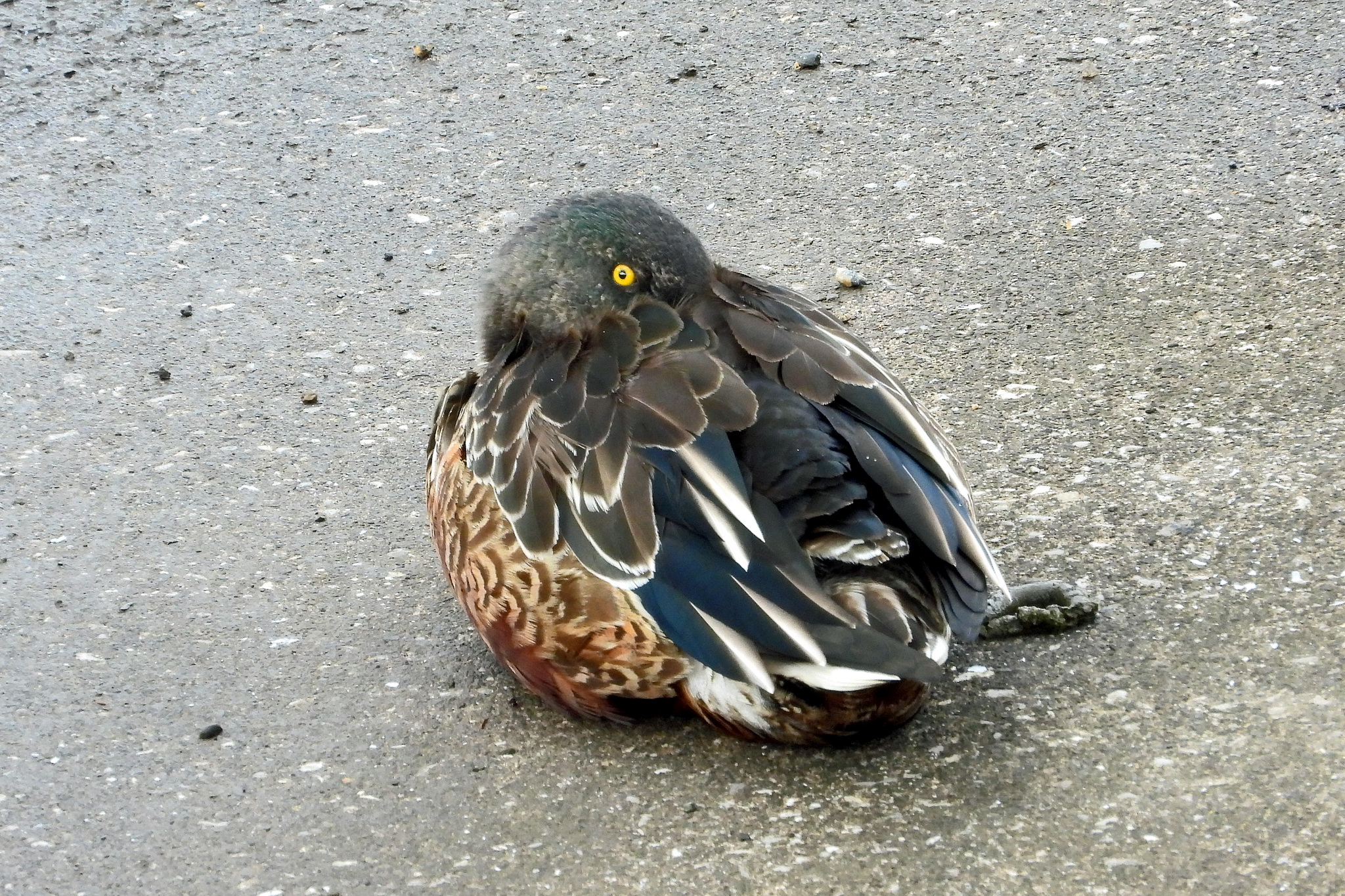 うずくまっているのは「ハシビロガモ」の様ですね。