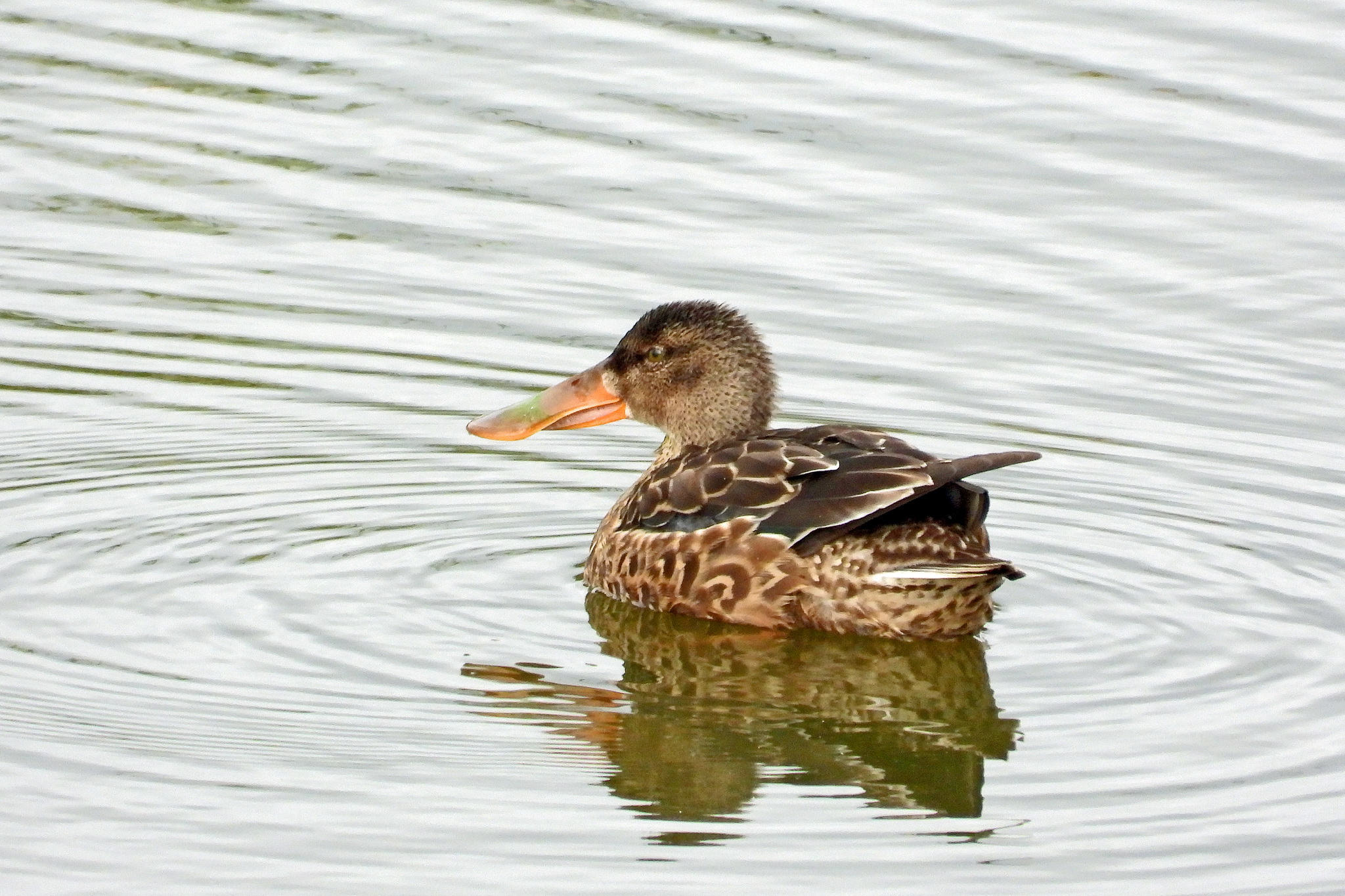着水したのでズームアップすると、「ハシビロガモ」のメスでした。