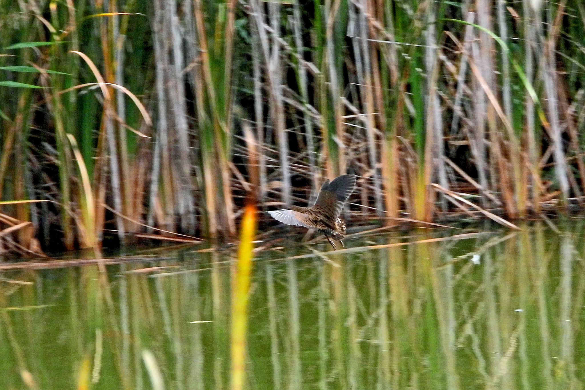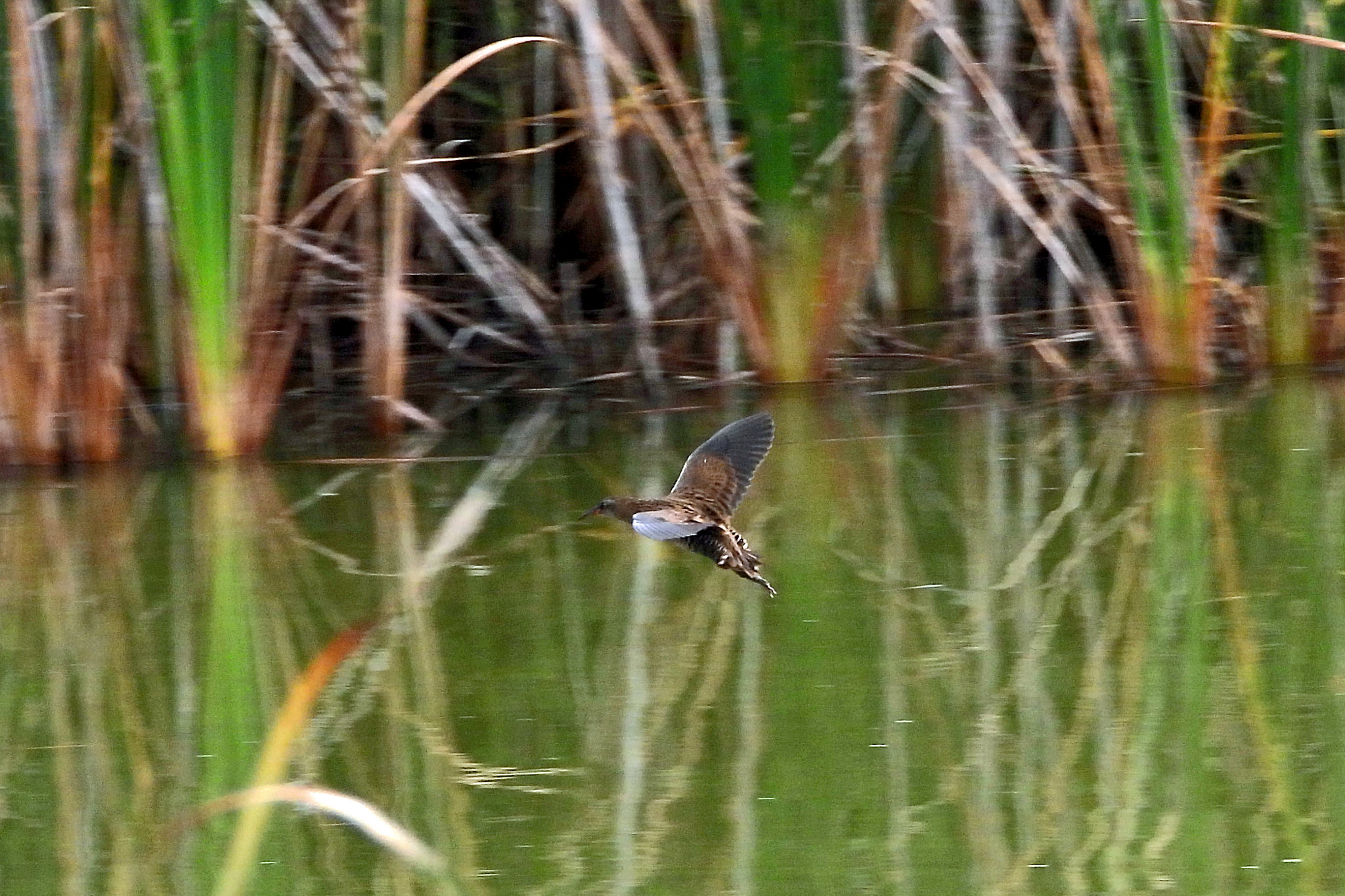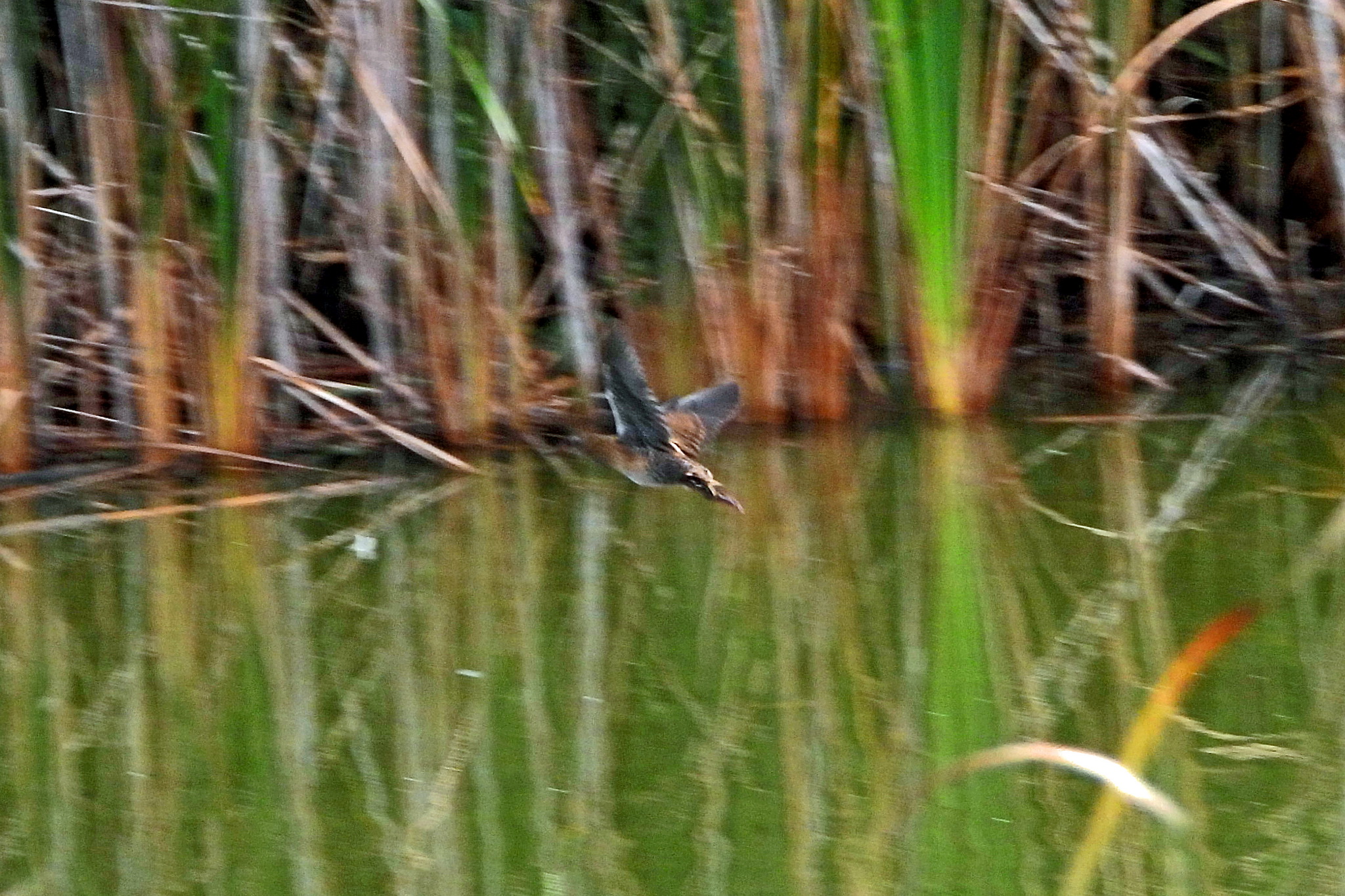 茶色っぽい鳥が水面すれすれを飛んで、葦原の中に消えました。
