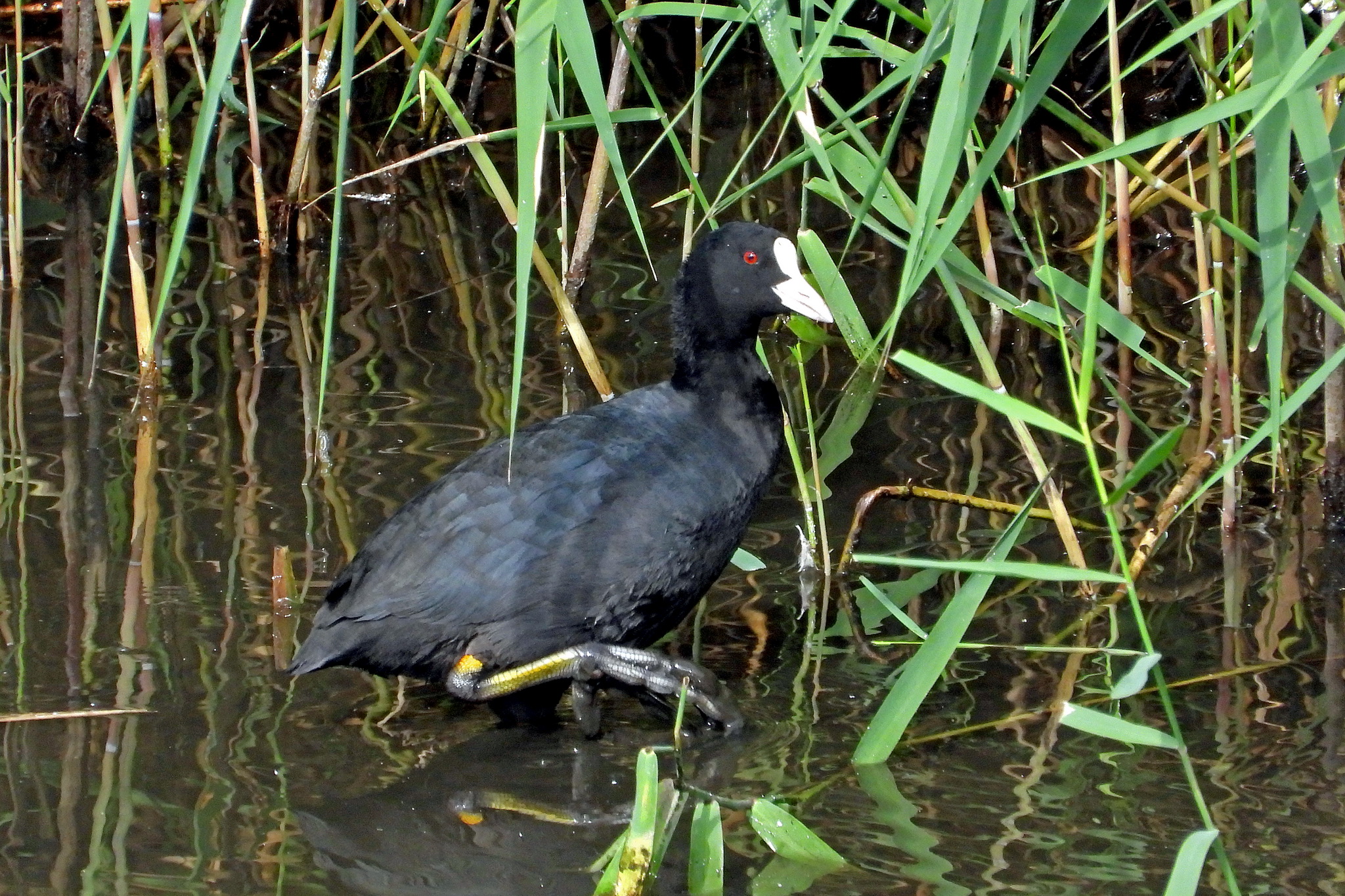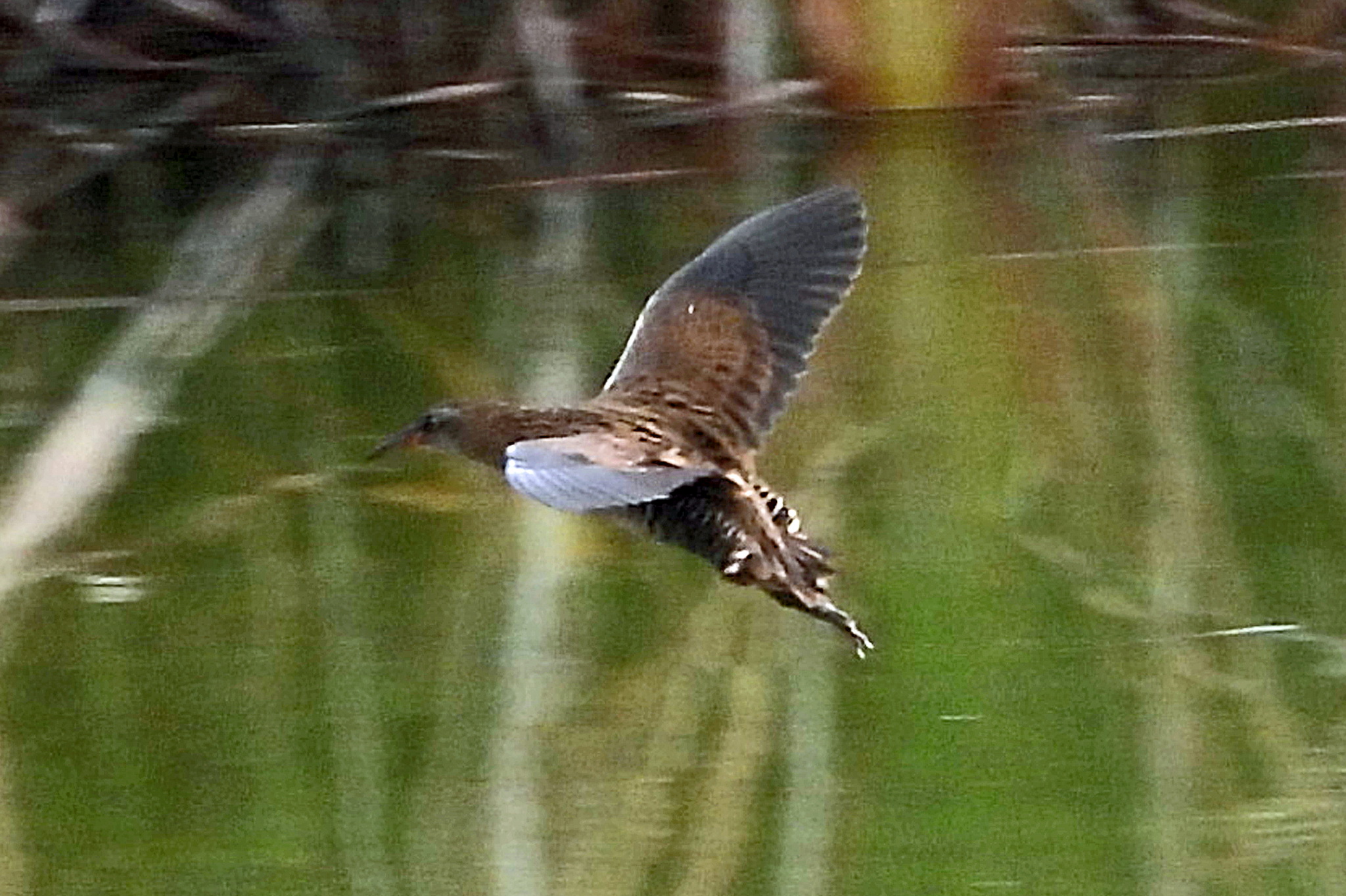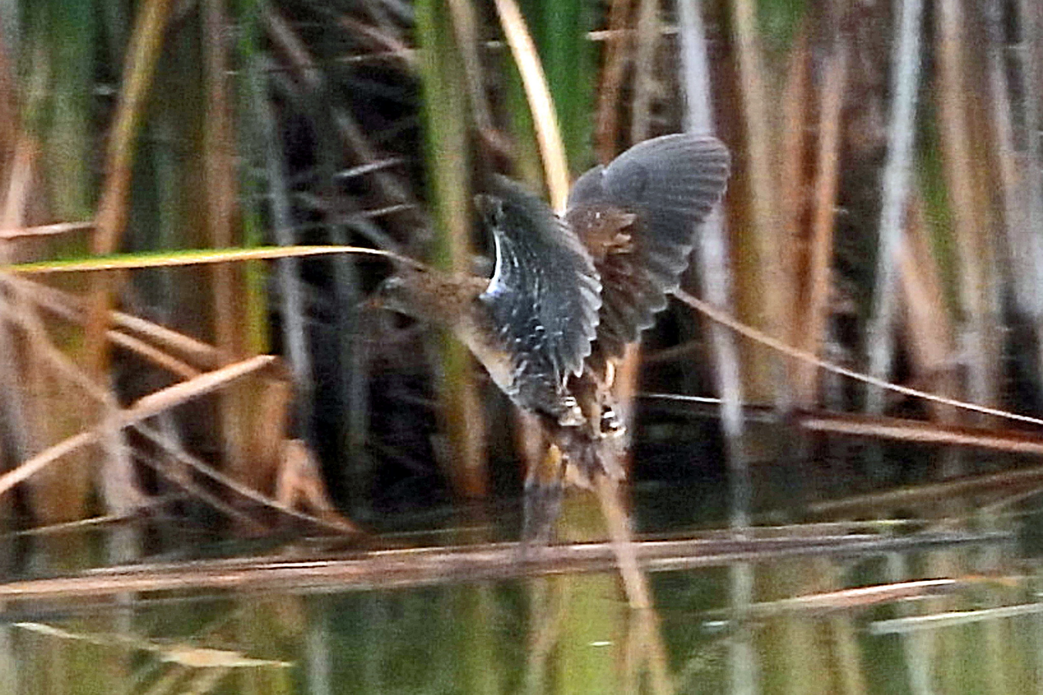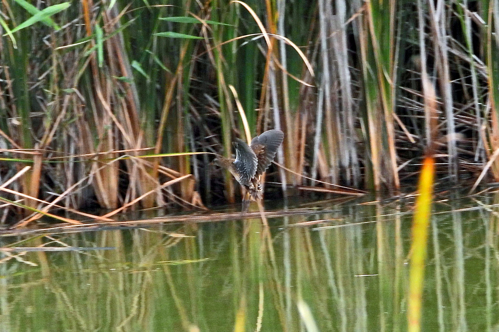 茶色っぽい鳥が水面すれすれを飛んで、葦原の中に消えました。