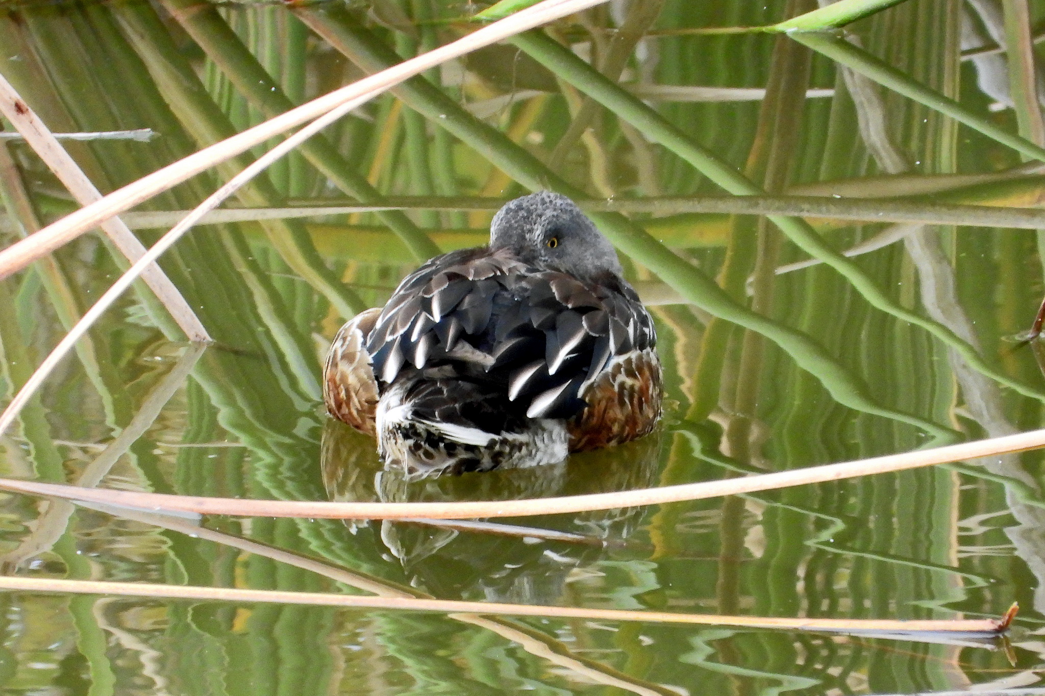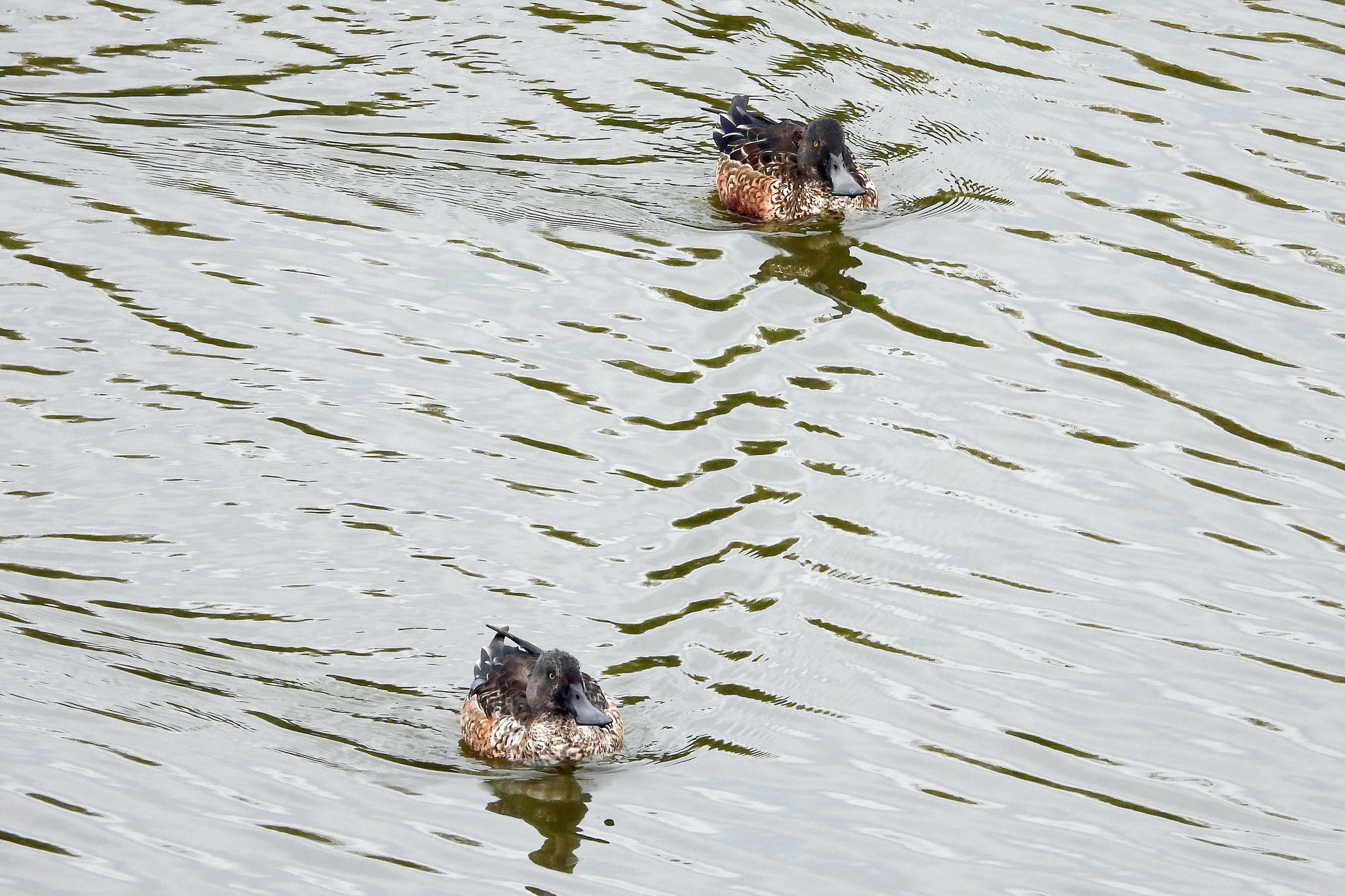 うずくまっていた二羽の「ハシビロガモ」のオスが、