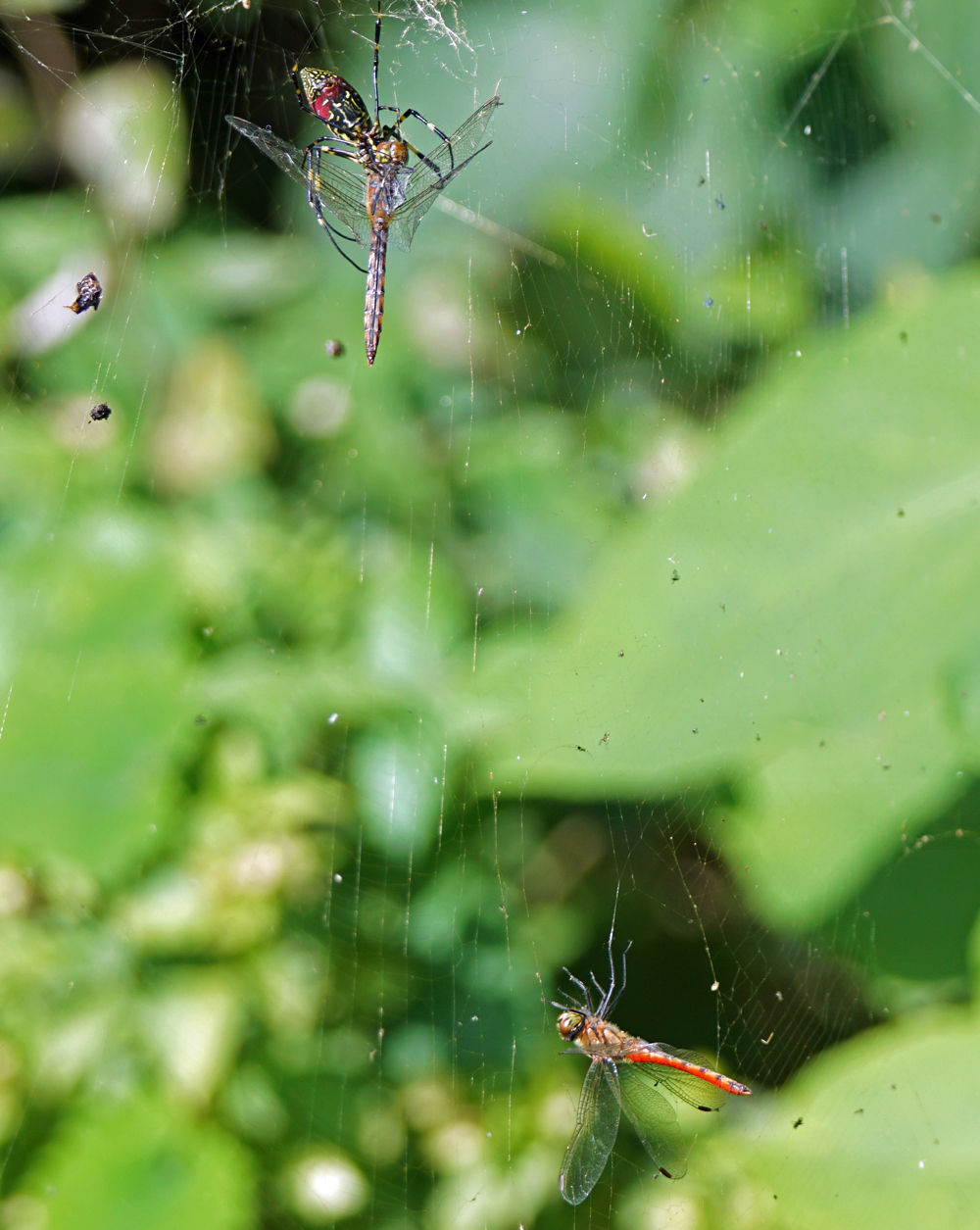 アキアカネが2頭、ジョロウグモの巣に捕まってしまっていました。 何だかかわいそう。