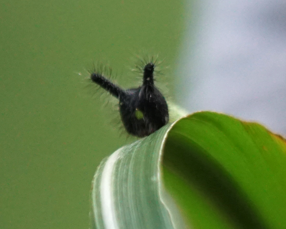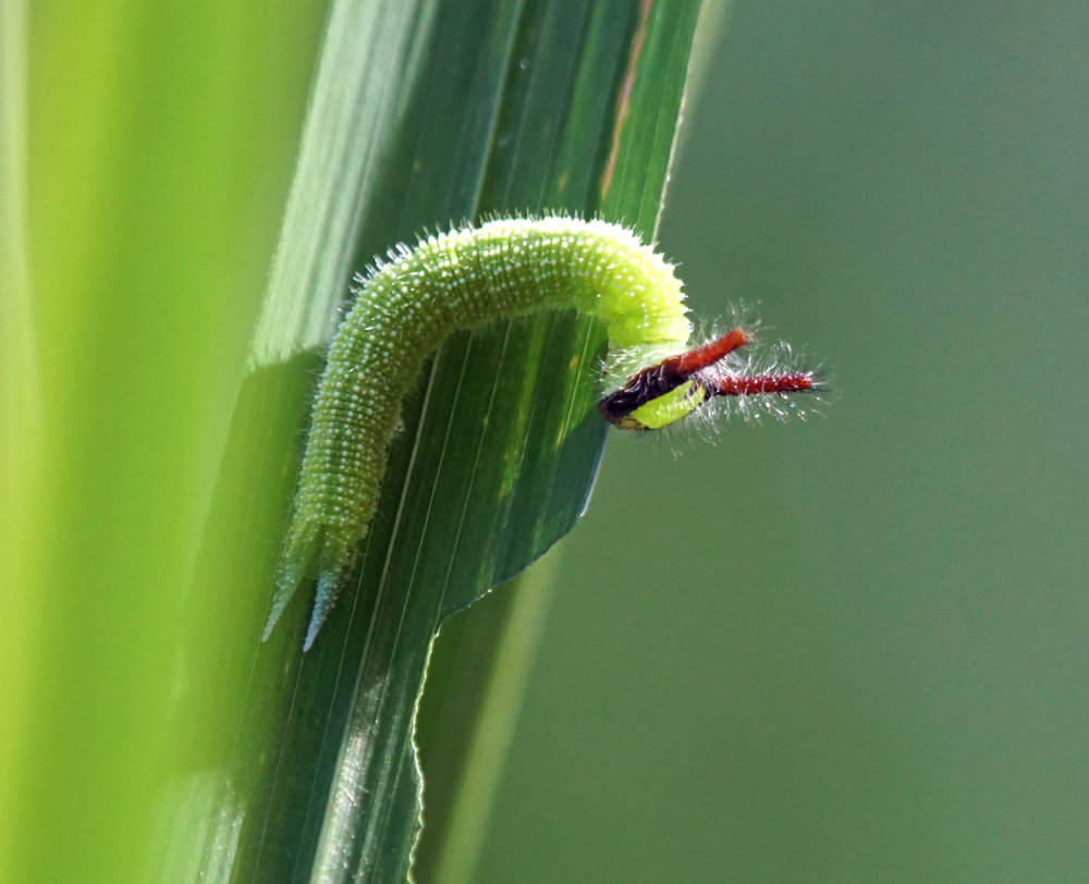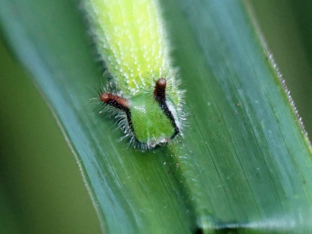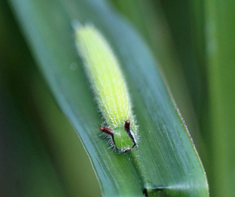 この日のヒットは、クロコノマチョウの幼虫でした。 お仲間がススキの葉に1つ見つけ、その後、