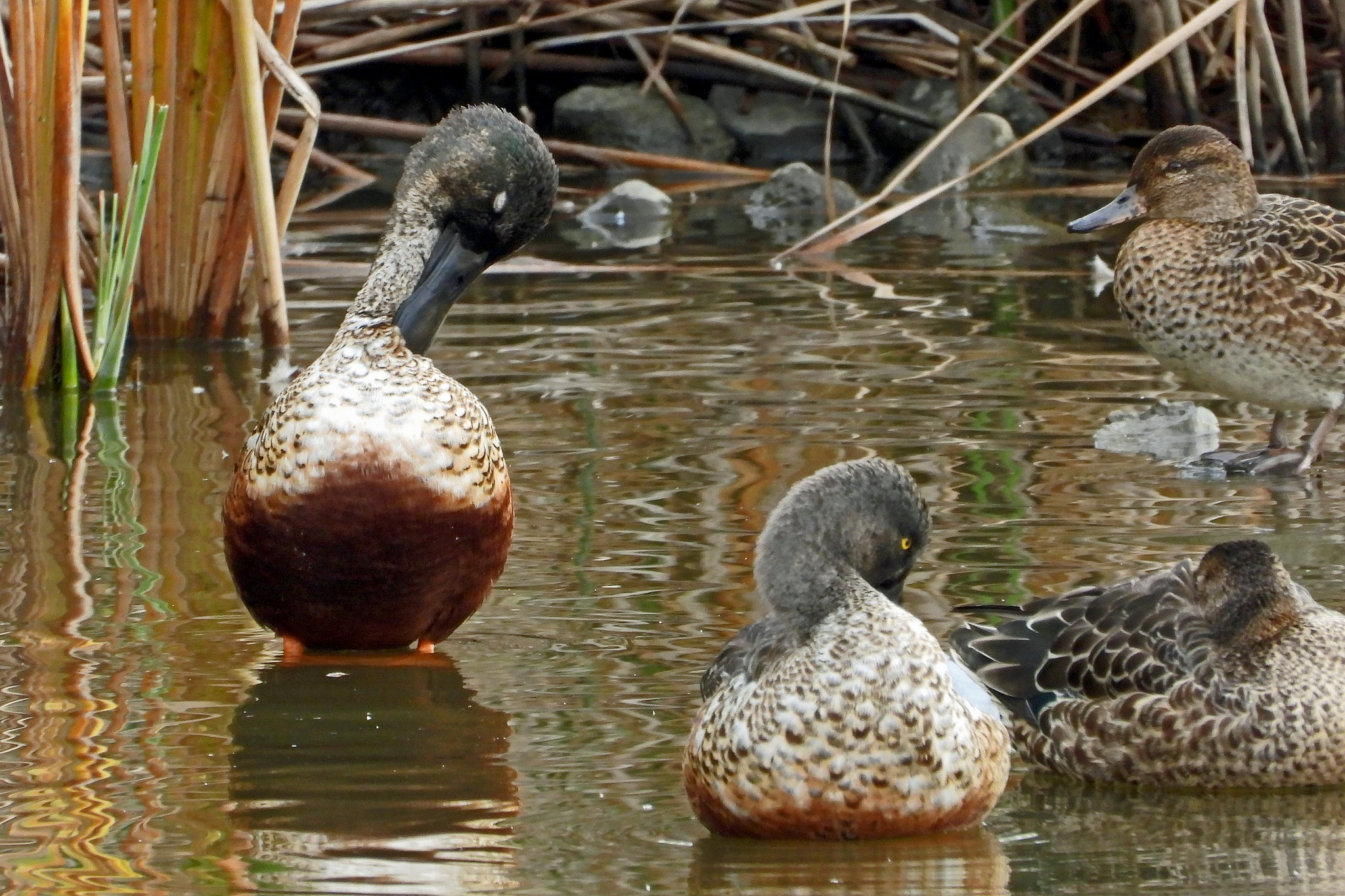 少し離れて、「コガモ」と「ハシビロガモ」が居ました。