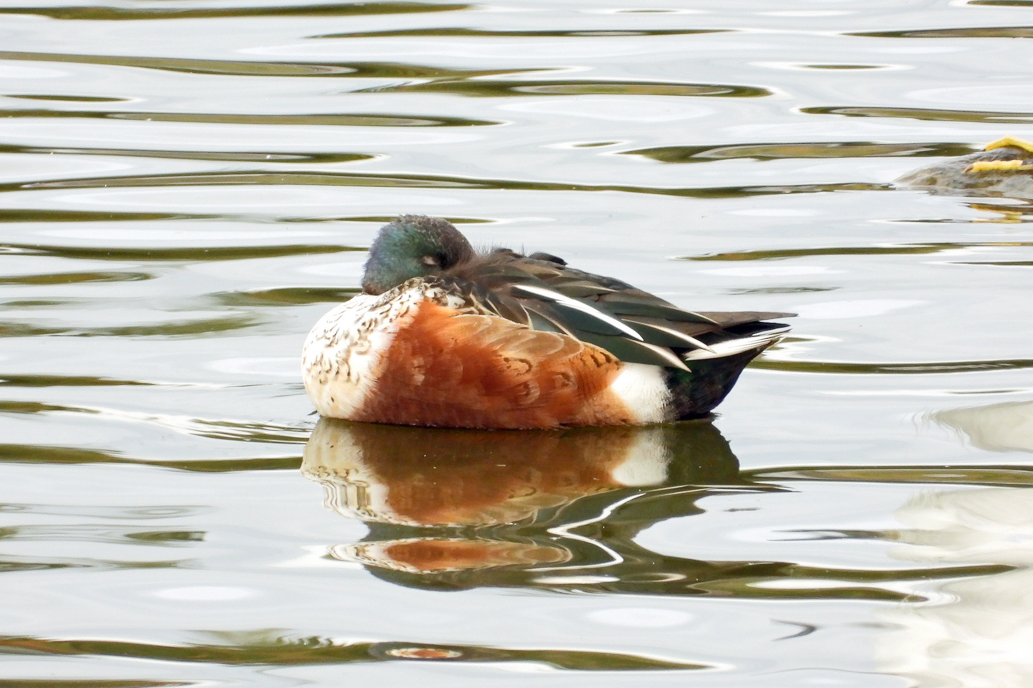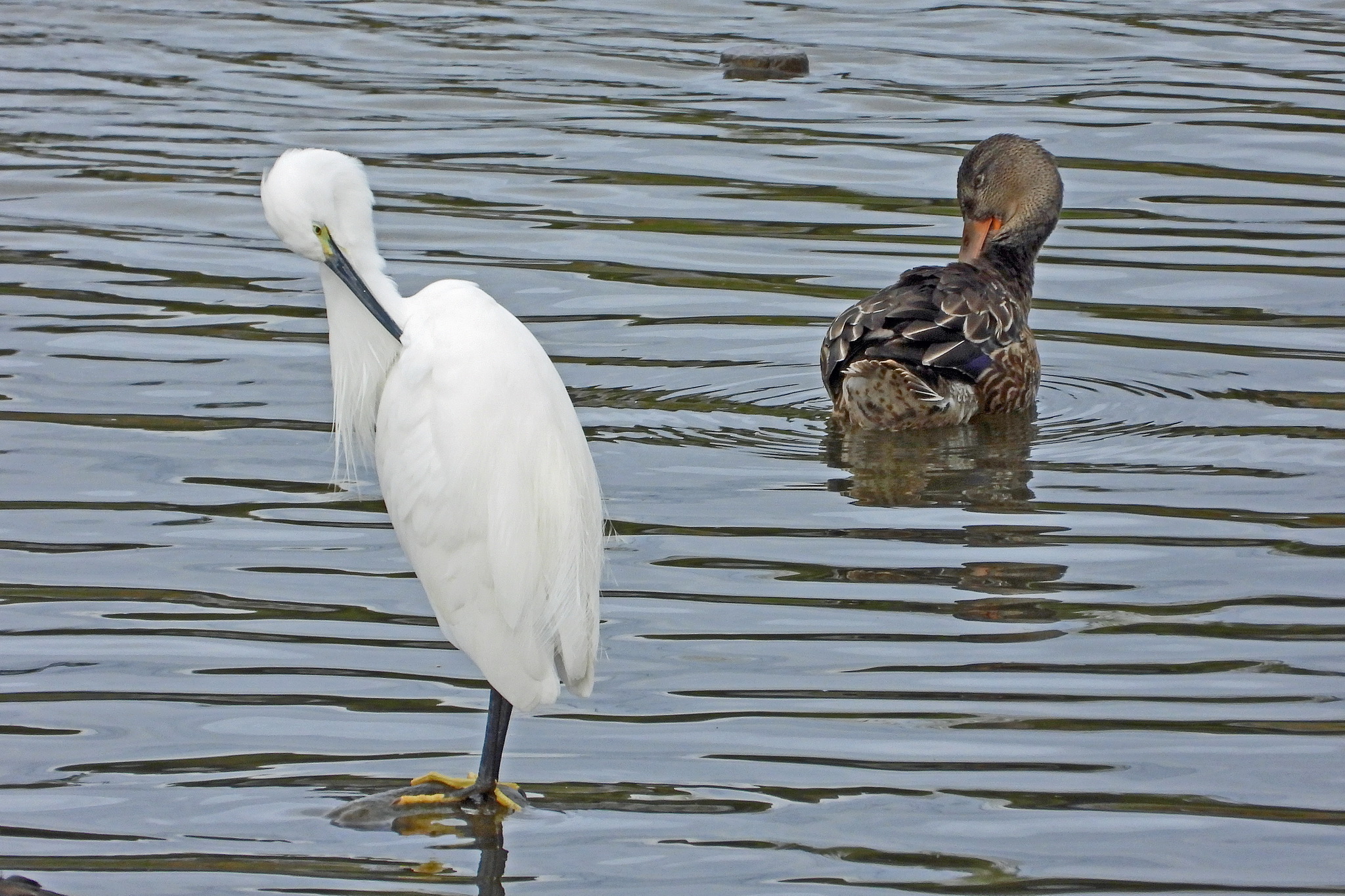 「コサギ」と「ハシビロガモ」が、羽のお手入れ中です。
