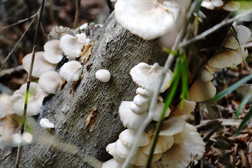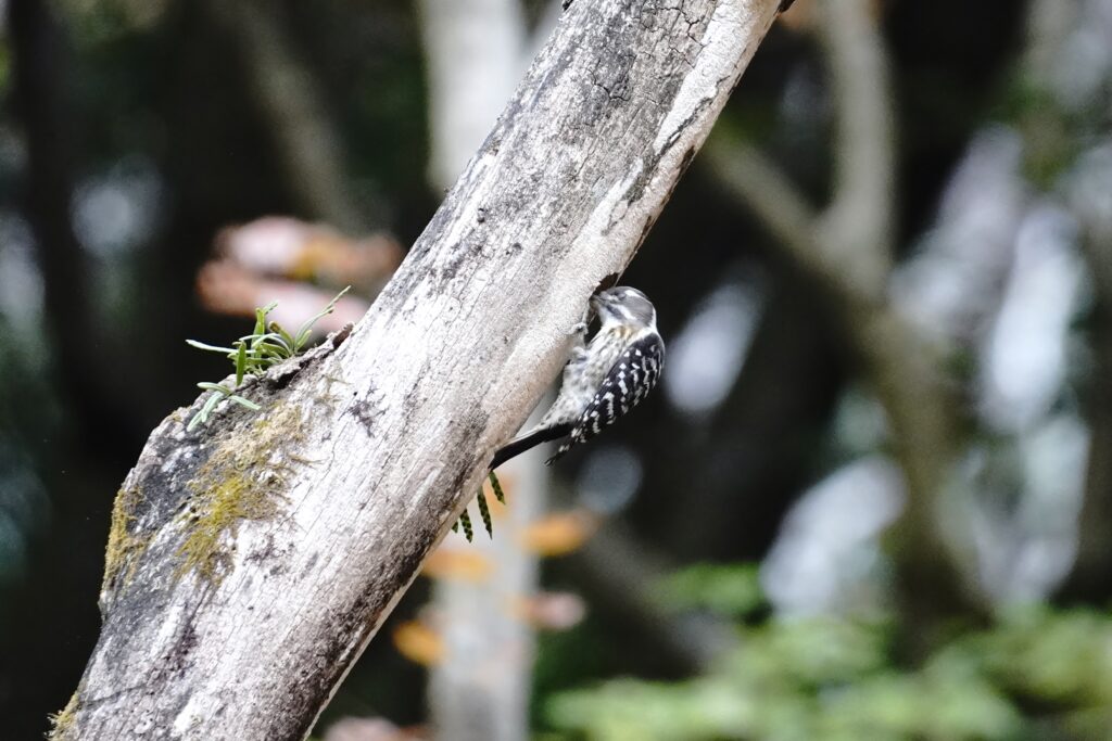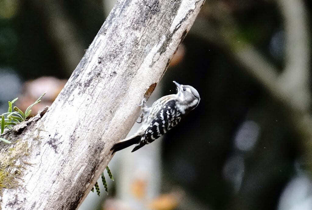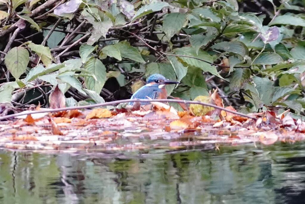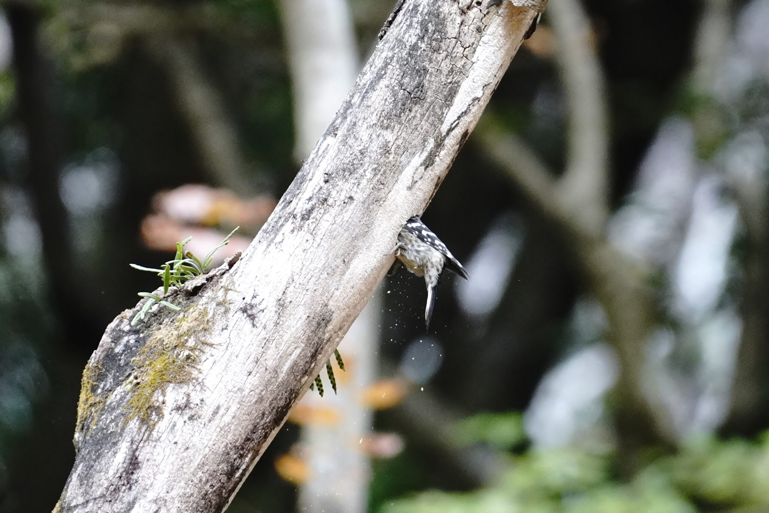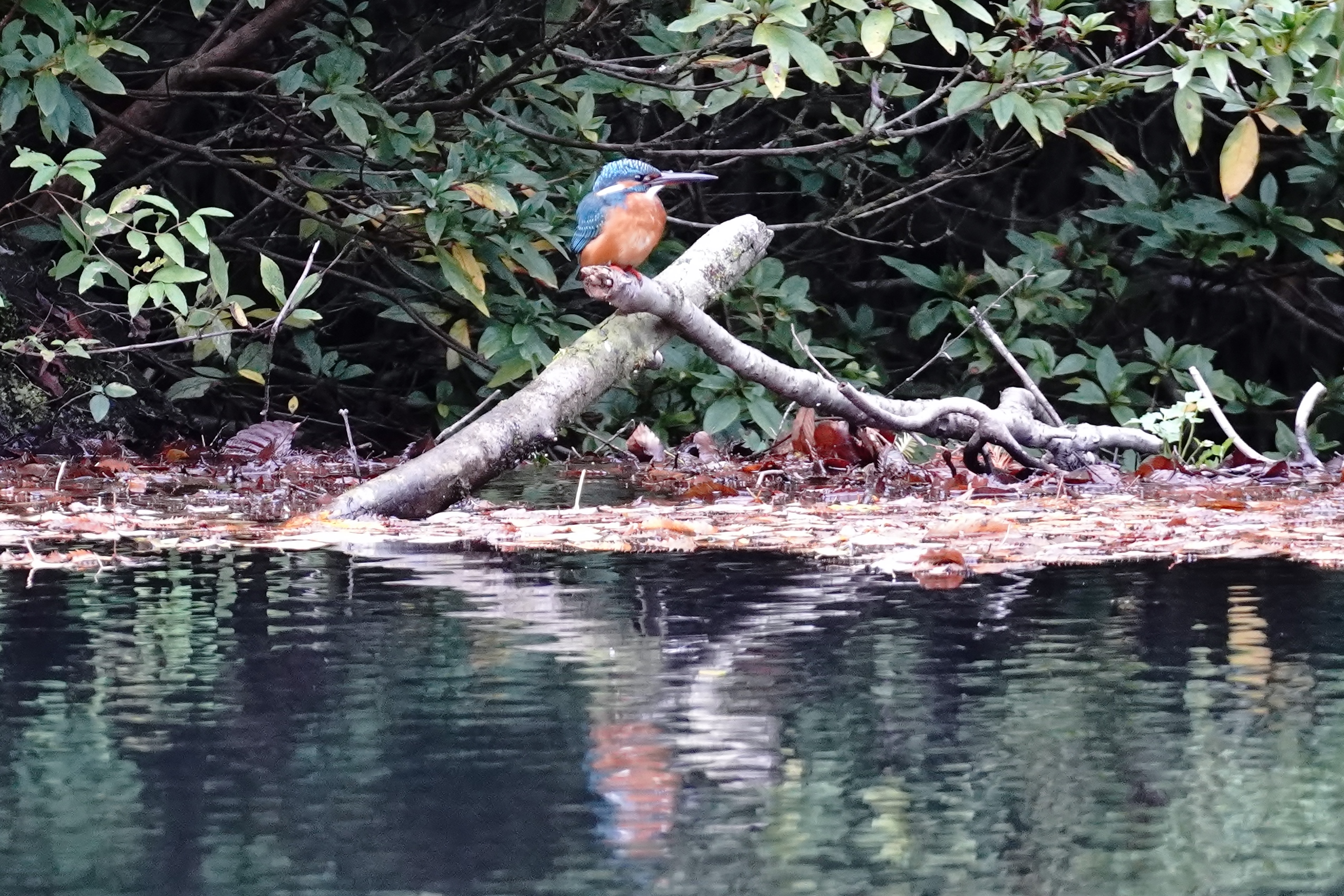 晩秋の趣き濃く紅葉も始まり、カワセミ、コゲラ、ミソサザイや巨大アカガシ、巨大ブナなども観察できました。ここのコゲラは勤勉で複数がコンコンと枯れ木に穴を開ける作業に勤しんでいました。しかし巣作りは主に4月から7月の繁殖期のはずなので、調べたら冬を安全に過ごすためのねぐら作りのようでした。キノコもたくさん見かけ、公園では不思議な青い枝も。楽しい原生の森でした。