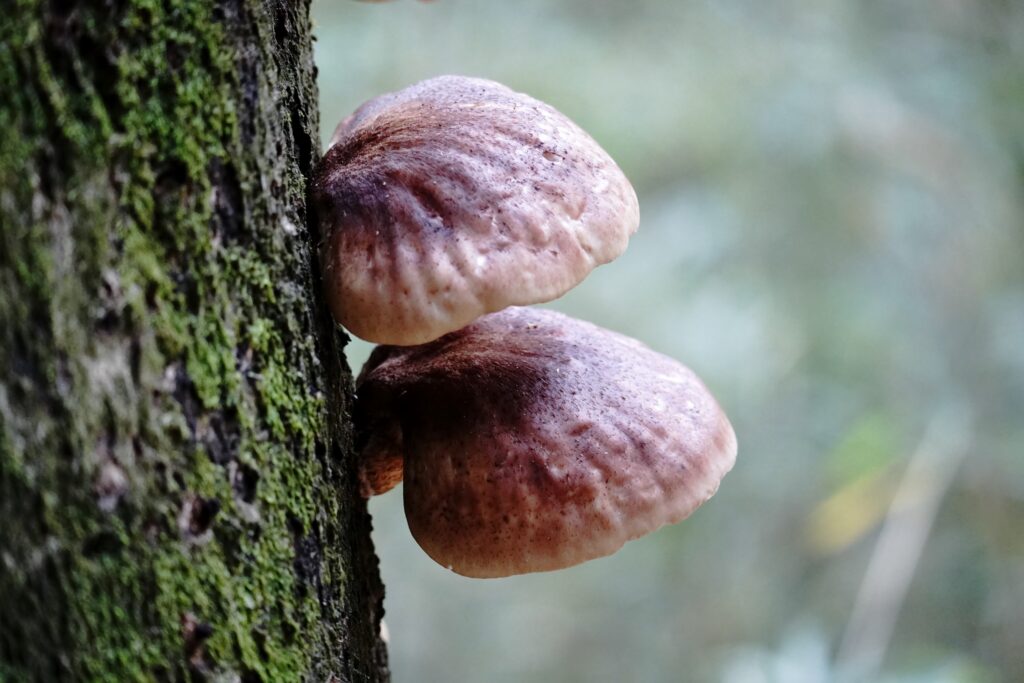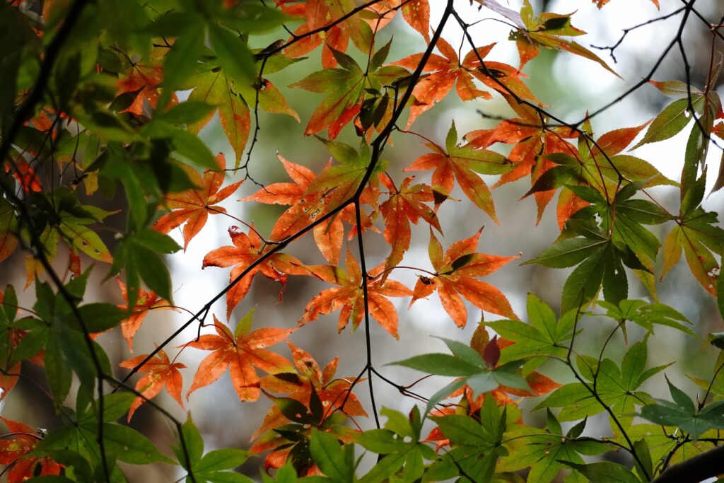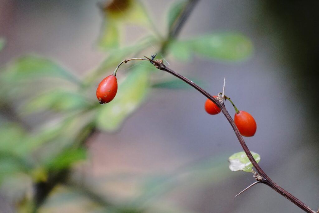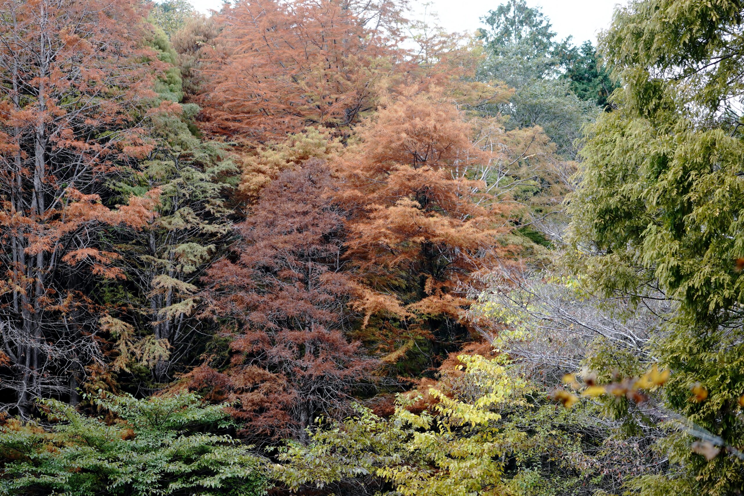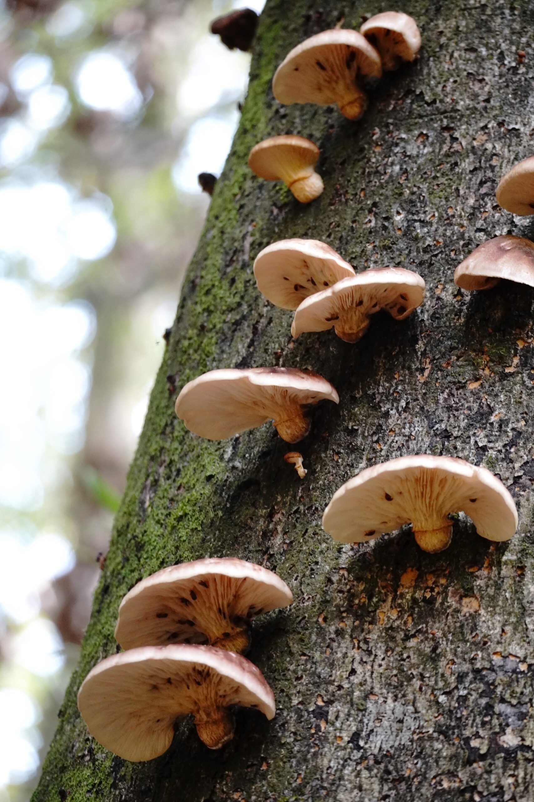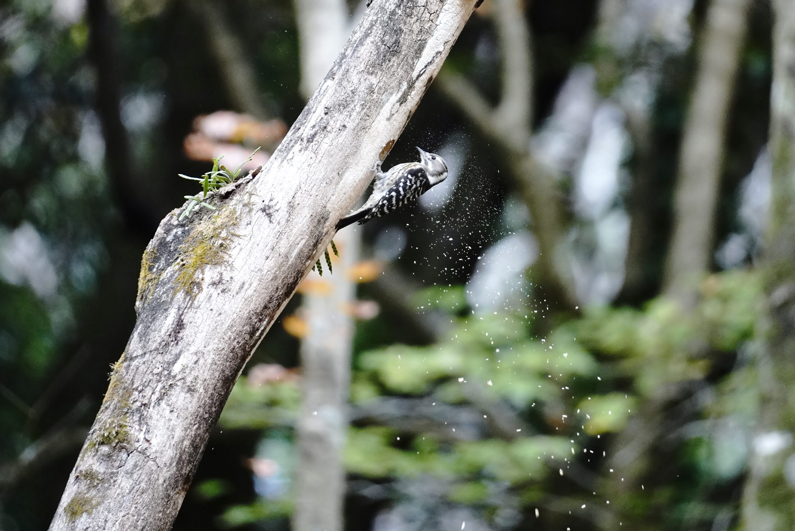 晩秋の趣き濃く紅葉も始まり、カワセミ、コゲラ、ミソサザイや巨大アカガシ、巨大ブナなども観察できました。ここのコゲラは勤勉で複数がコンコンと枯れ木に穴を開ける作業に勤しんでいました。しかし巣作りは主に4月から7月の繁殖期のはずなので、調べたら冬を安全に過ごすためのねぐら作りのようでした。キノコもたくさん見かけ、公園では不思議な青い枝も。楽しい原生の森でした。