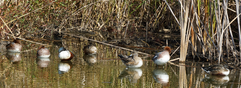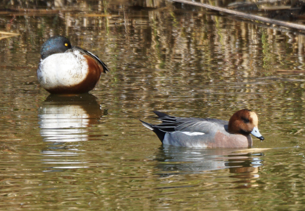 そろそろ終わりにするかな、という時に、ヒドリガモやハシビロガモが比較的近くに並んでいる場所がありました。