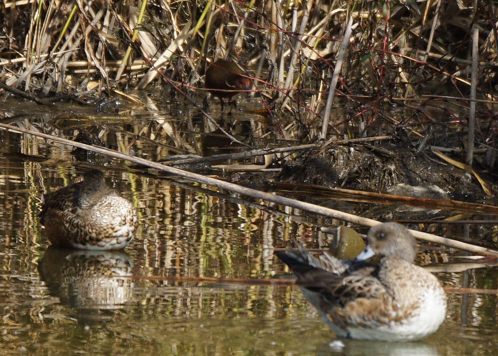 カモたちを見ていると、その奥で何やら動く感じ。よく見ると、ヒクイナが見え隠れしていました。