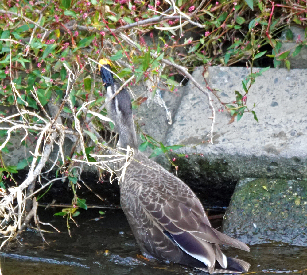 カルガモがグーッと首を伸ばしているので、何をしているのかな、と見ると、川岸のイヌタデを食べていました。