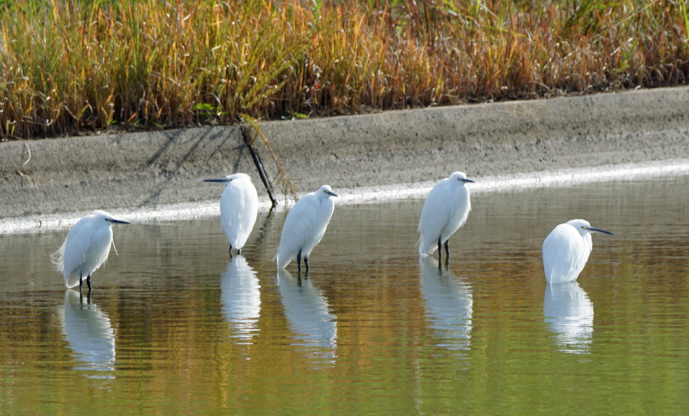 コサギが5羽、並んでじっとしていました。 みんなで一休み?