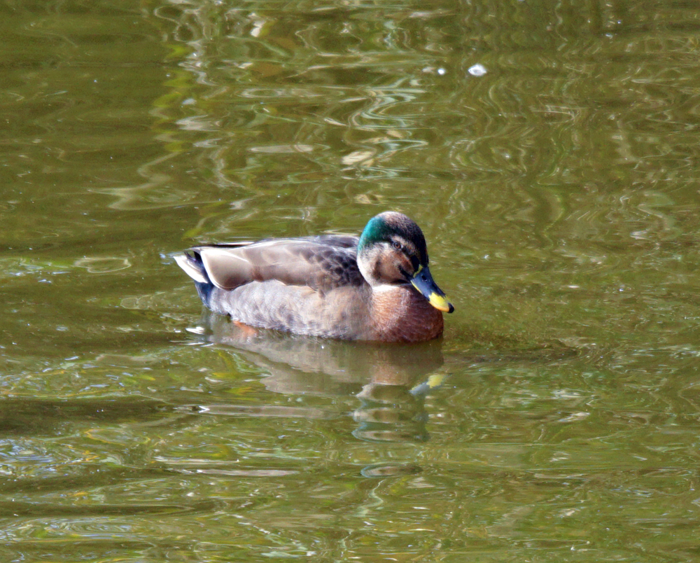 カルガモとマガモの交雑らしい、かなり奇妙なカモも。