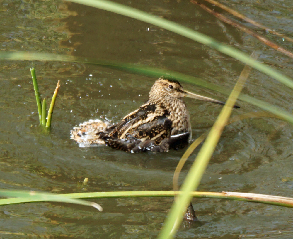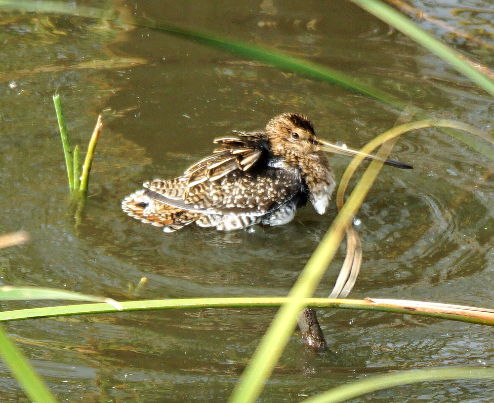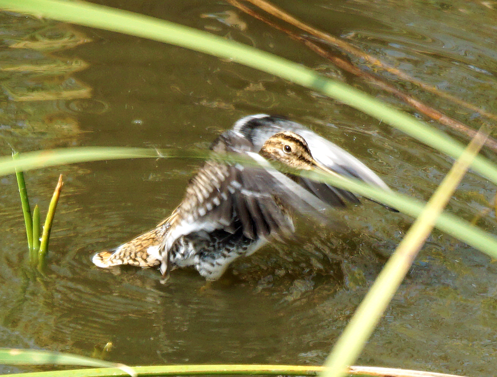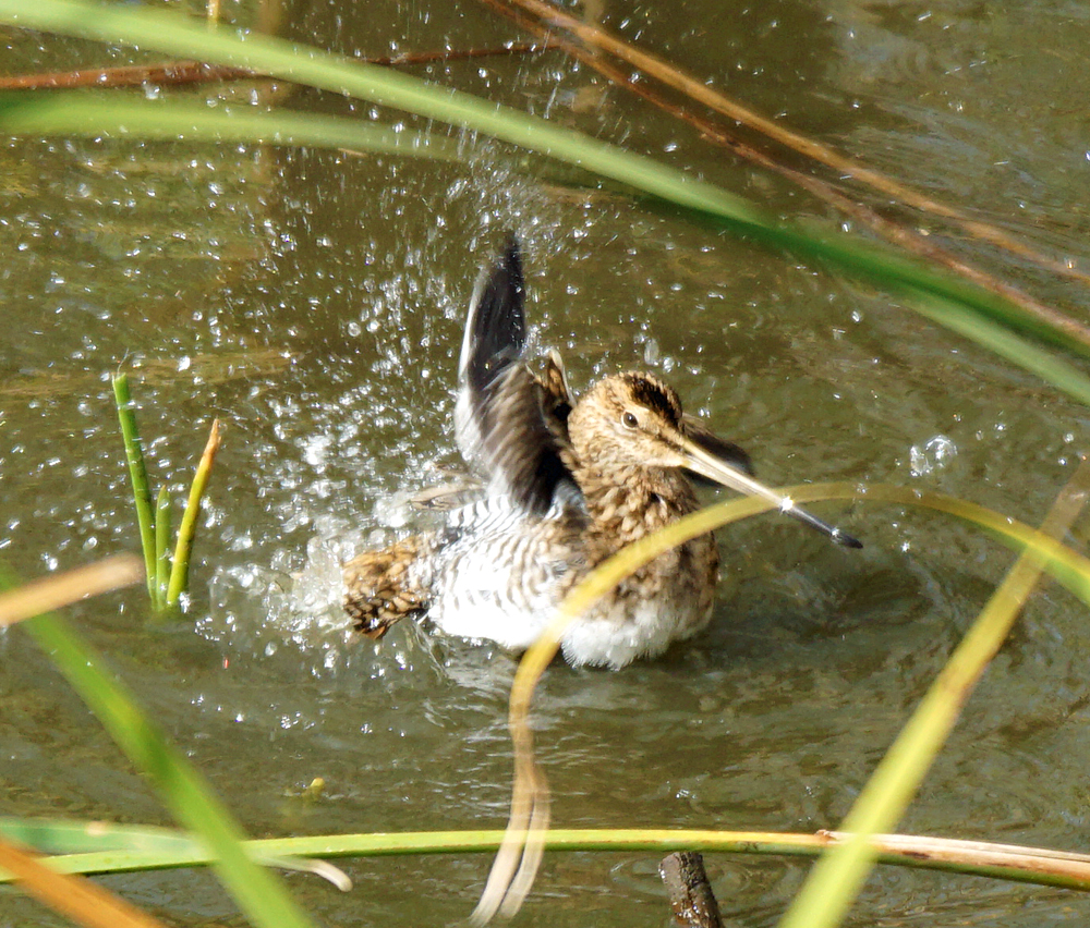キセキレイを見ていると、お仲間が、タシギがいますと・・・。 遊水地の方を見ると、タシギが1羽、水浴びでした。