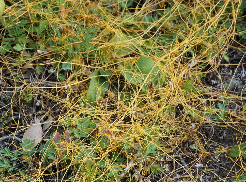 黄色い、細いヒモのような、アメリカネナシカズラ。