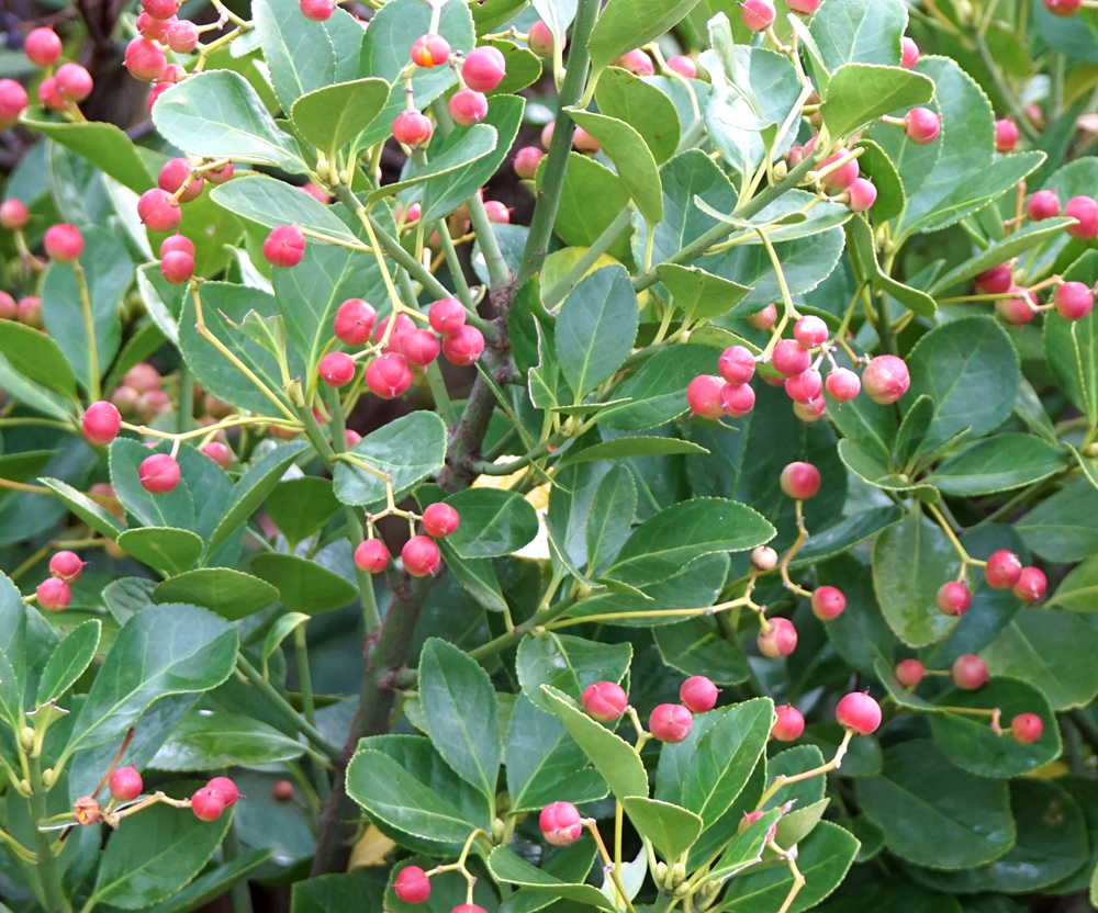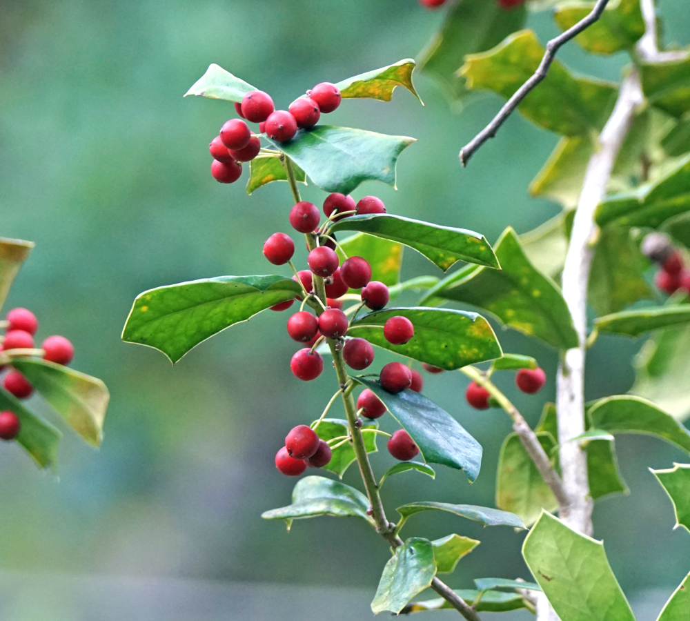 目立たない場所にある、クリスマスホーリー(セイヨウヒイラギ)も実を付けていました。