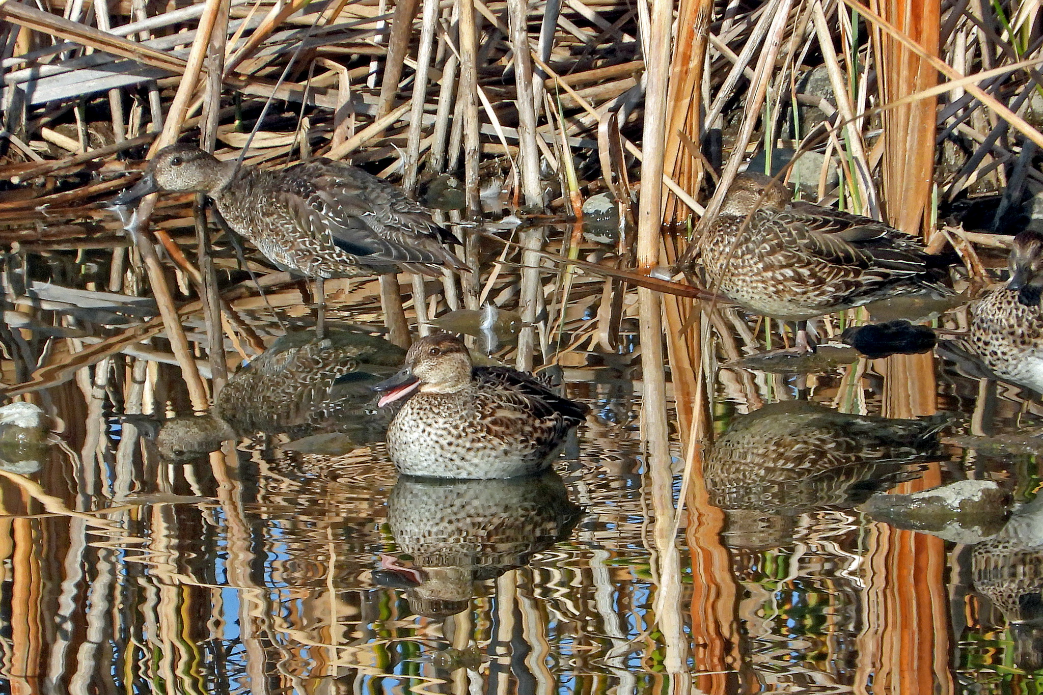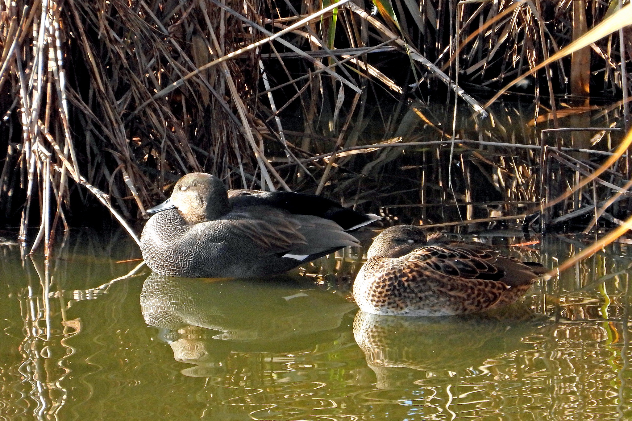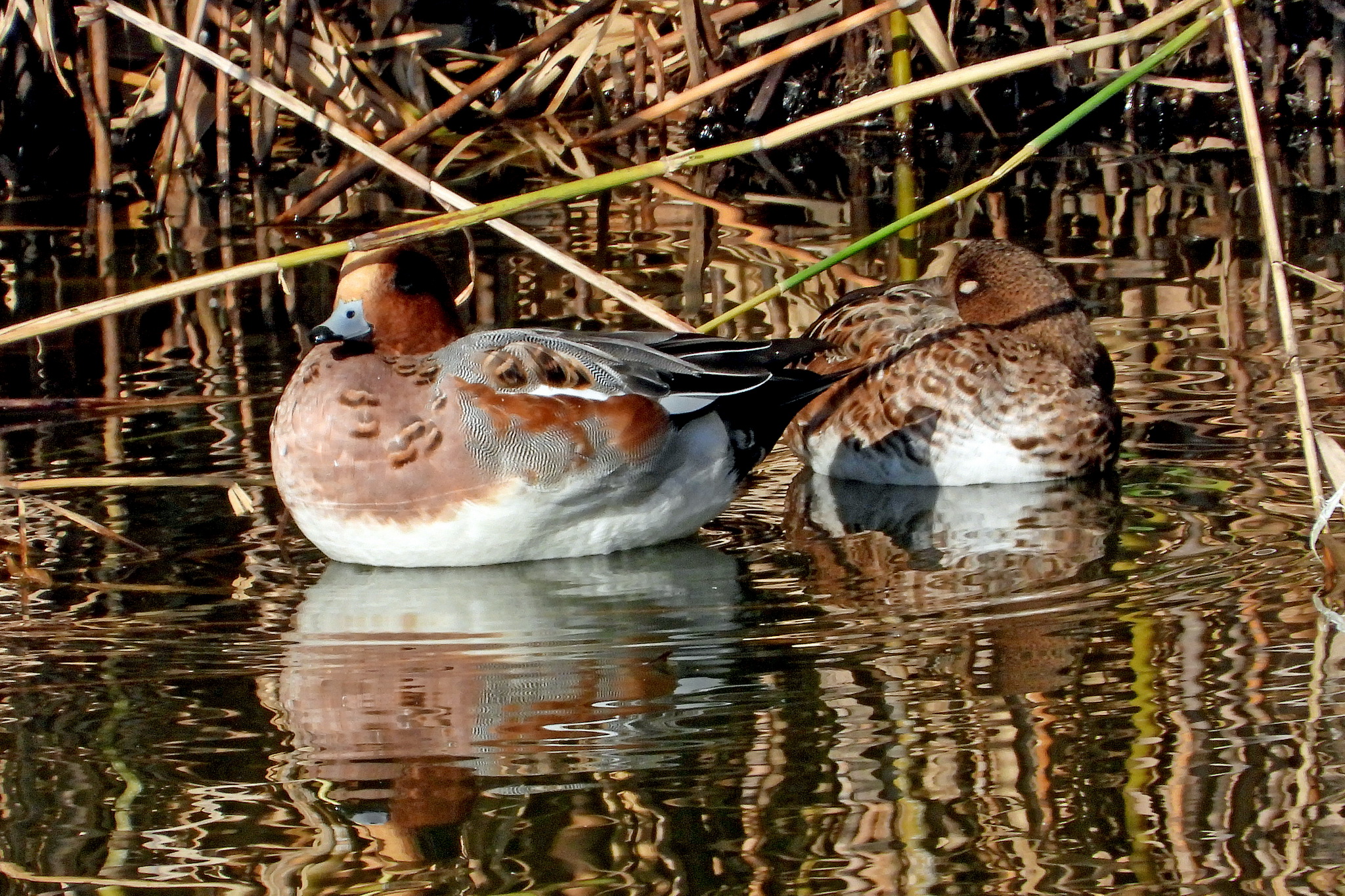 カモたちは早々と朝食を済ませて、葦原の根元で朝寝モードになっているため、