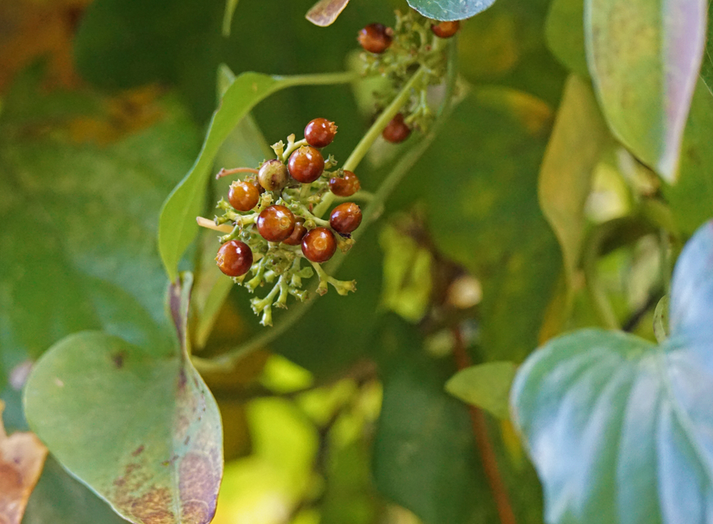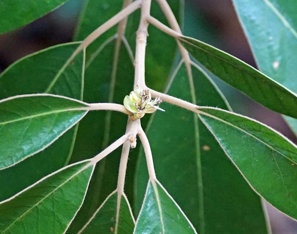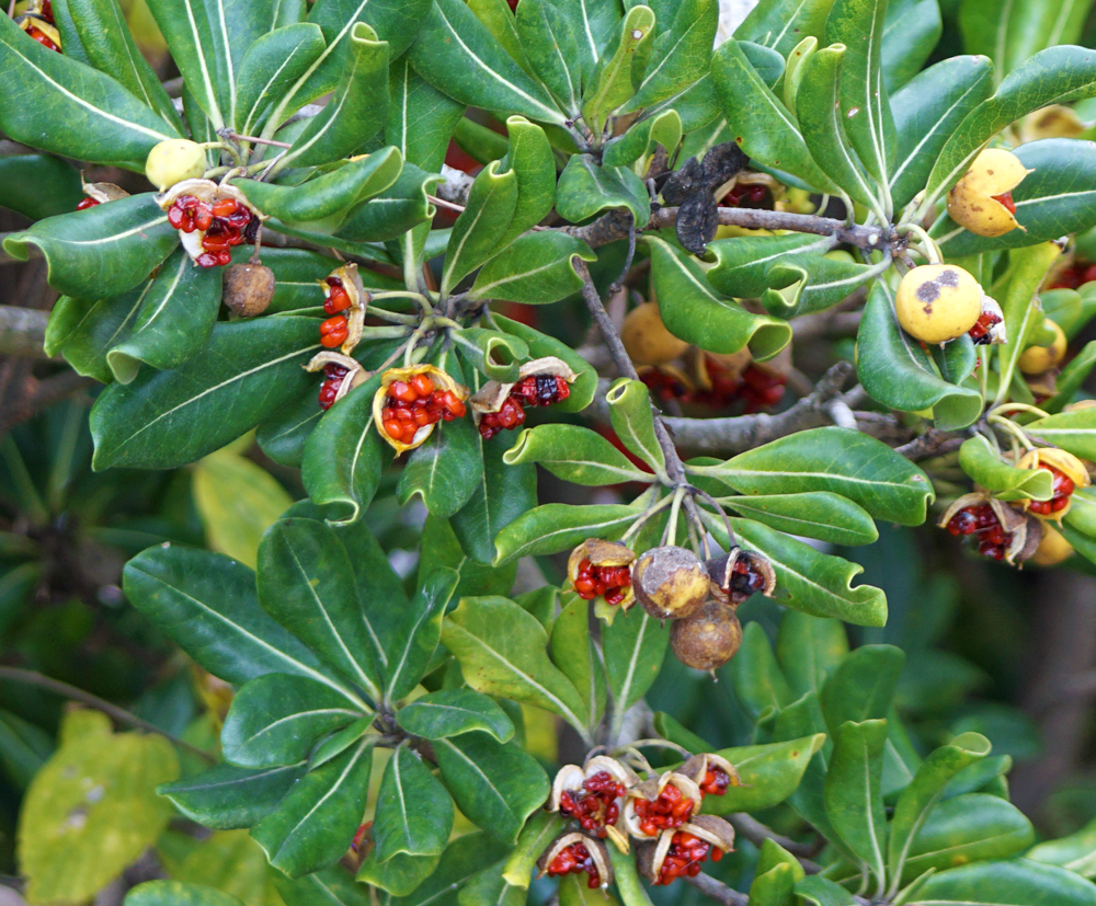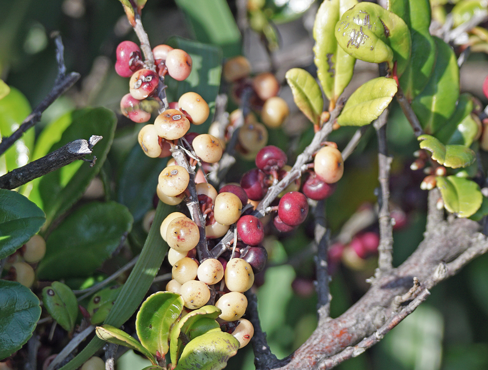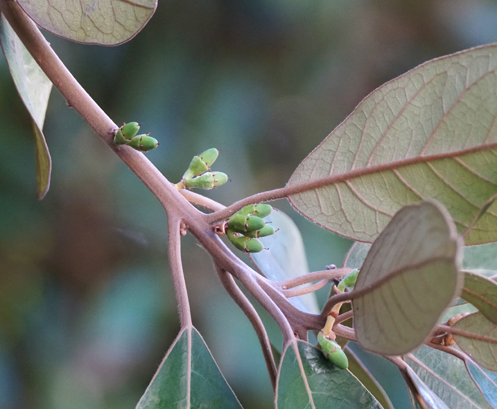 花が残っていたハマビワ。若実を付けた樹も。いままで花や実は見たことがなかったので、