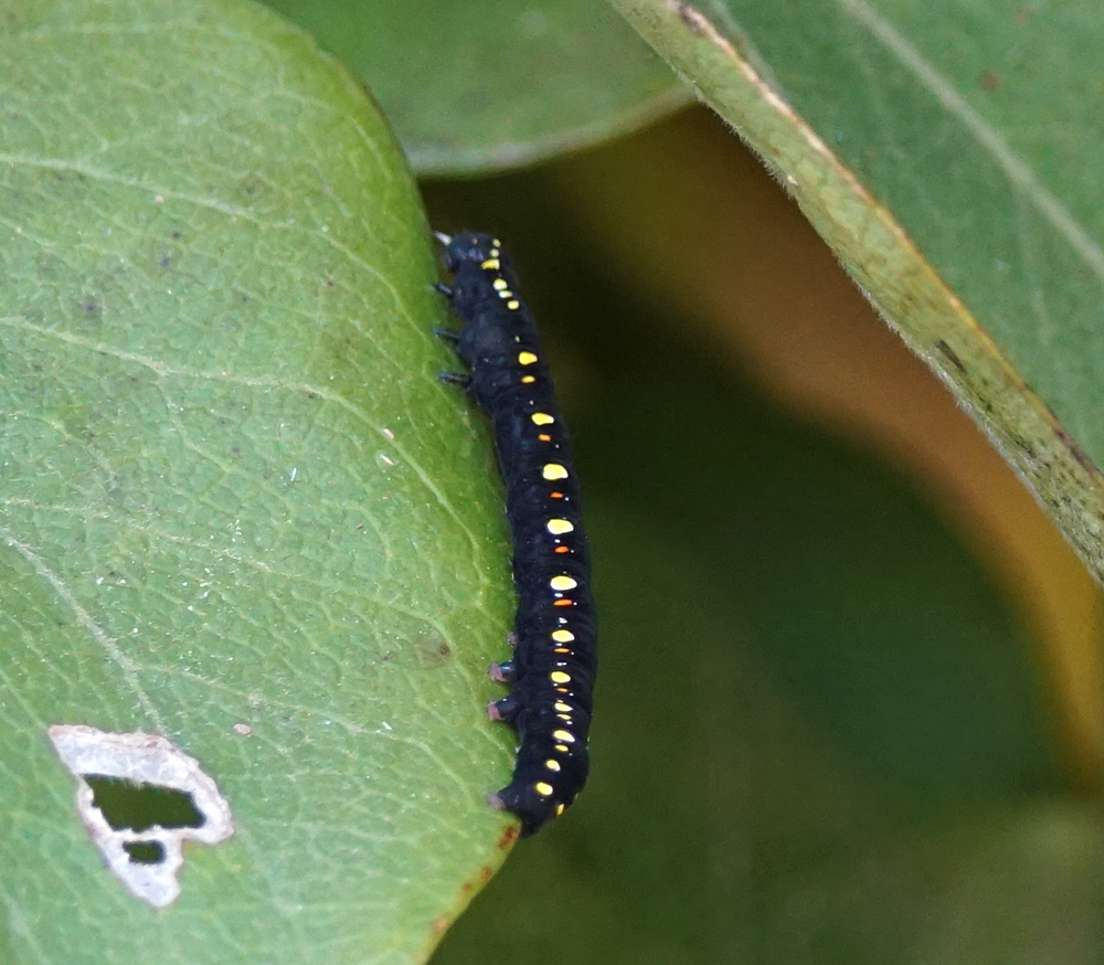 アオツヅラフジの葉に小さな幼虫。 お仲間が、アオツヅラフジが食草の、ヒメエグリバの幼虫、