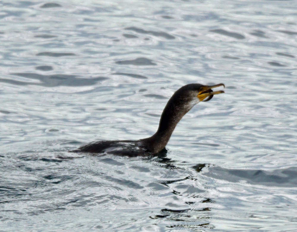 近くを泳いでいたカワウが魚をゲット。振り回しながら食べていました。