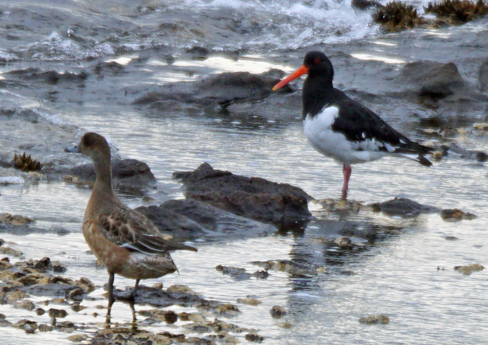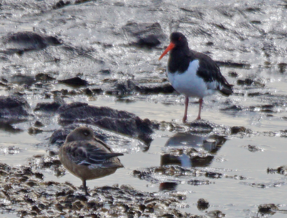 居ないかな、と探すと、ミヤコドリが目に入りました。 すぐ近くにカモっぽい鳥もうずくまっています。